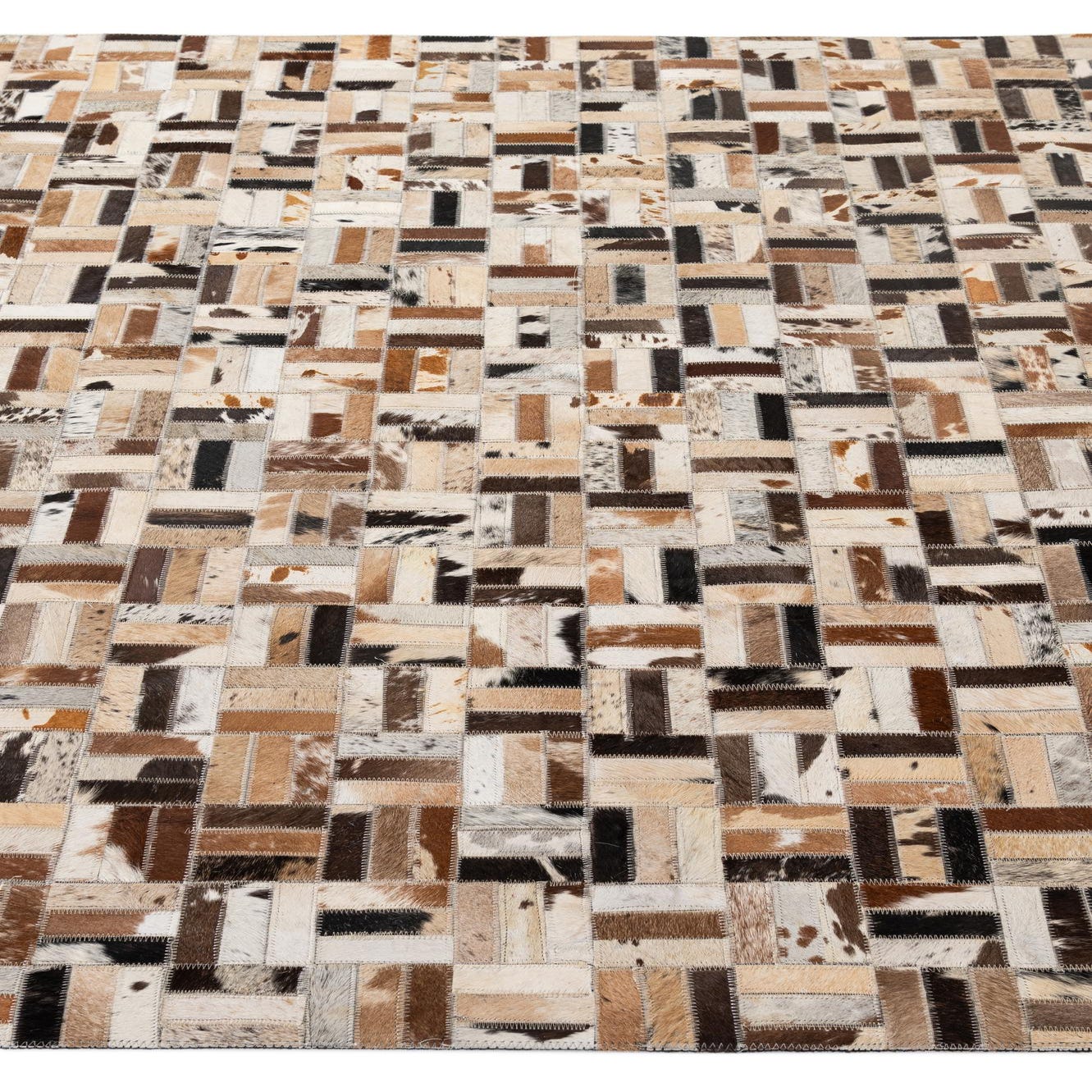 Handmade from cowhide and leather, this patchwork rug arranges hundreds of small rectangular pieces into a tight, basket-weave pattern that balances geometry with natural variation. The multi background blends beige, cream, light brown, brown and black tones; individual hides bring subtle speckles, streaks and tonal shifts that break up the grid and add visual depth without overpowering a room.