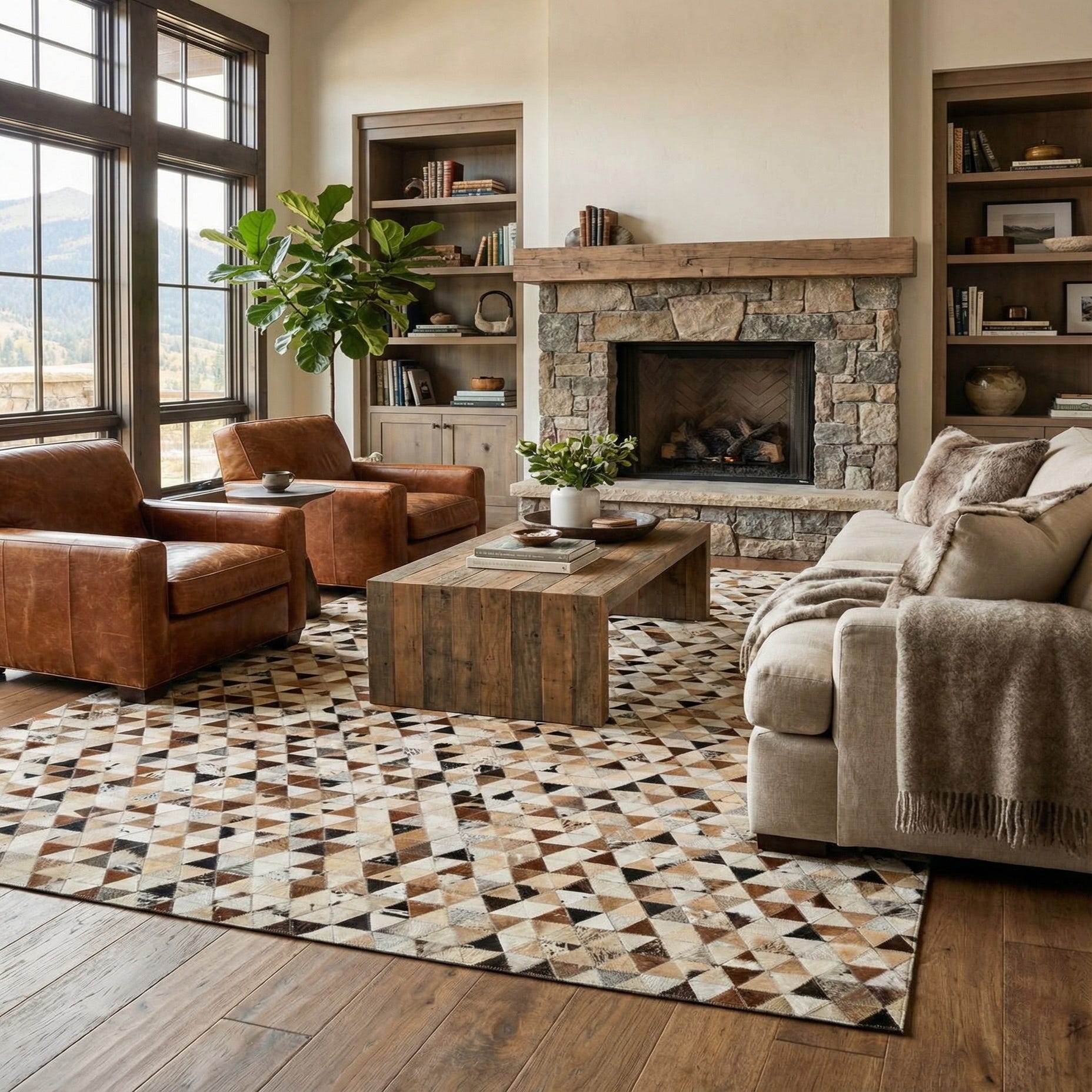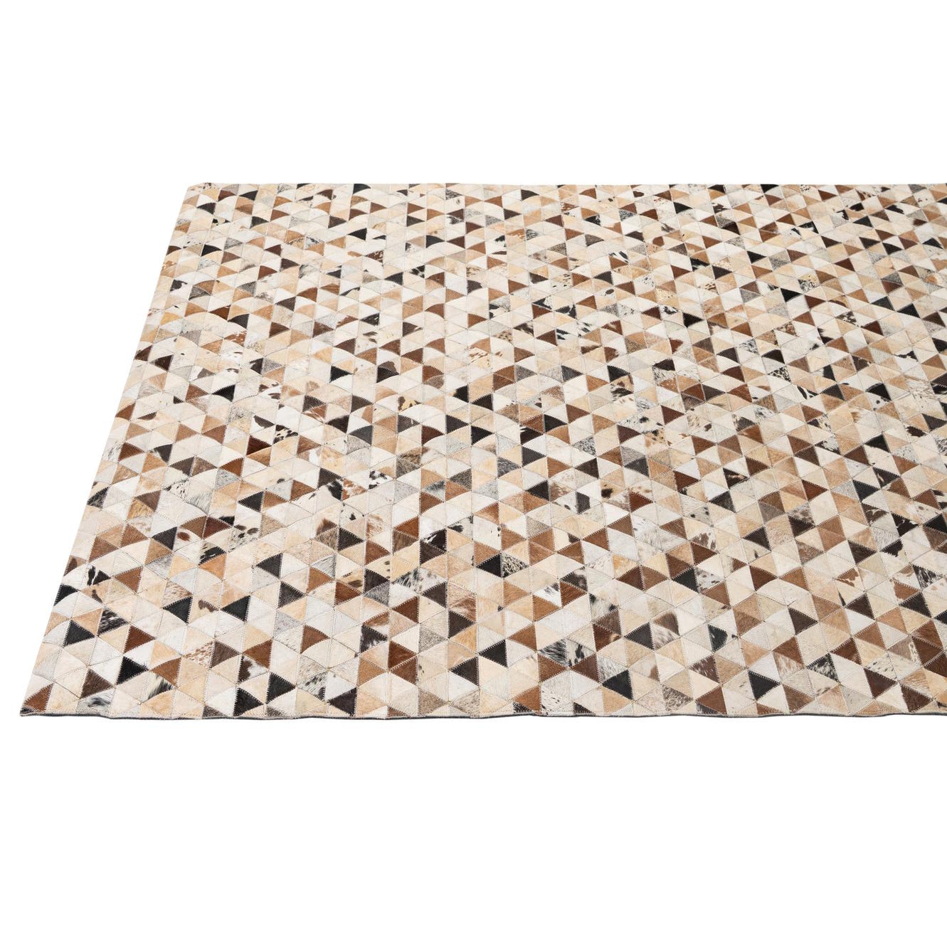 A rectangular 5x8 modern patchwork cowhide rug featuring a geometric pattern of multi-colored triangles in shades of brown, beige, and black.