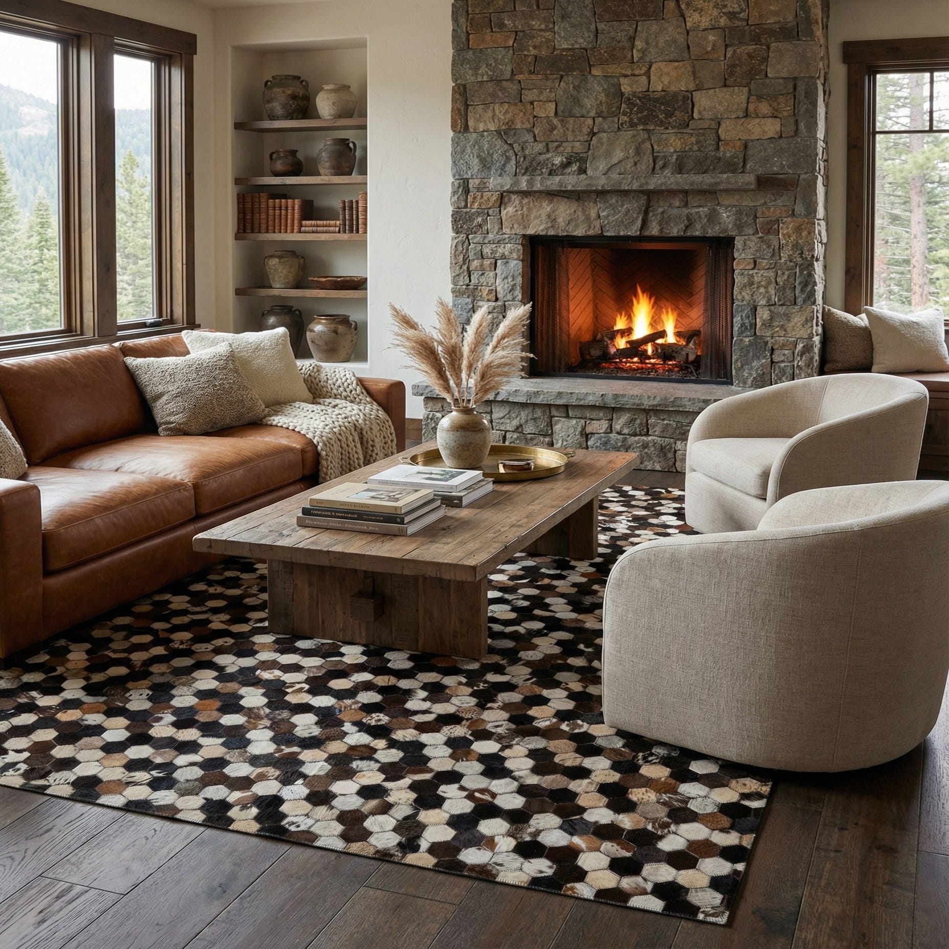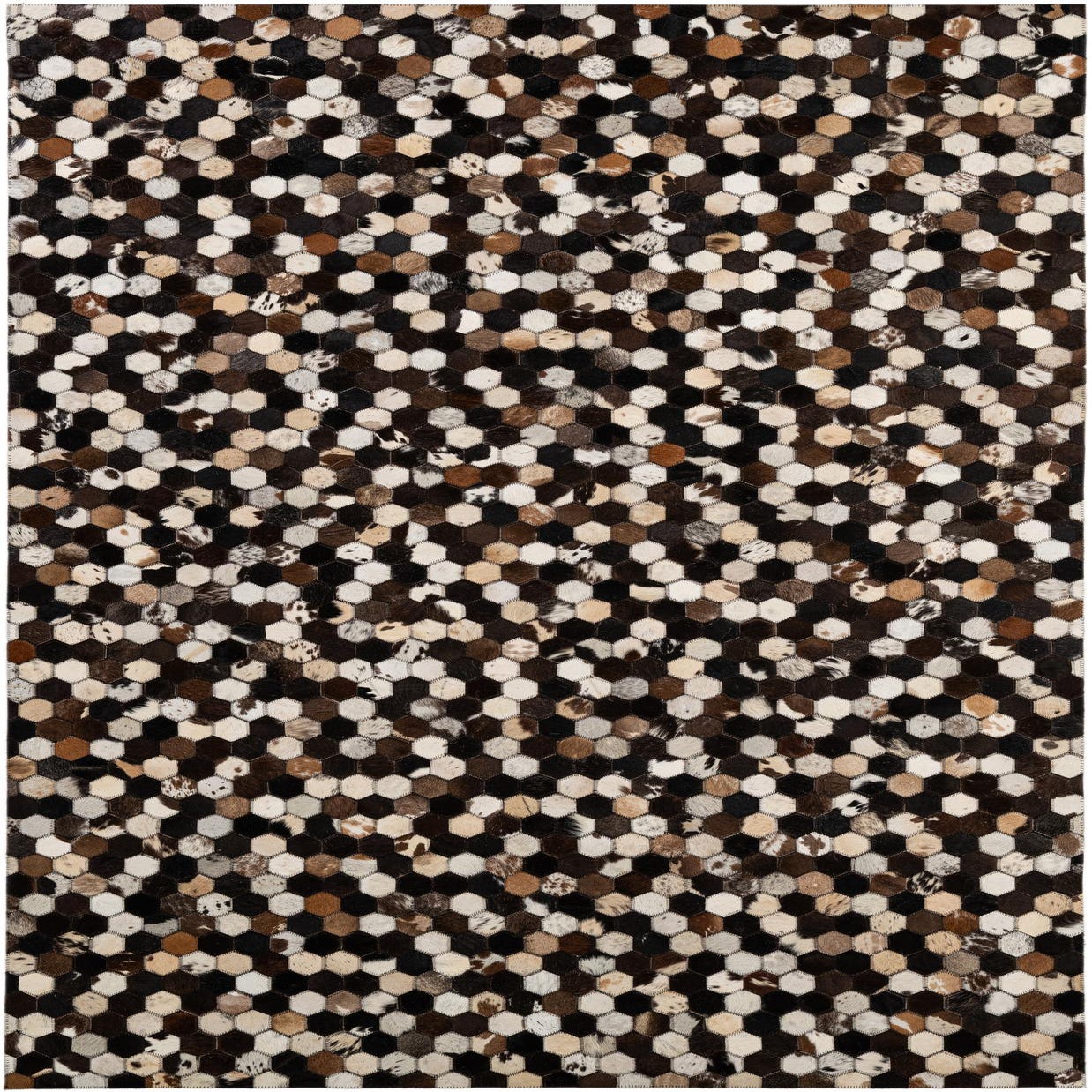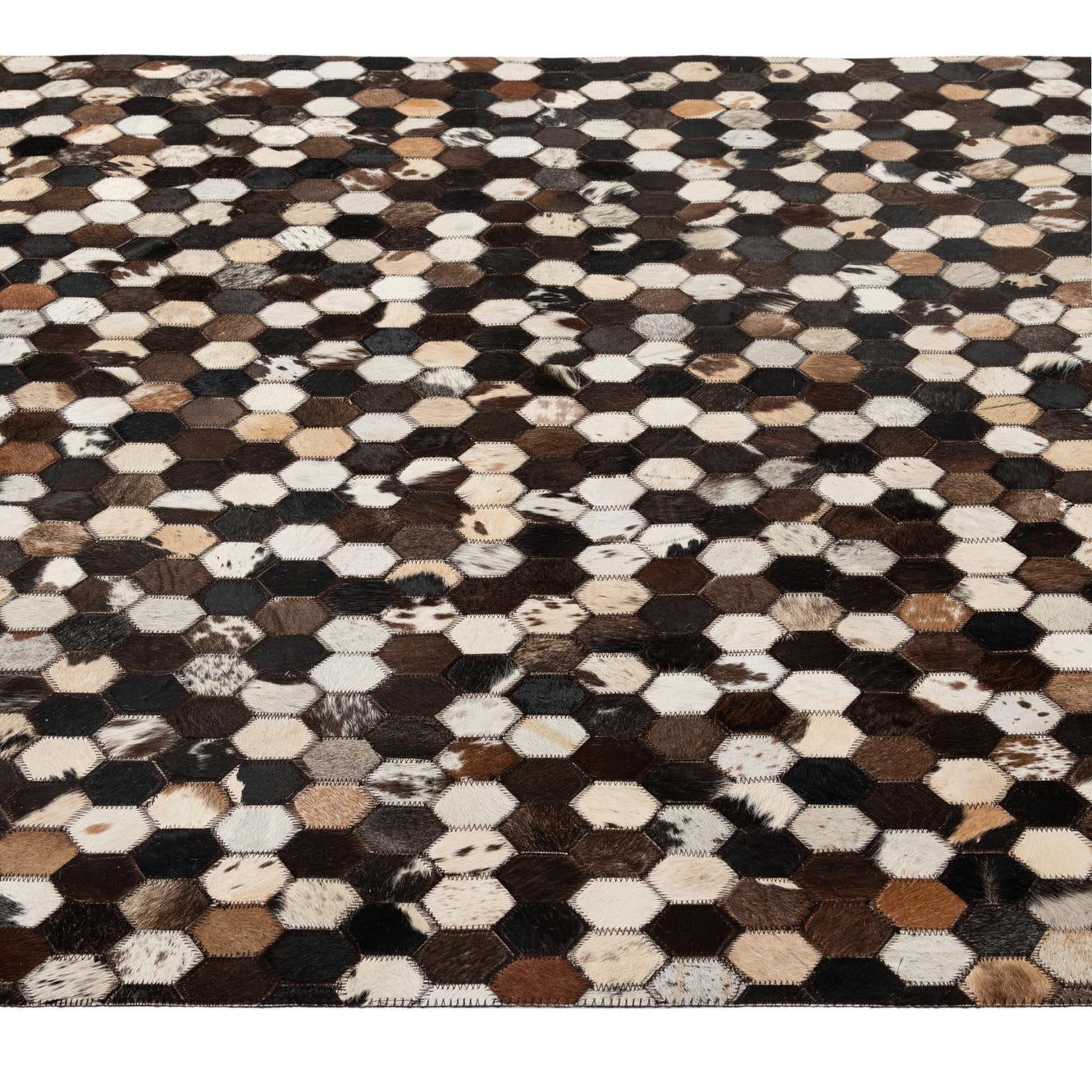 A 5x8 rectangular Cowhide Patchwork rug featuring a modern hexagonal pattern in various shades of brown, black, and white.