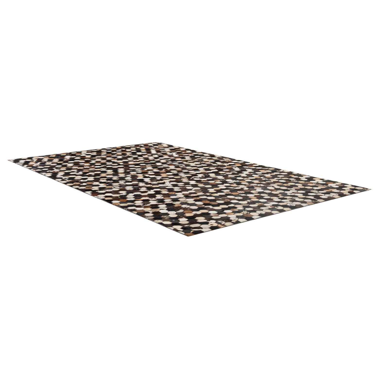 Hand made of cowhide & leather, this patchwork rug arranges small hexagonal tiles into a dense honeycomb pattern that balances repeat geometry with natural variation. The multi background weaves together beige, black, brown, ivory and light brown tones; individual hides introduce subtle mottling and directional hair that catch light differently across the surface. Running a hand across the piece reveals short hair-on-hide with a soft nap and a gentle sheen, while the stitched leather joins give the rug a defined structure and tactile interest.