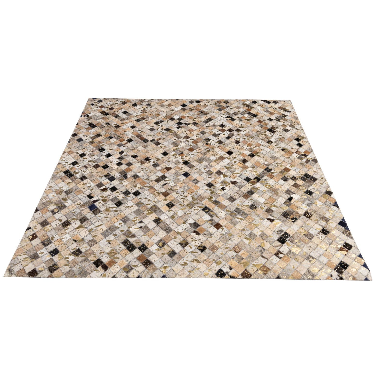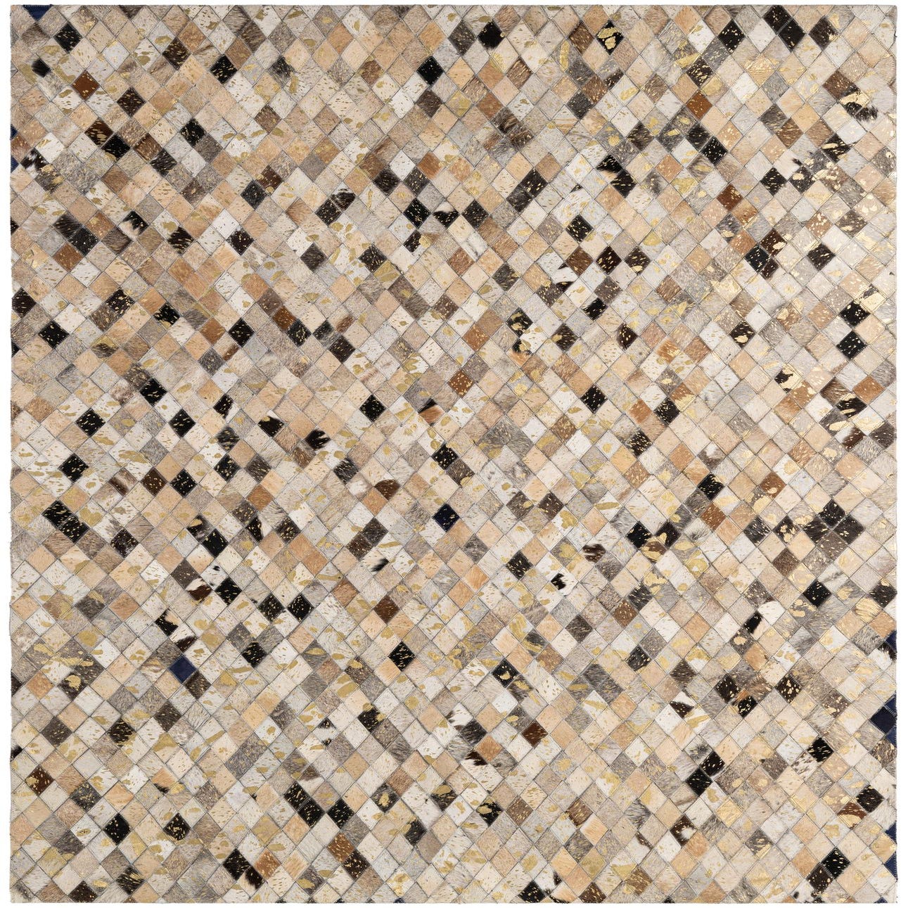 A 5x8 rectangular, multi-colored cowhide rug featuring a modern patchwork diamond pattern with natural brown, black, white, and gold-flecked leather pieces.