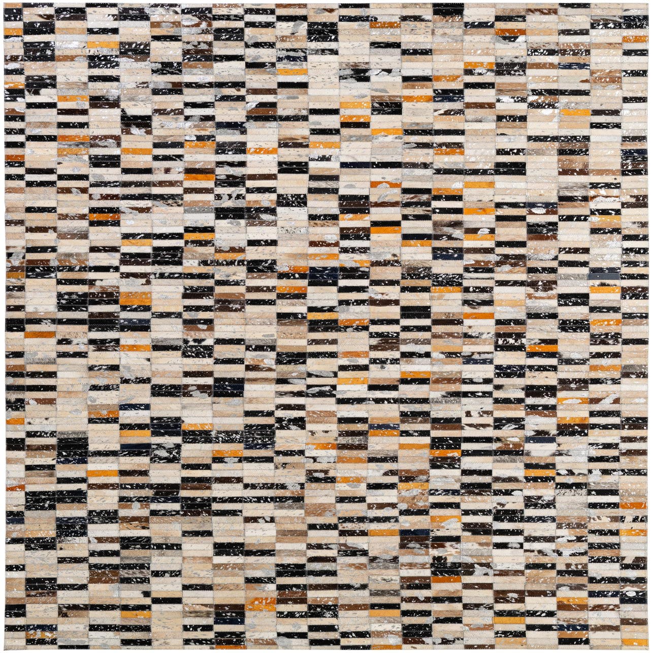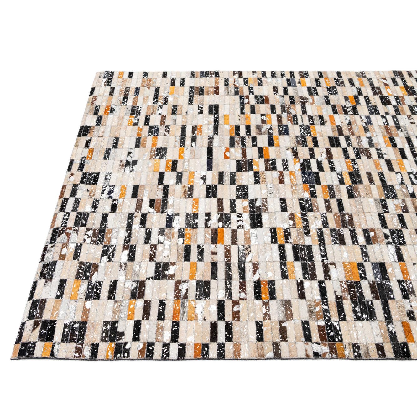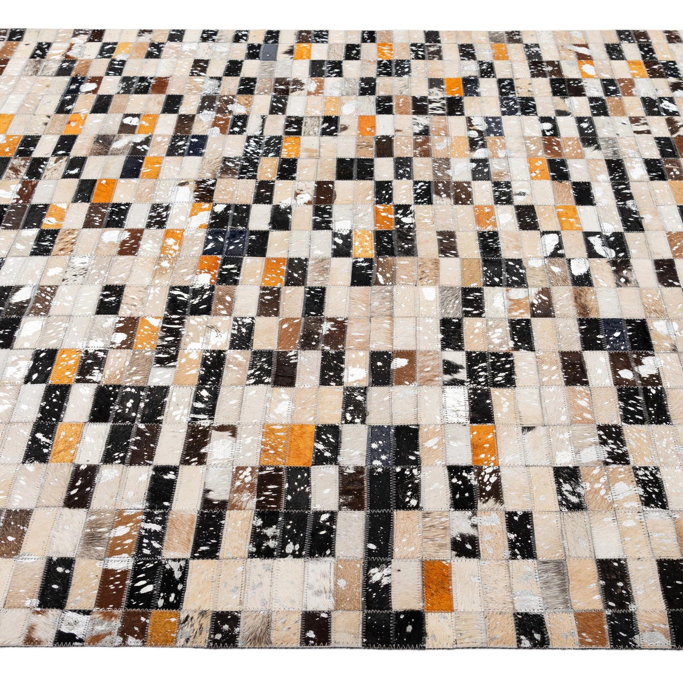 A rectangular 5x8 multi-colored patchwork cowhide rug, featuring a modern pattern of black, white, brown, and orange squares and rectangles.