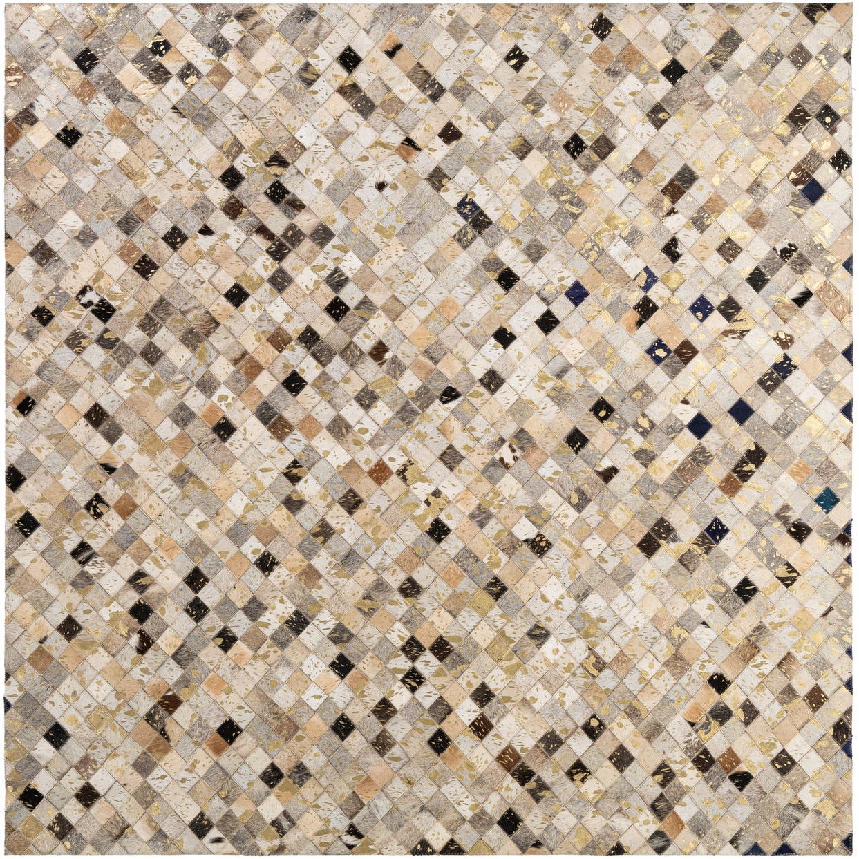 A 5x8 rectangular Cowhide - Patchwork rug featuring a multi-colored modern diamond pattern with natural hide variations and subtle gold accents.