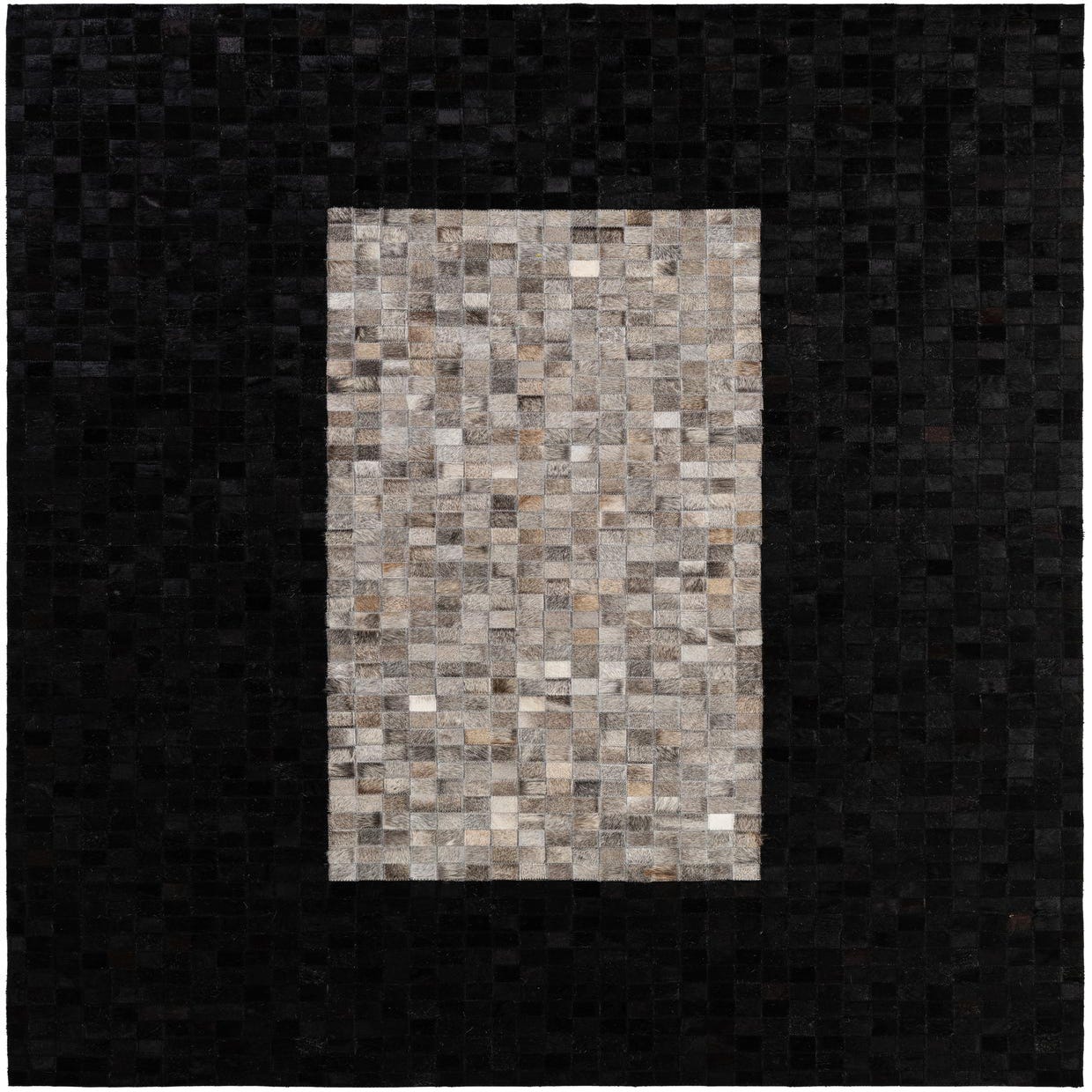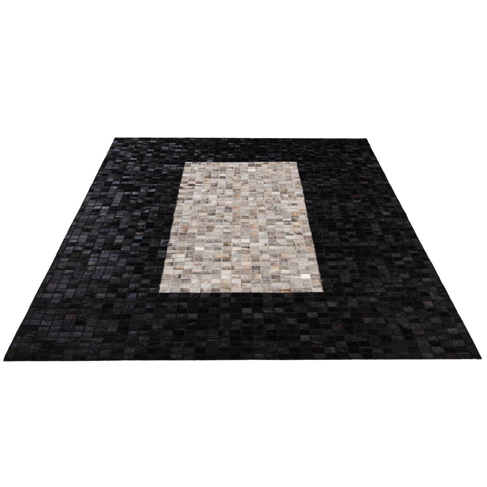 A 5x8 rectangular Cowhide Patchwork rug featuring a multi-colored, light-toned rectangular center on a dark, solid black background.