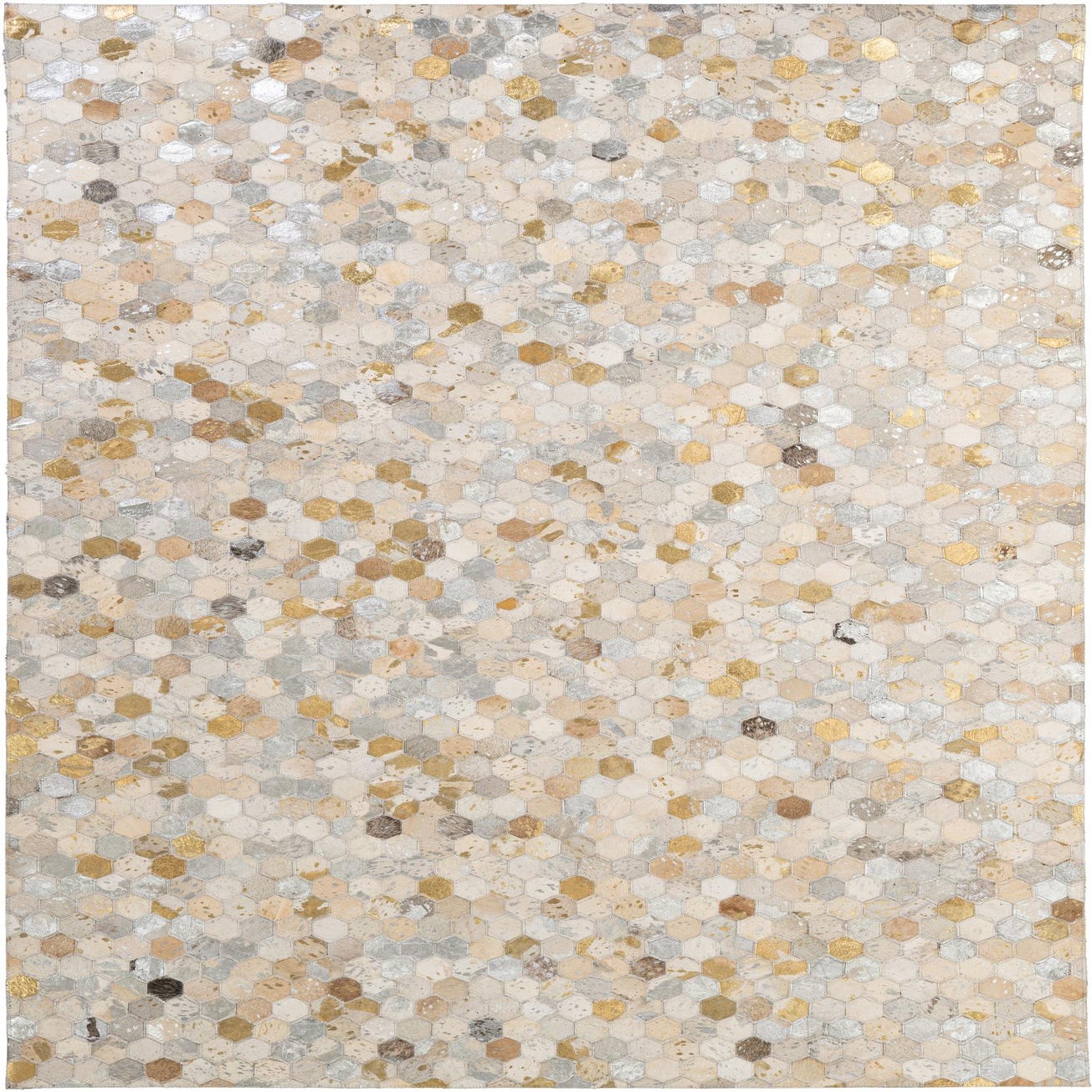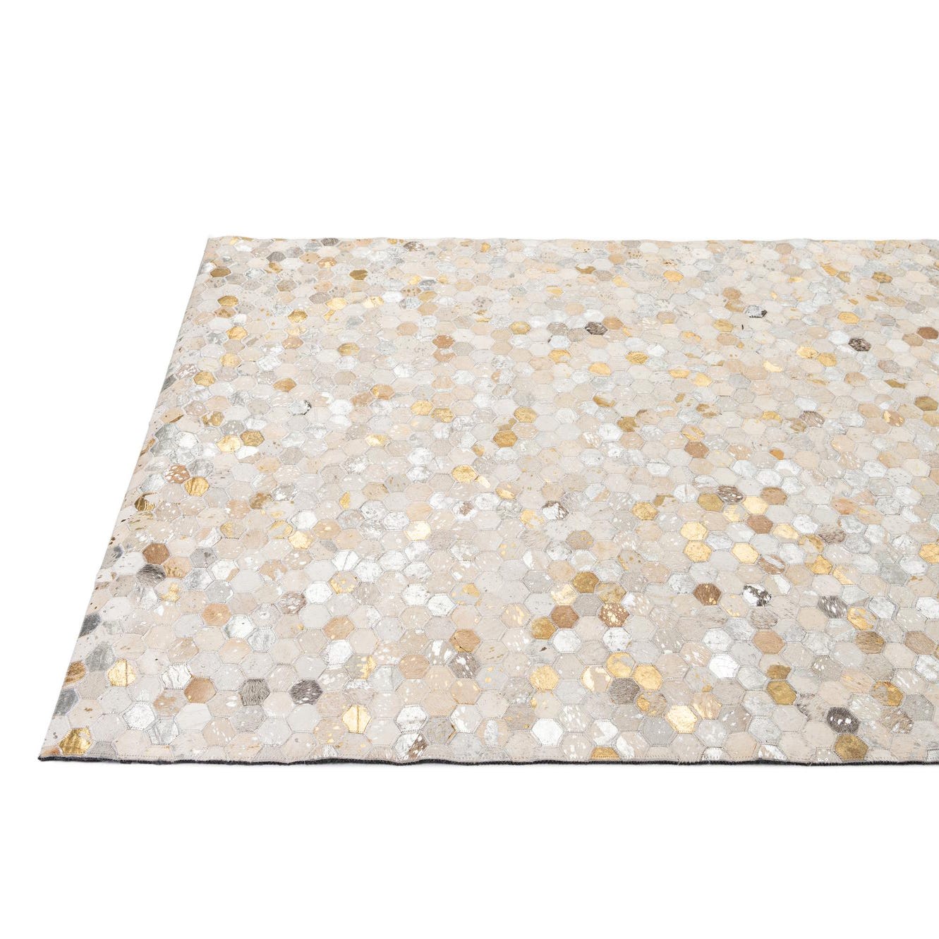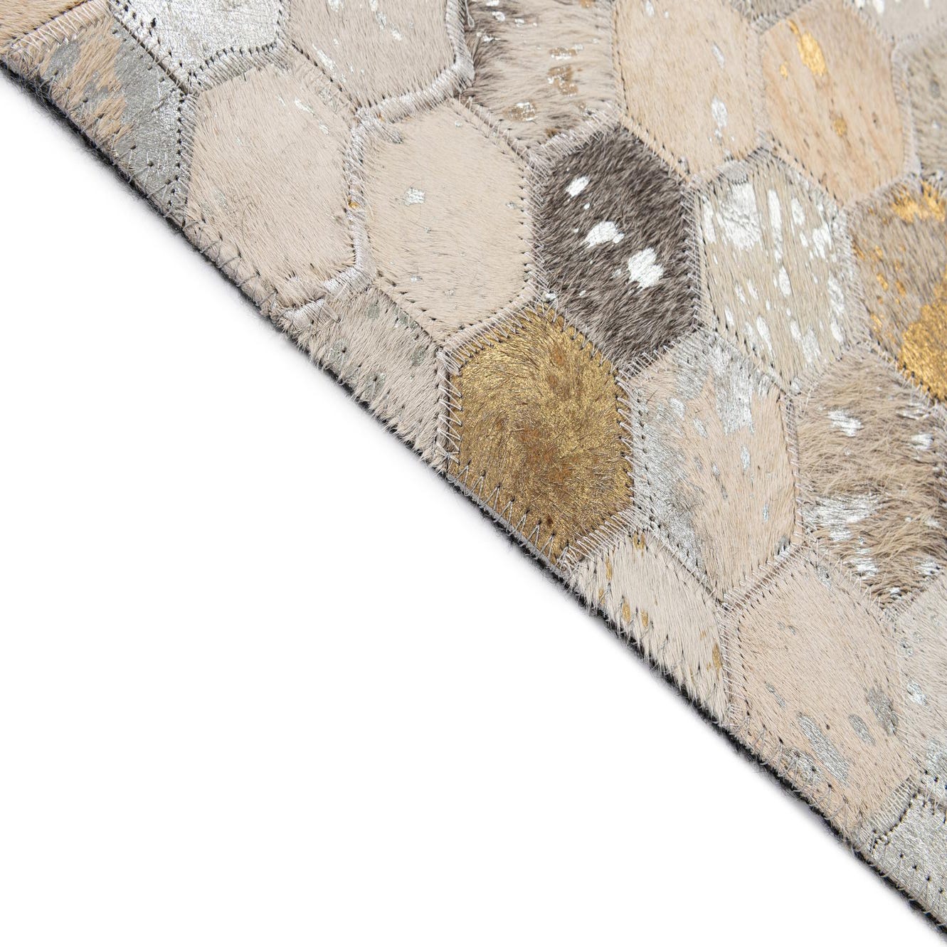 A rectangular 5x8 modern patchwork cowhide rug featuring a mosaic of multi-colored hexagonal leather and cowhide pieces in shades of gold, silver, beige, and brown.