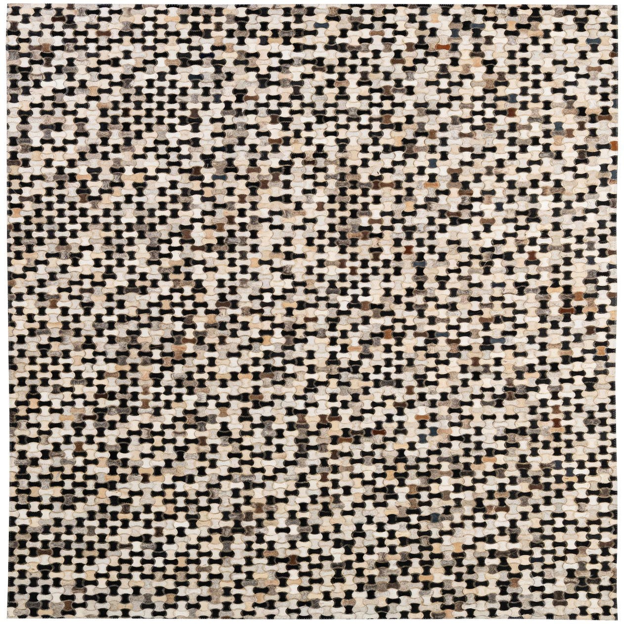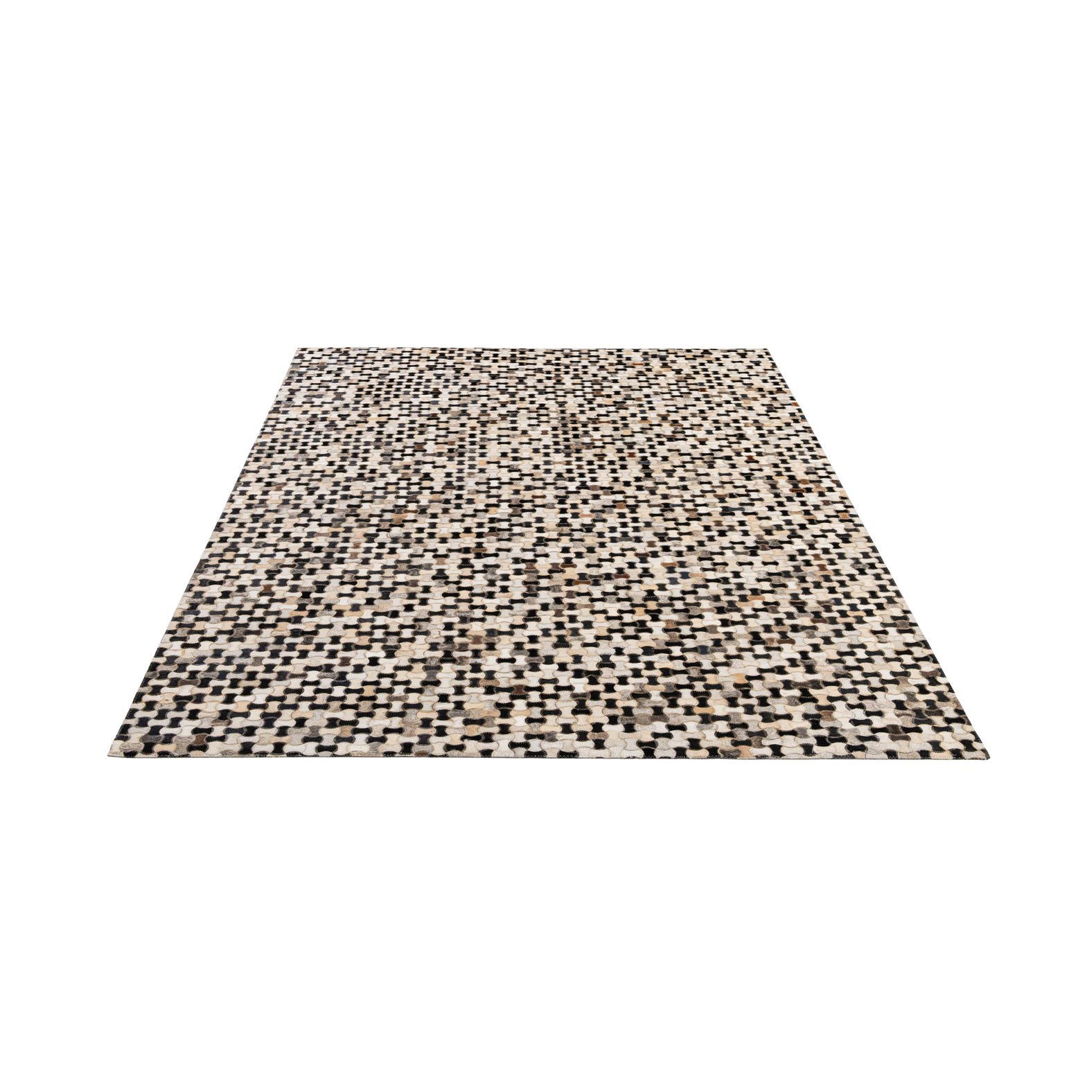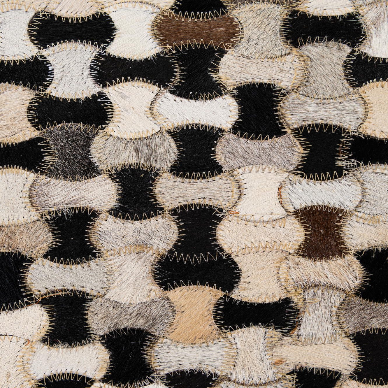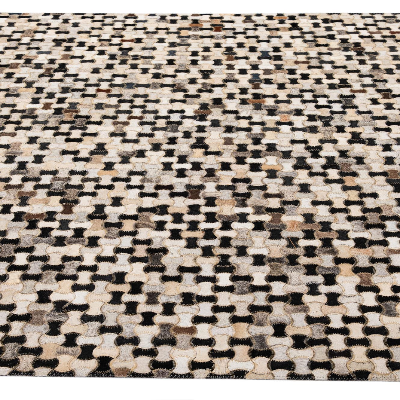 Handmade of cowhide and leather, this patchwork rug presents a tight, small-scale geometric pattern that reads as interlocking rounded crosses across a multi background. The palette mixes beige, black, brown, cream and ivory patches, creating a balanced contrast between light and dark tones. Running stitches between the hide pieces add a subtle raised texture; the hair-on-hide surface feels soft to the touch while the stitched seams provide a gentle, tactile relief that adds depth without dominating the room.