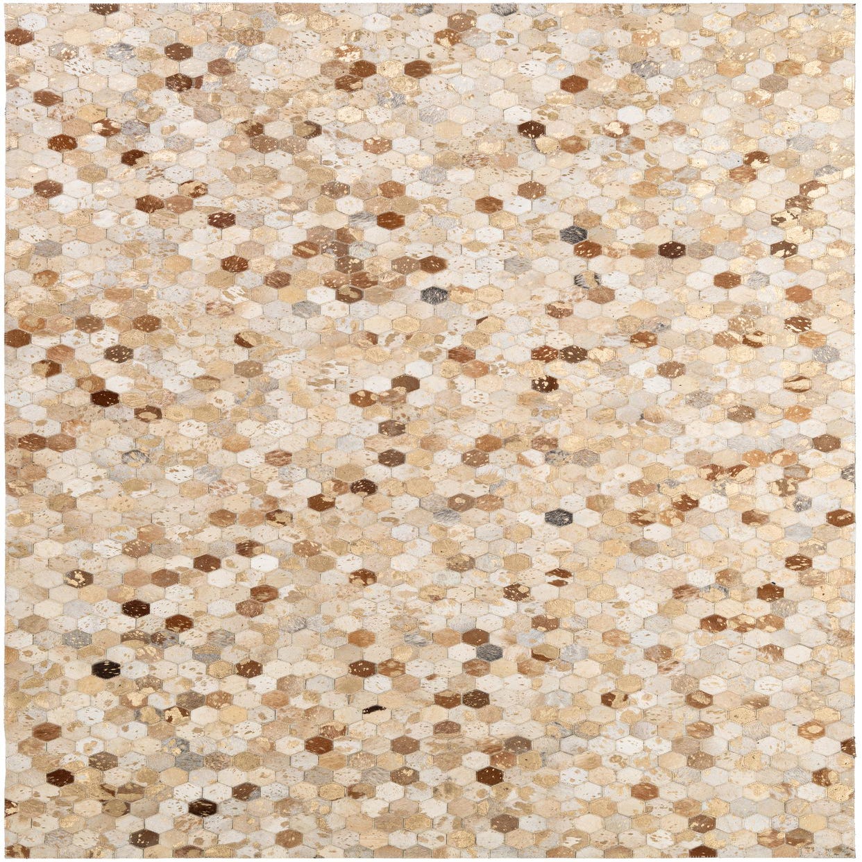 A 5x8 rectangular Cowhide - Patchwork rug featuring a modern multi-colored hexagonal pattern in natural brown, beige, and white tones.