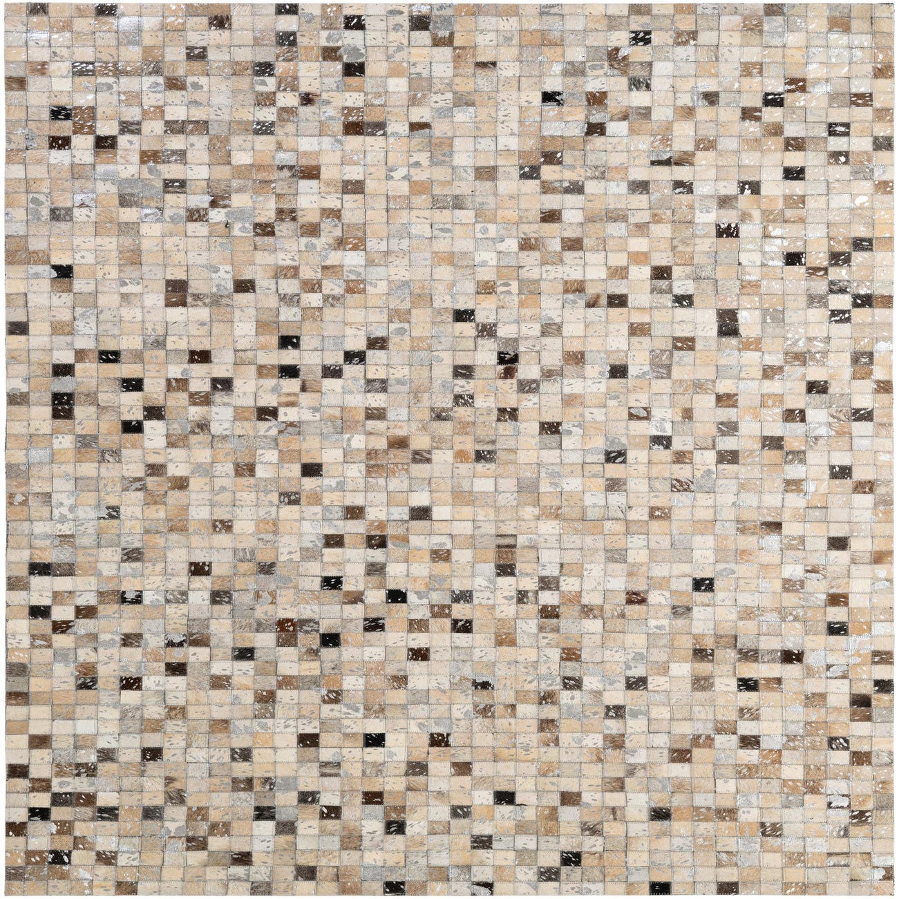 A 5x8 rectangular Cowhide Patchwork rug featuring a modern pattern of multi-colored squares in various natural brown, beige, and black tones.