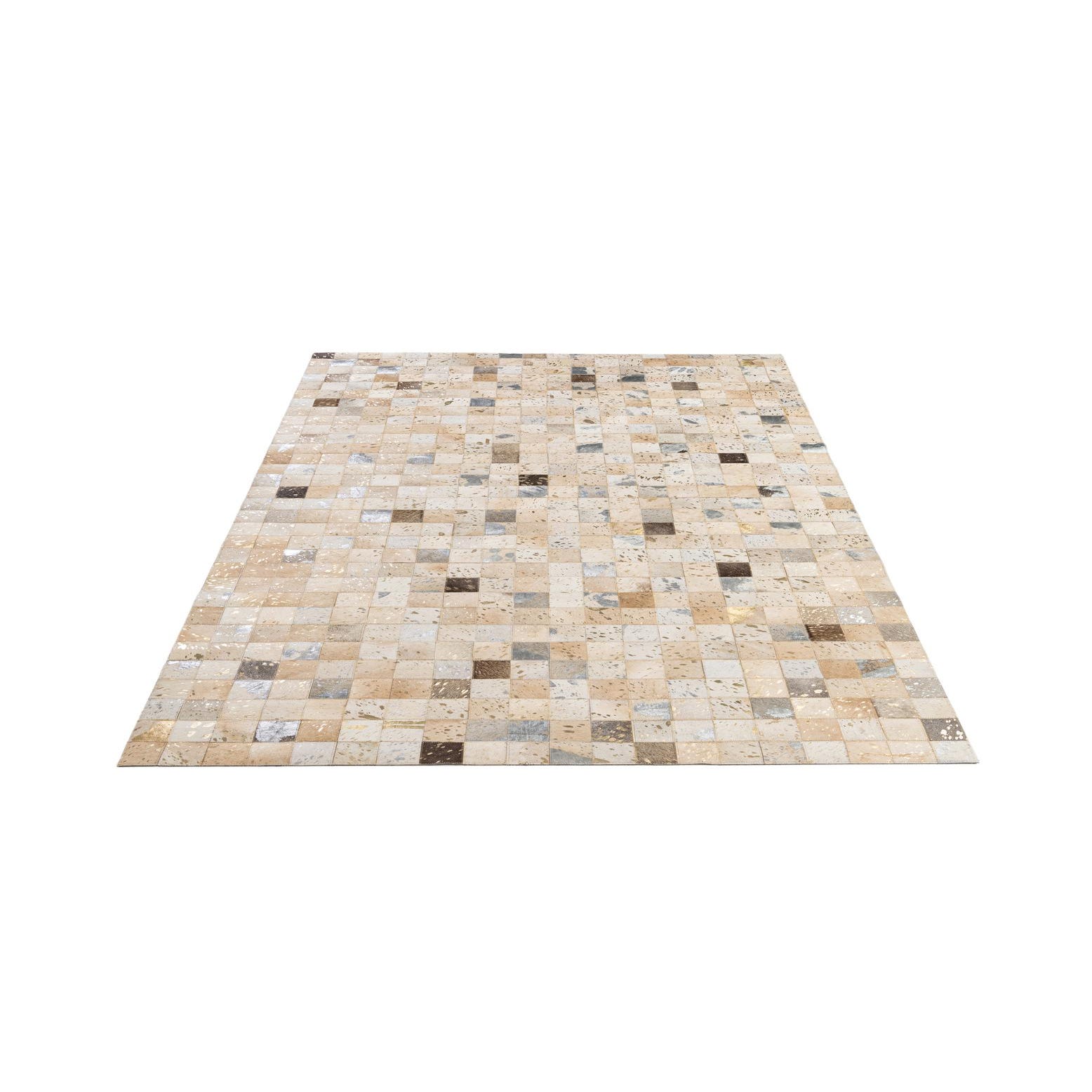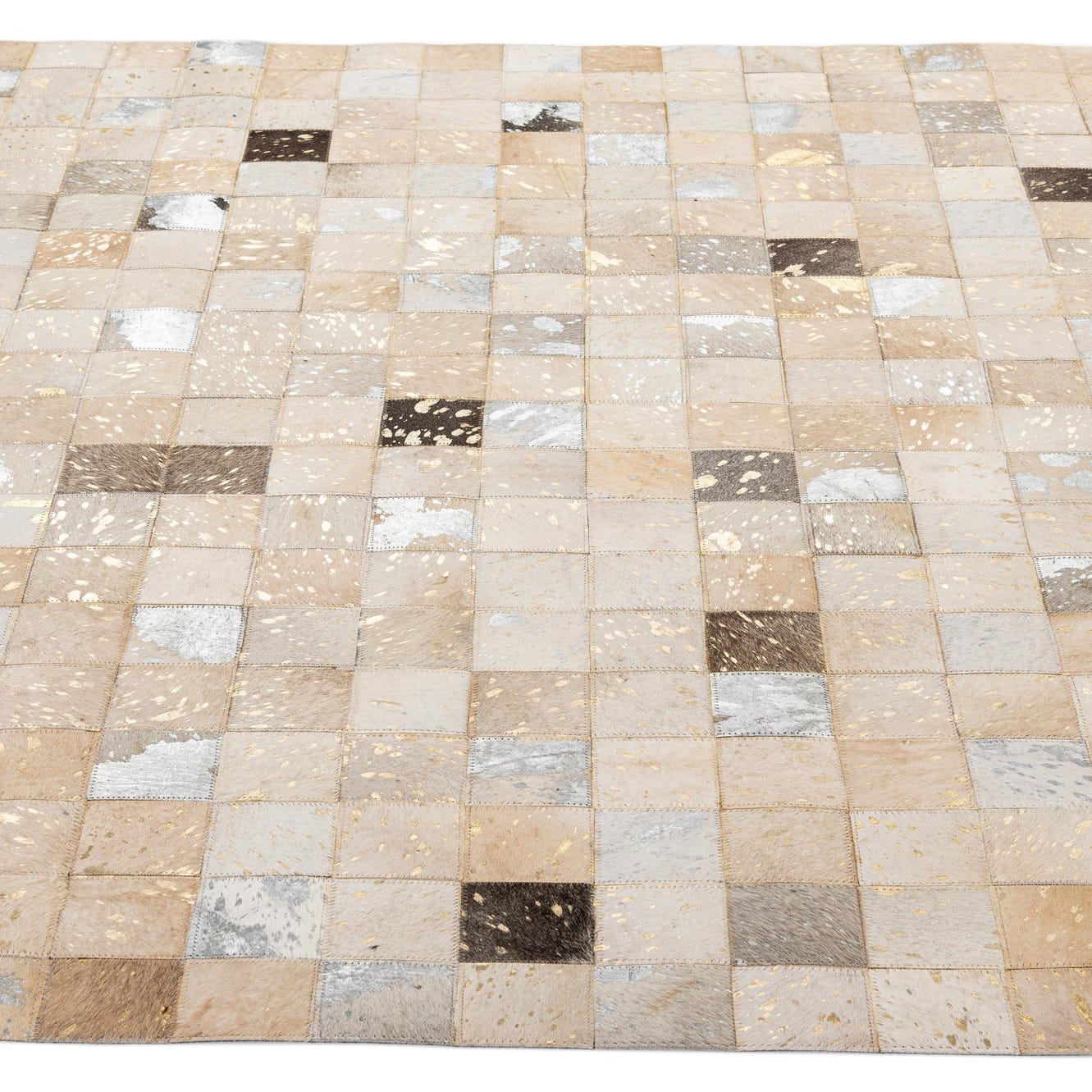 A 5x8 rectangular Cowhide Patchwork rug featuring a modern pattern of multi-colored squares in natural brown, beige, cream, and metallic gold tones.