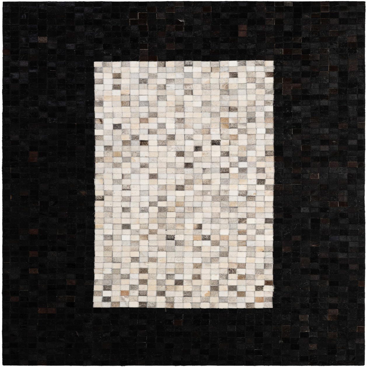 A 5x8 rectangular cowhide rug featuring a modern patchwork design with a multi-colored center and a dark border.