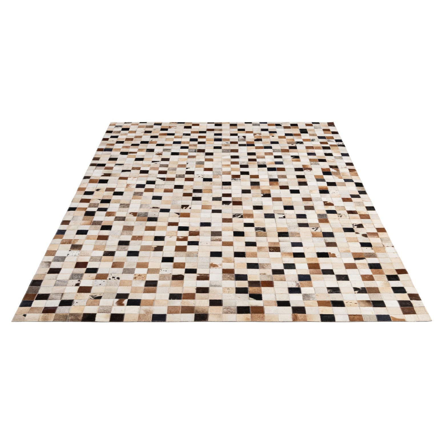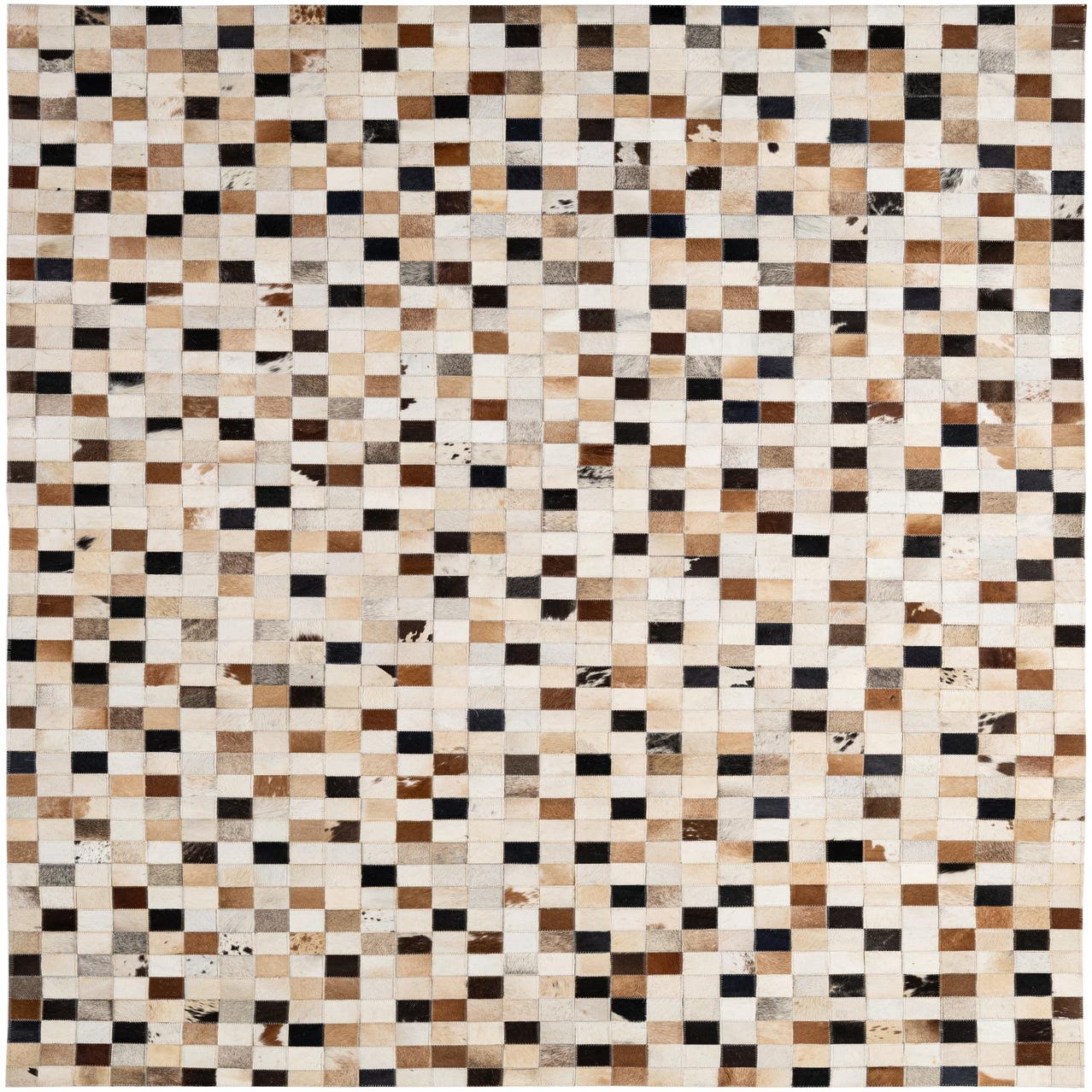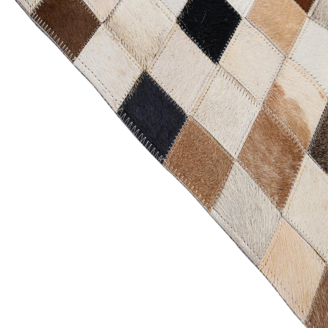 A 5x8 rectangular patchwork cowhide rug with a modern pattern in multi-colored squares of brown, black, and cream.