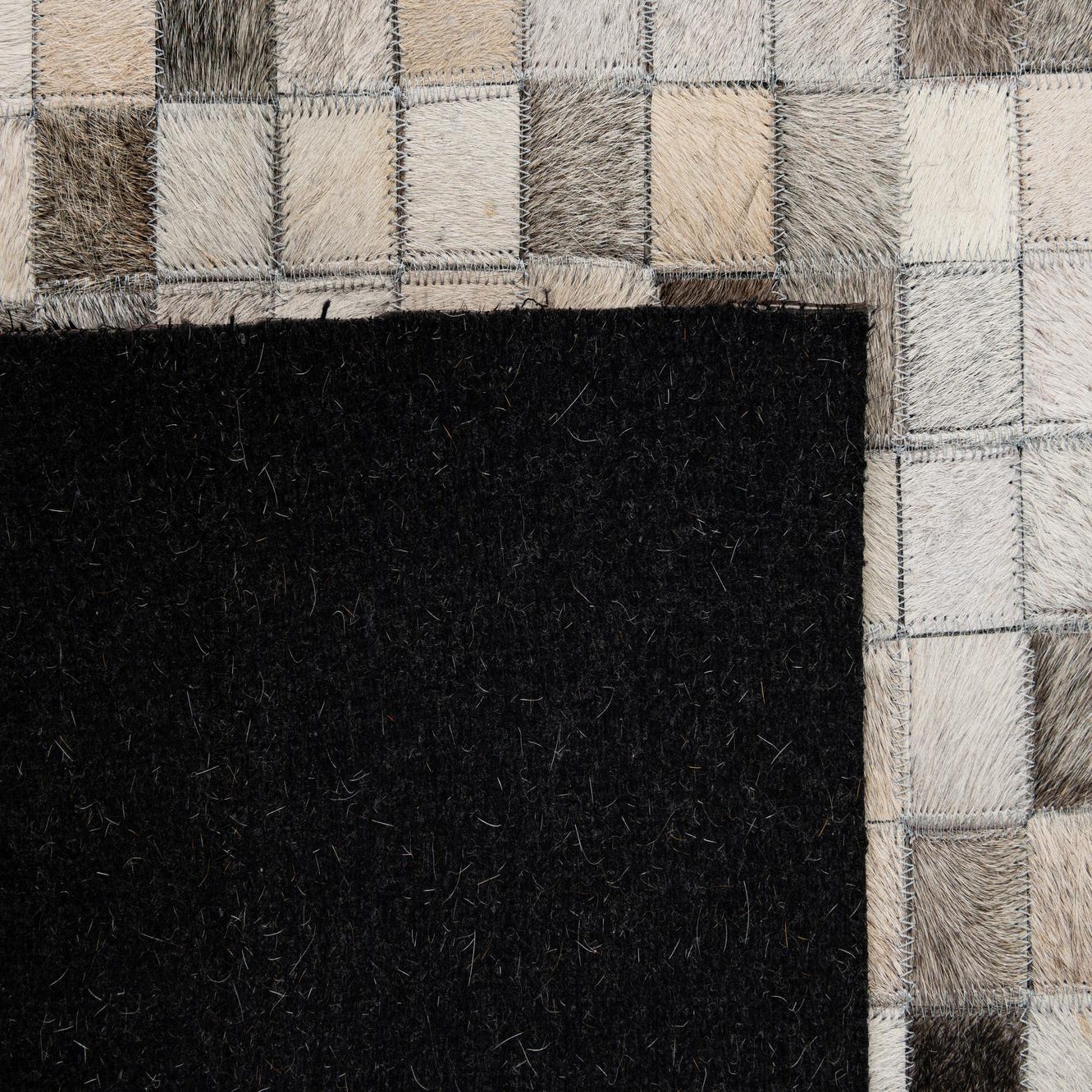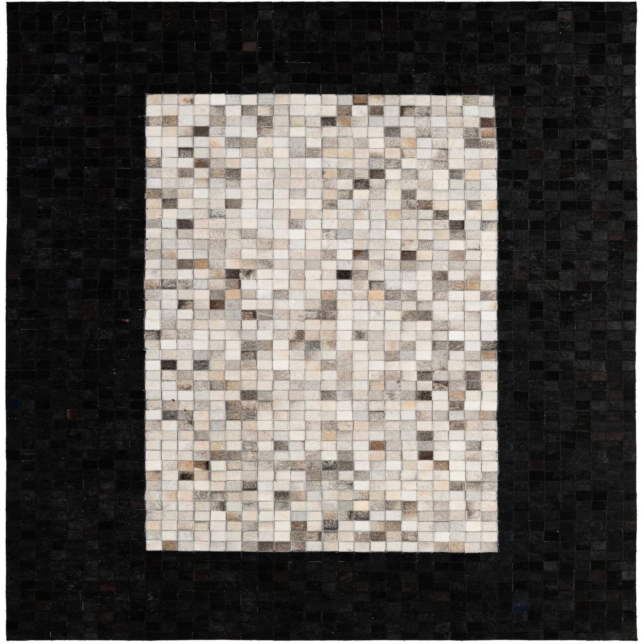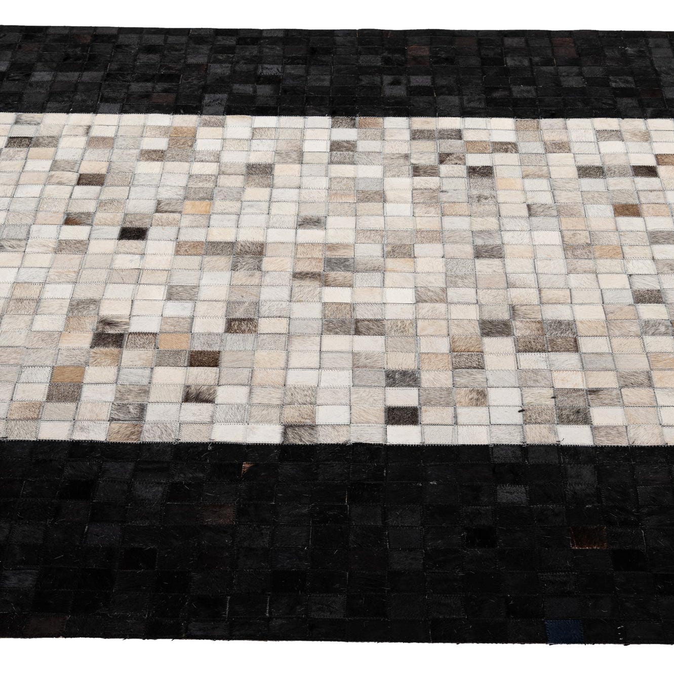 A graphic patchwork composition of small, hand-stitched squares gives this cowhide and leather rug a tactile, mosaic-like presence. The central panel is a multi-tonal field of ivory, beige, tan, gray and brown patches that create a subtle, pixelated pattern, while a broad black border frames the center and provides strong contrast. Running your hand across the surface reveals the soft hair-on-hide nap and the slight sheen of natural cowhide, with visible seams that emphasize the rug’s handcrafted construction.