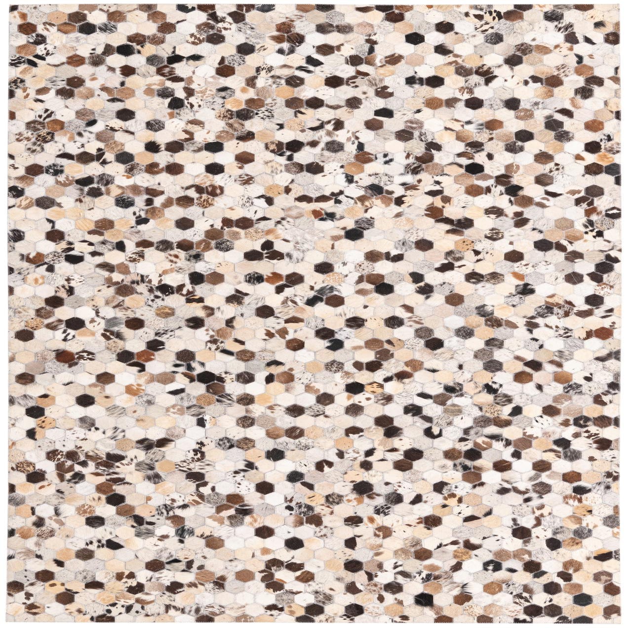 A 5x8 rectangular Cowhide rug featuring a modern pattern of multi-colored hexagonal patches in natural brown, black, and white tones.