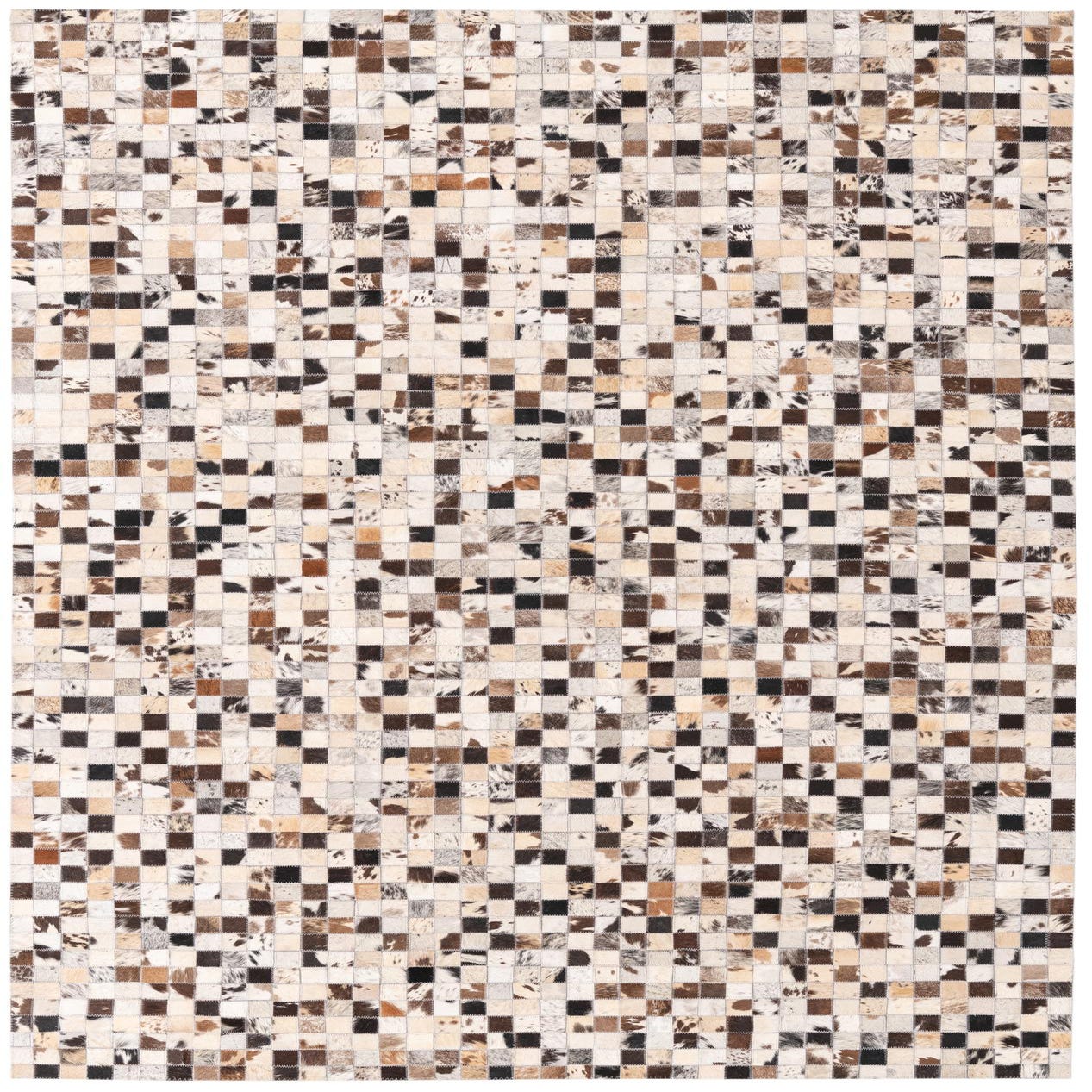 A 5x8 rectangular Cowhide rug featuring a modern patchwork of multi-colored squares in various natural hide patterns.