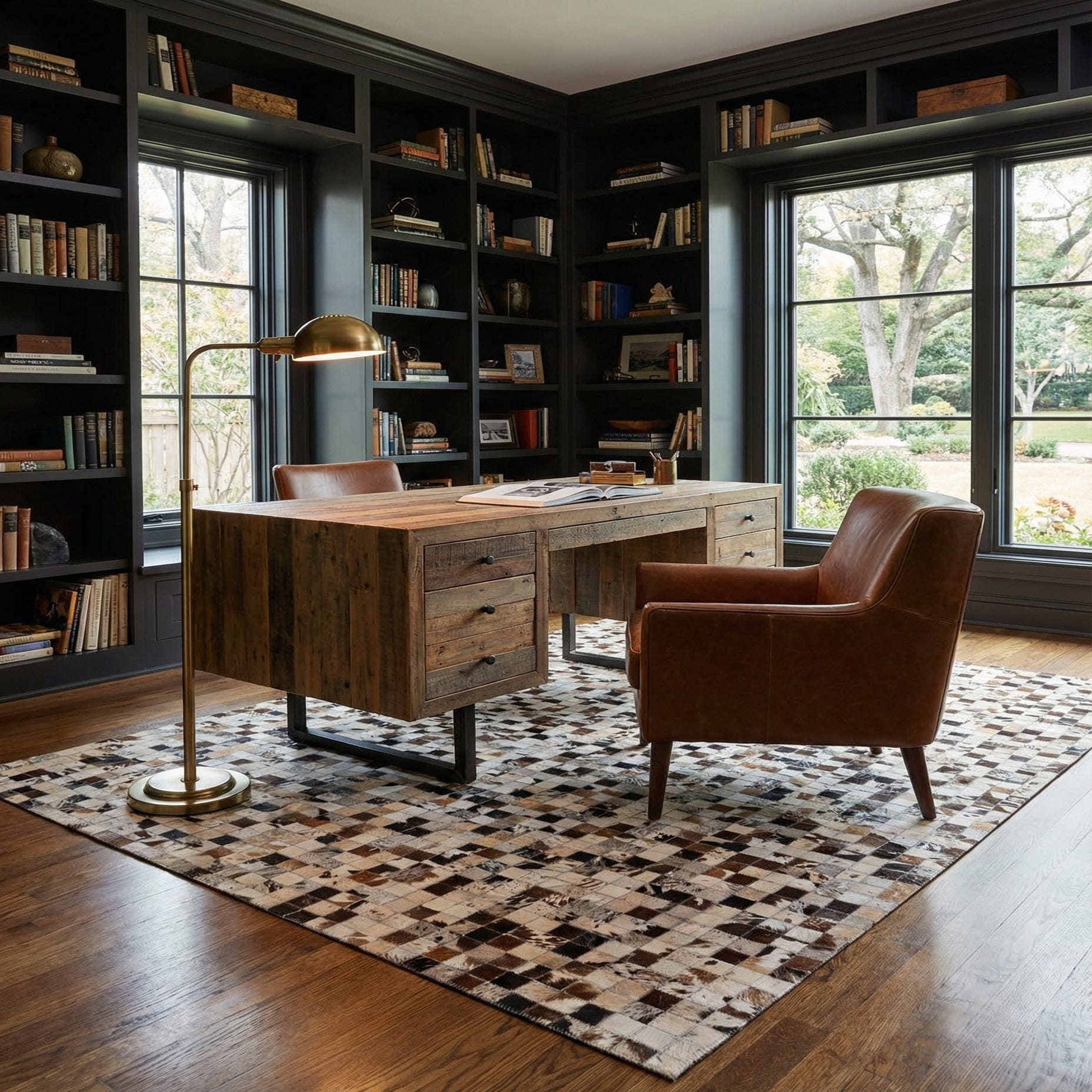The rug's distinct texture and organic patterns make it a perfect centerpiece for a variety of interior design scenarios, seamlessly blending with rustic decors, complementing minimalist styles with its understated earth tones, or adding a natural contrast to modern and contemporary spaces. It would particularly stand out in a living room, study, or den where it can serve as a conversation starter while anchoring the furniture around it.