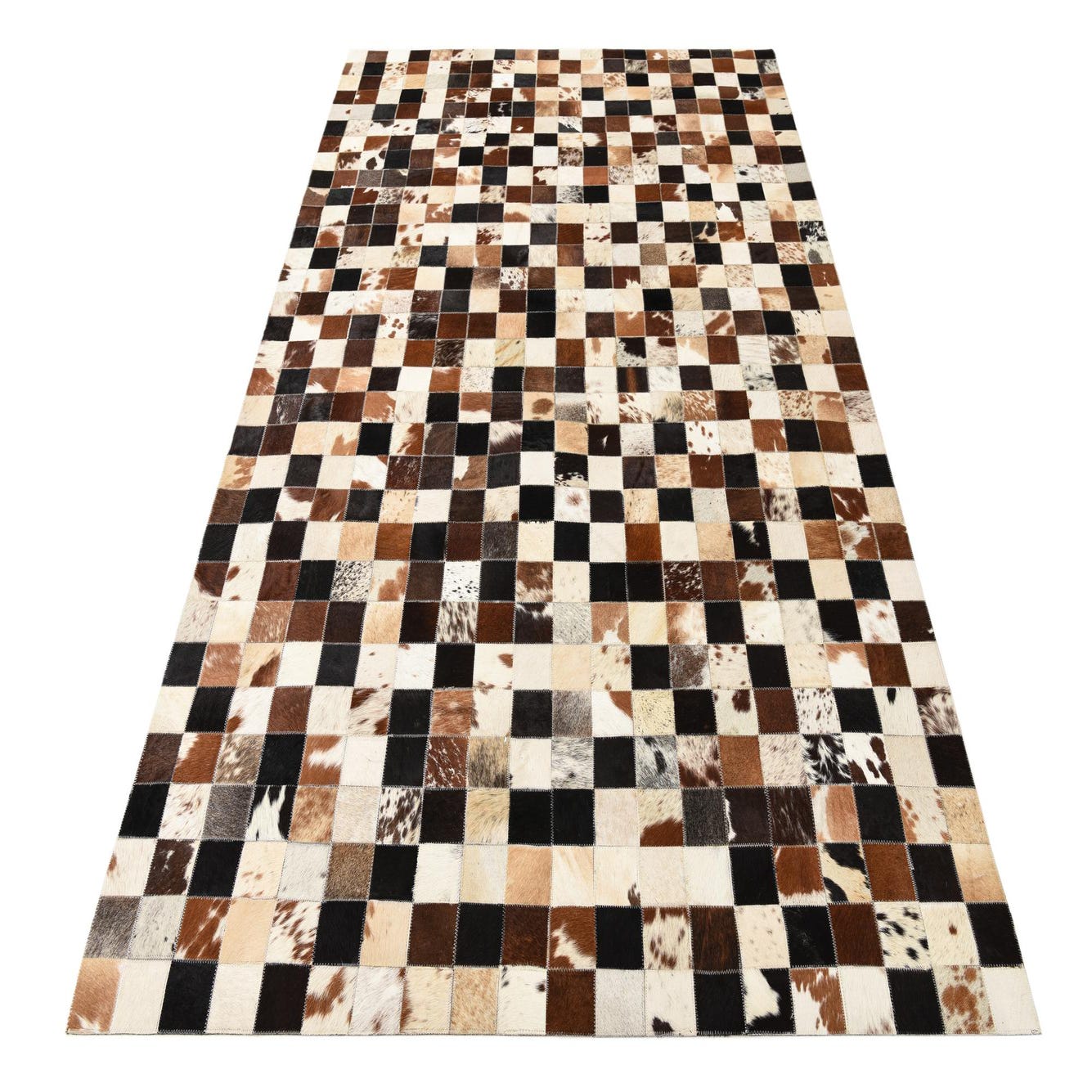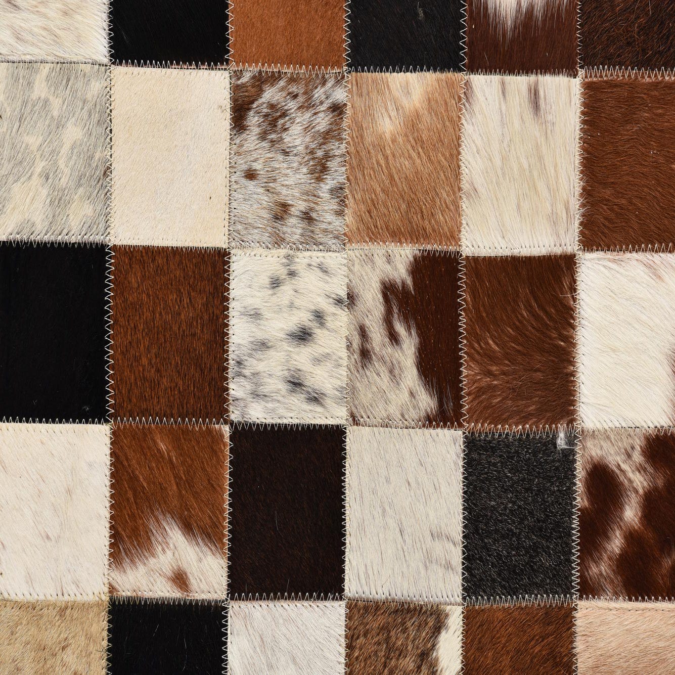 The Cowhide Collection presents a handcrafted 5x8 cowhide and leather rug that boasts a visually dynamic checkerboard pattern. The interplay of multi-toned squares in beige, brown, ivory, light brown, and gray hues creates a tapestry of natural colors, delivering a bold yet harmonious aesthetic. The alternating shades and textures inherent in the natural materials lend each piece a unique character, epitomizing a rustic yet refined style.