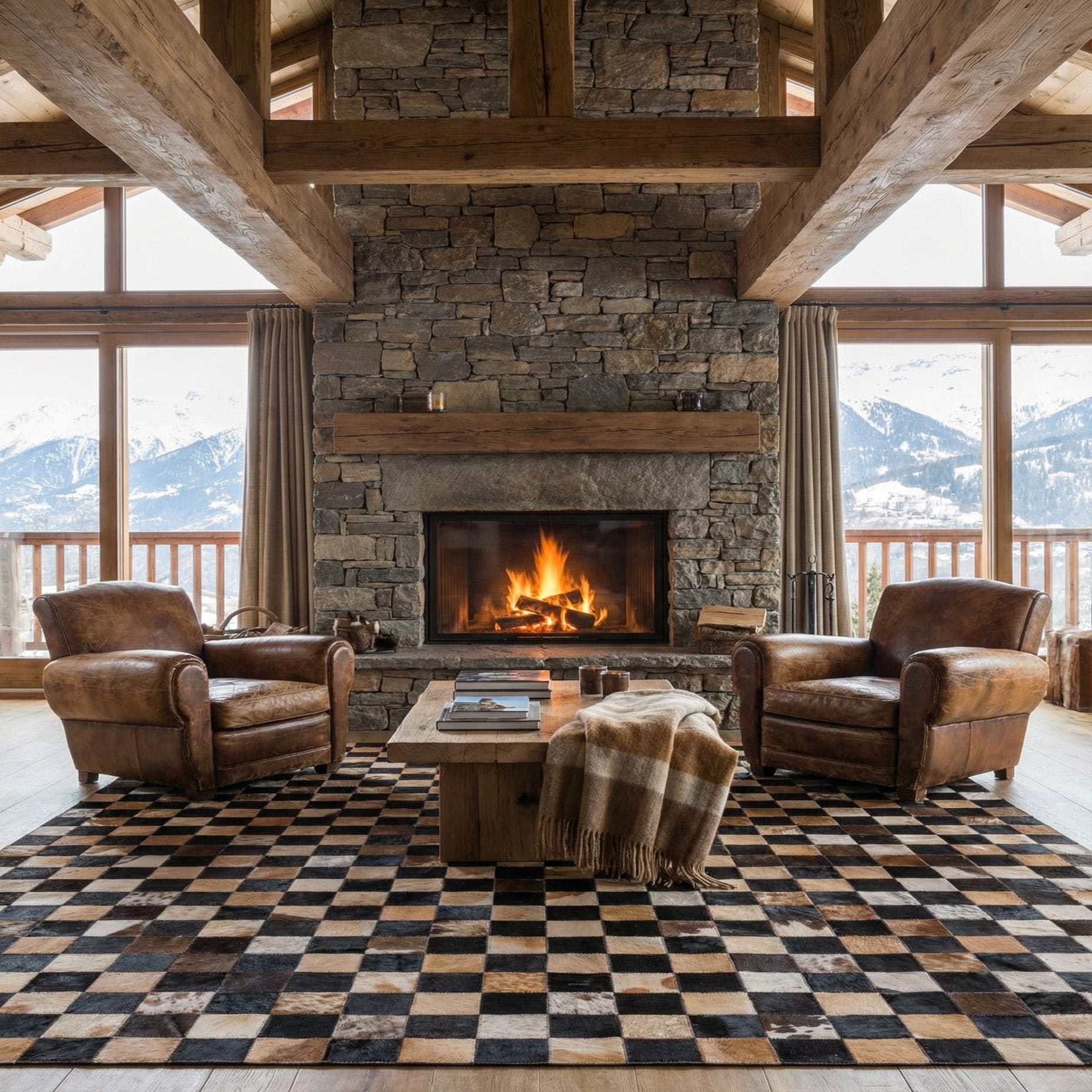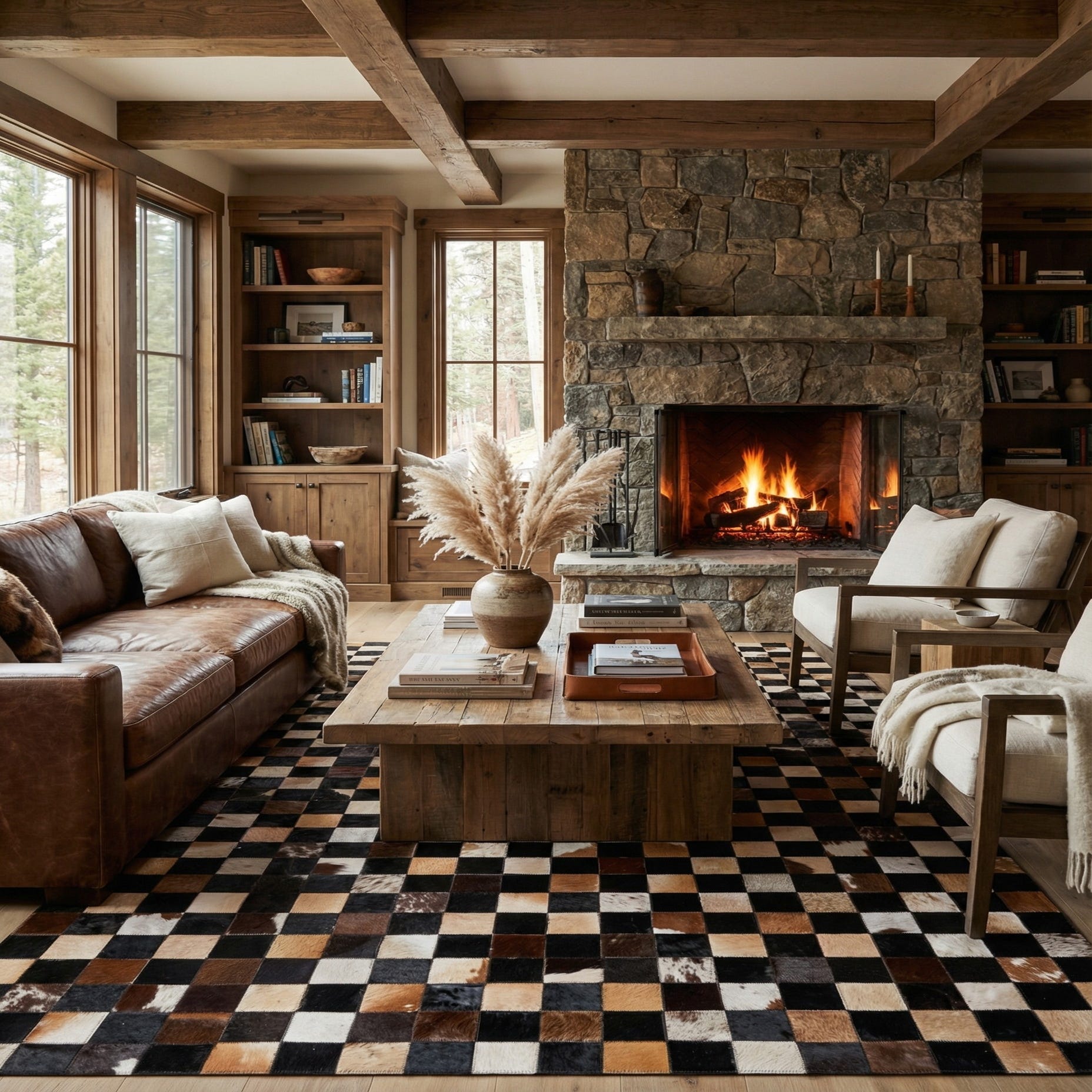 A 5x8 rectangular Cowhide rug featuring a modern checkerboard pattern in varied shades of black, brown, and white.