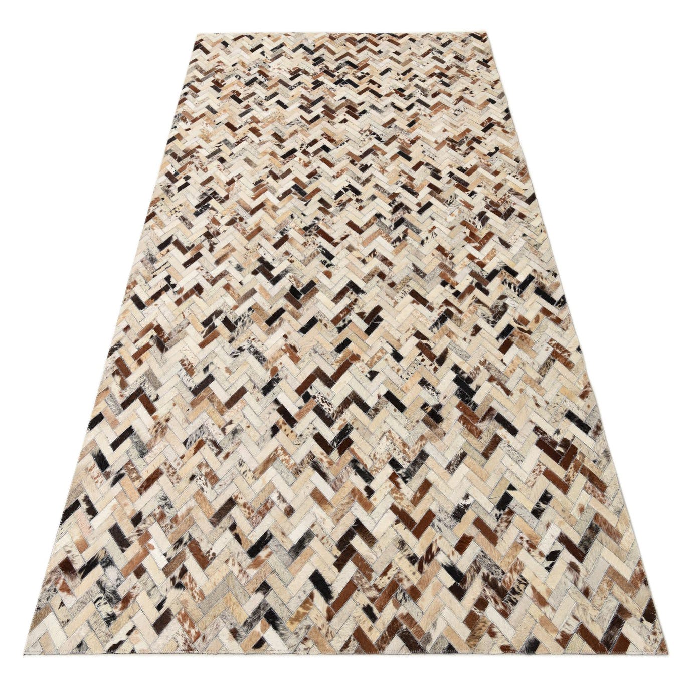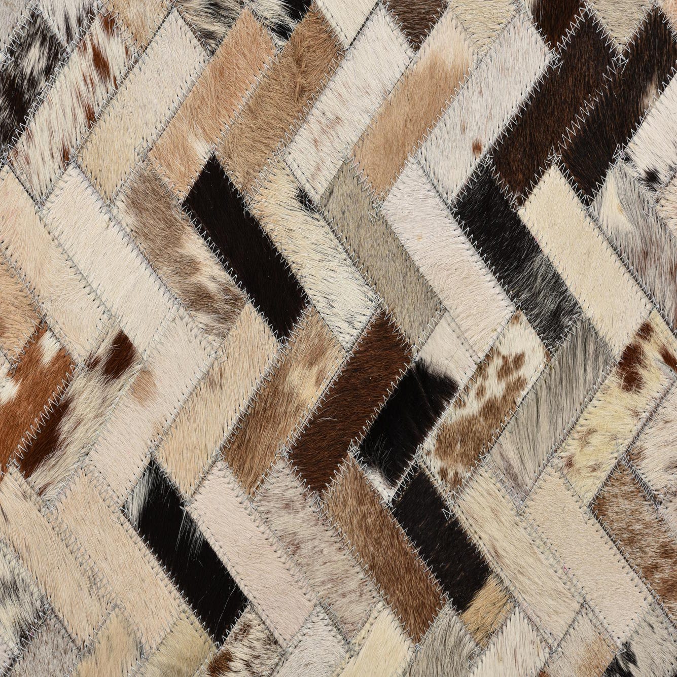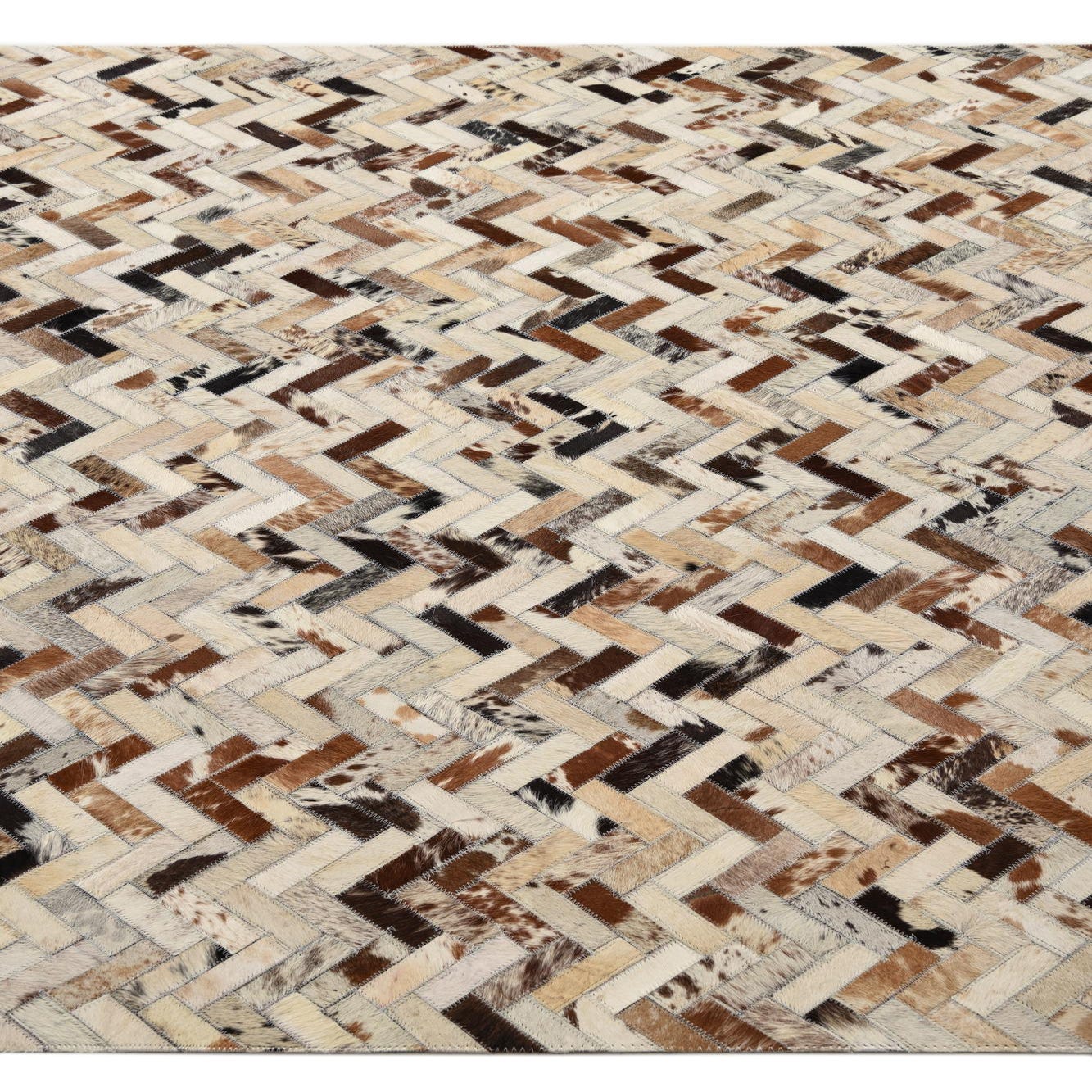 This Cowhide collection rug presents a striking herringbone pattern composed of hand-stitched cowhide and leather pieces. The arrangement of natural tones, including beige, brown, ivory, light brown, and gray, creates a dynamic and versatile backdrop with the multi-colored base offering a rich tapestry of hues. The use of genuine cowhide ensures a lush texture, providing both visual interest and tactile appeal.