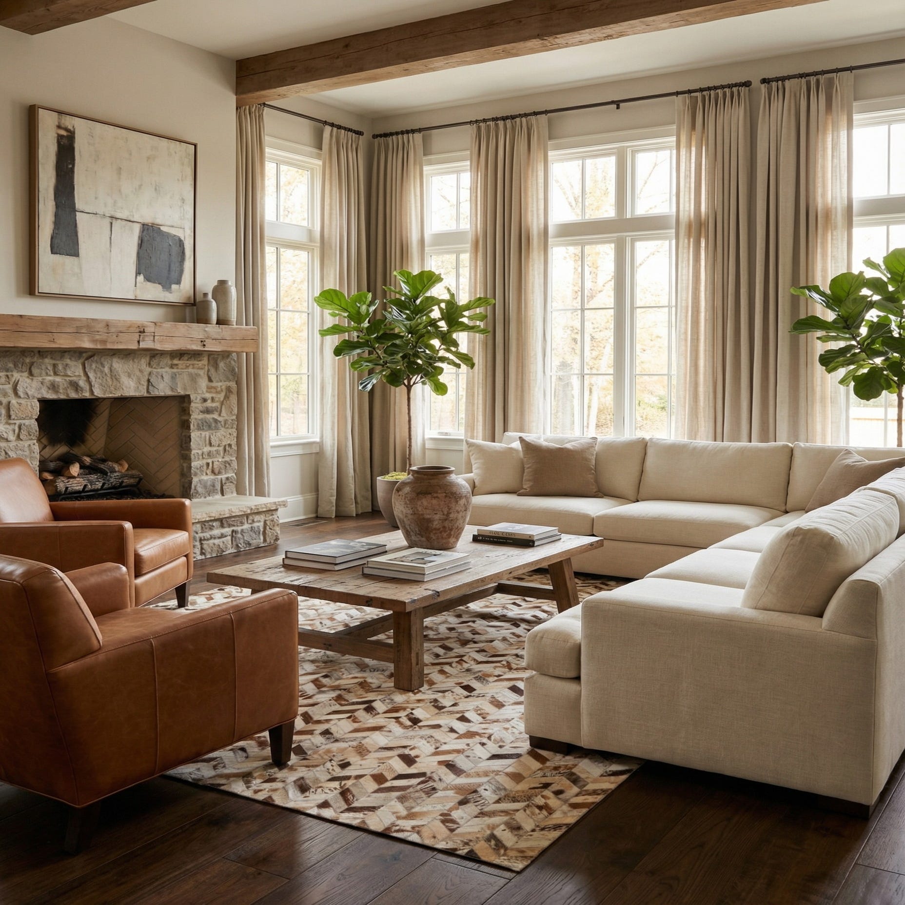 The neutral, earth-toned chevron pattern works well in a range of interiors — modern farmhouse, transitional, rustic contemporary, or a pared-back Scandinavian scheme. Use it to anchor a living room seating area or layer it over wood floors in a bedroom for added warmth and texture. It also suits entryways and home offices where pattern and natural material can complement linen upholstery, wood furniture, and matte metal accents.