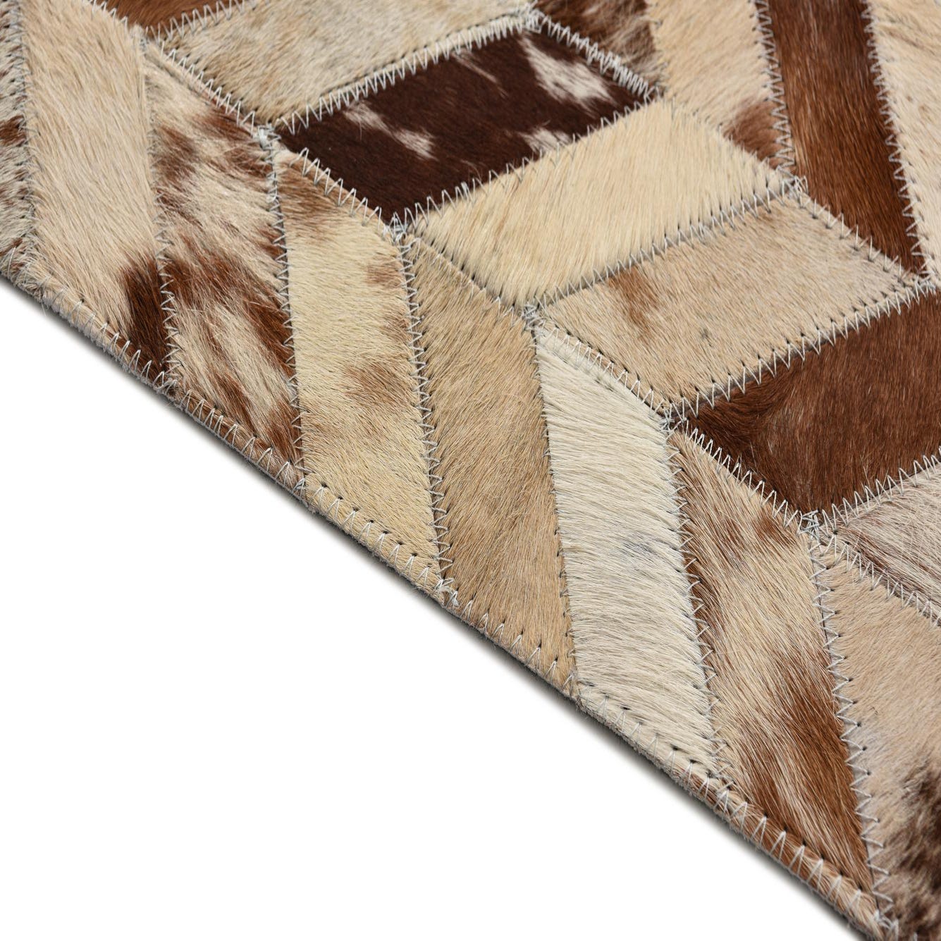 Hand made from cowhide and leather, this rug is composed of narrow, chevron-shaped hide pieces stitched together to form a dense, linear patchwork. The multi background supports a calm palette of beige, brown, gray, ivory and light brown, with natural hair-on-hide markings that add subtle variation across the surface. The hair-on-hide finish feels soft underfoot while the stitched seams create a low-profile texture and visual depth; the leather construction gives the piece structure and a refined, tactile quality.