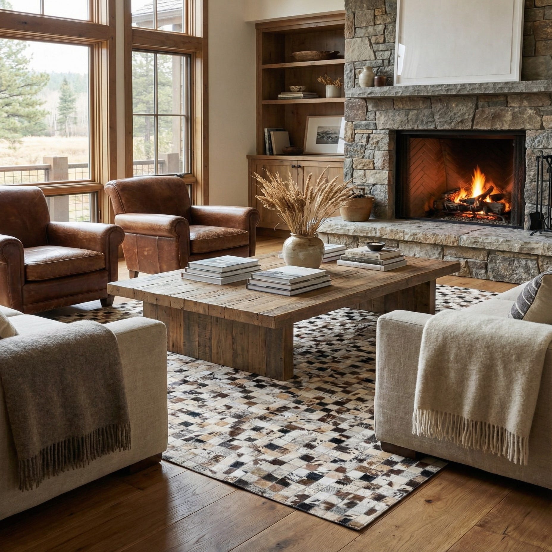 A 5x8 rectangular Cowhide rug with a modern patchwork pattern in multi-colored natural cowhide and leather squares.