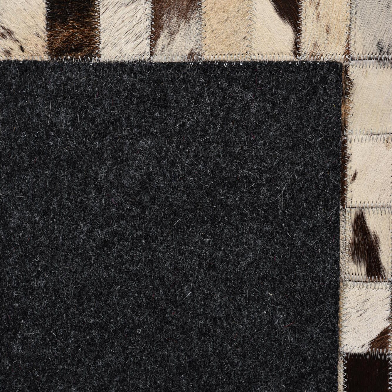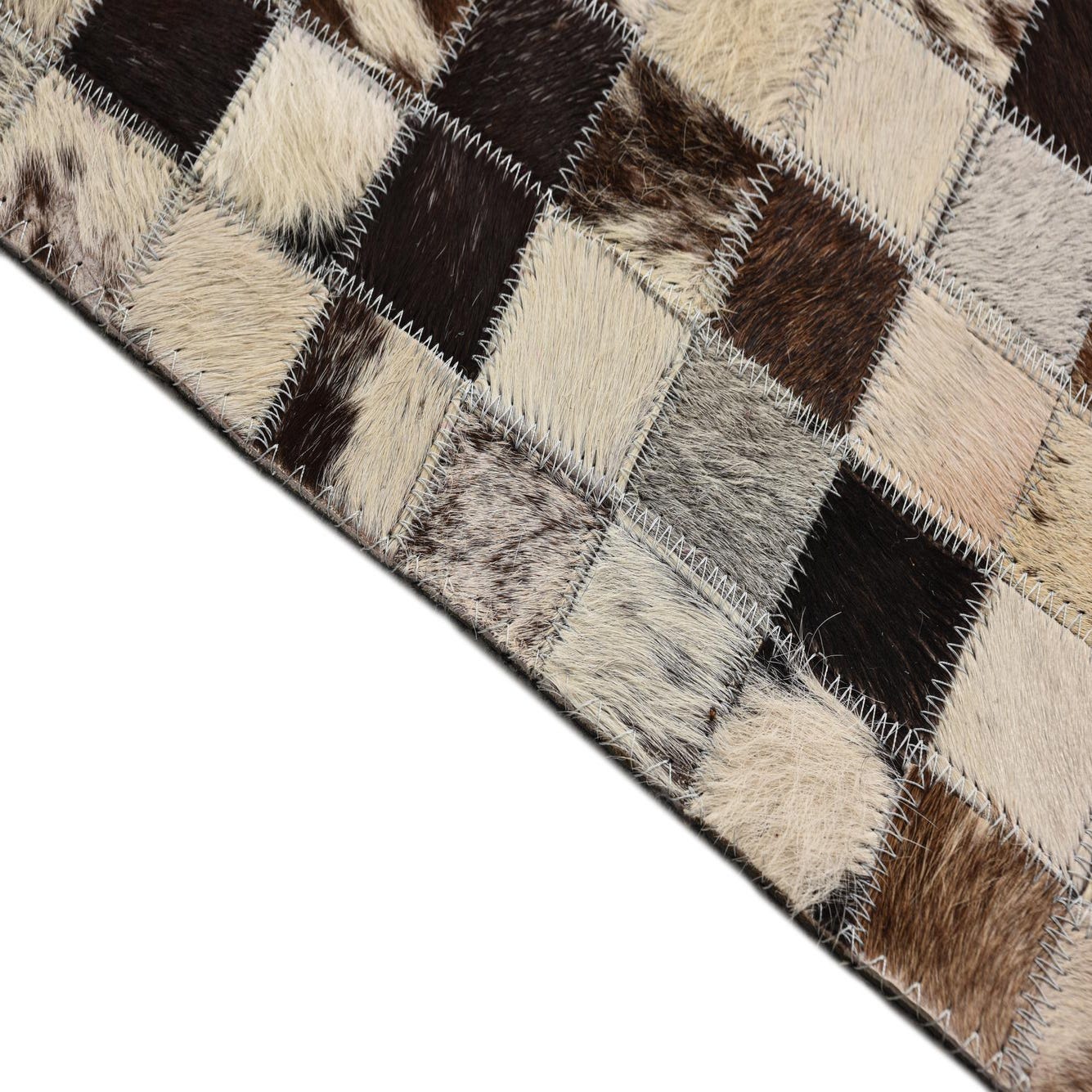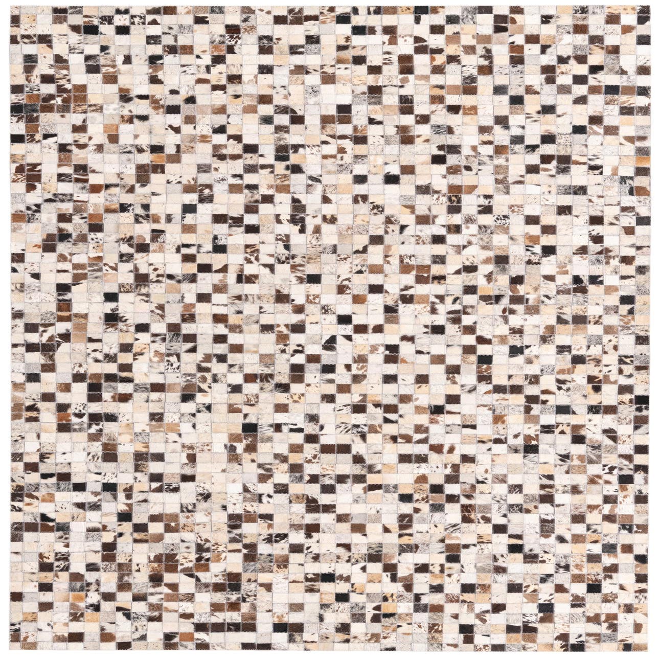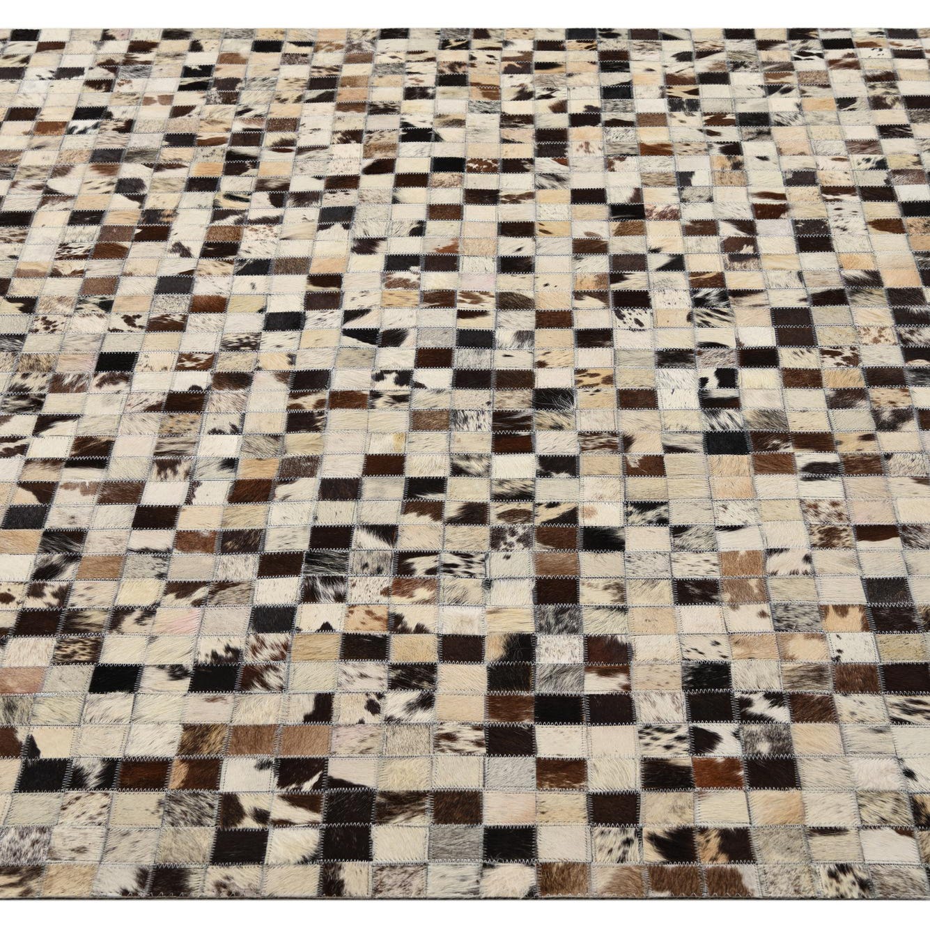 This Cowhide collection rug is handcrafted from cowhide and leather, creating a distinctive mosaic of varied tones that include beige, black, brown, gray, ivory, light brown, and a multi-colored background. The patchwork pattern is composed of small squares that combine to create a cohesive yet dynamic design, lending visual interest and a luxurious texture to the floor covering.