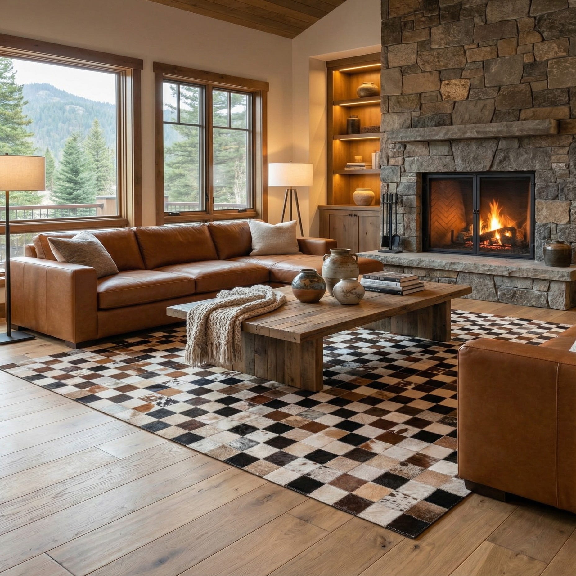 The checkerboard layout presents a bold statement that can anchor a room, offering a striking contrast without overpowering the space. Its versatile palette and design make it a suitable choice for a variety of interior styles, from rustic to modern. This handcrafted piece could complement a minimalist setting as a standout focal point or add warmth and texture to an industrial loft. The natural variations in the cowhide pieces ensure that every rug is one-of-a-kind, with a character that could enhance living rooms, home offices, or open-plan areas seeking a touch of sophistication and natural charm.