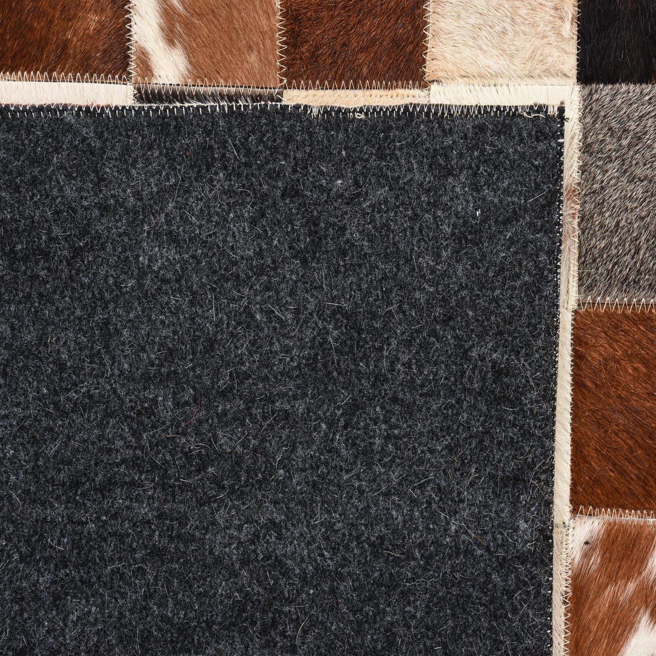 A rectangular 5x8 modern rug made from multi-colored cowhide and leather patches in a checkerboard pattern.