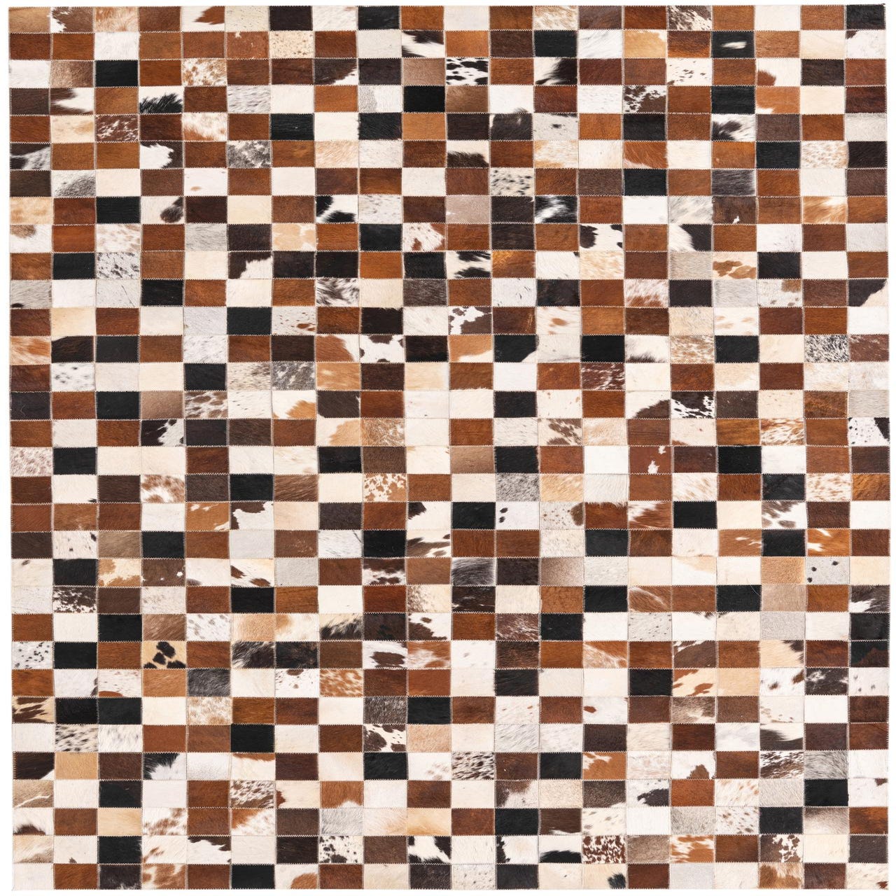 The rug's texture is characteristic of the genuine cowhide and leather materials used, providing both durability and tactile appeal. The varying hair lengths and color tones on each individual square add to the rug's unique, organic charm.