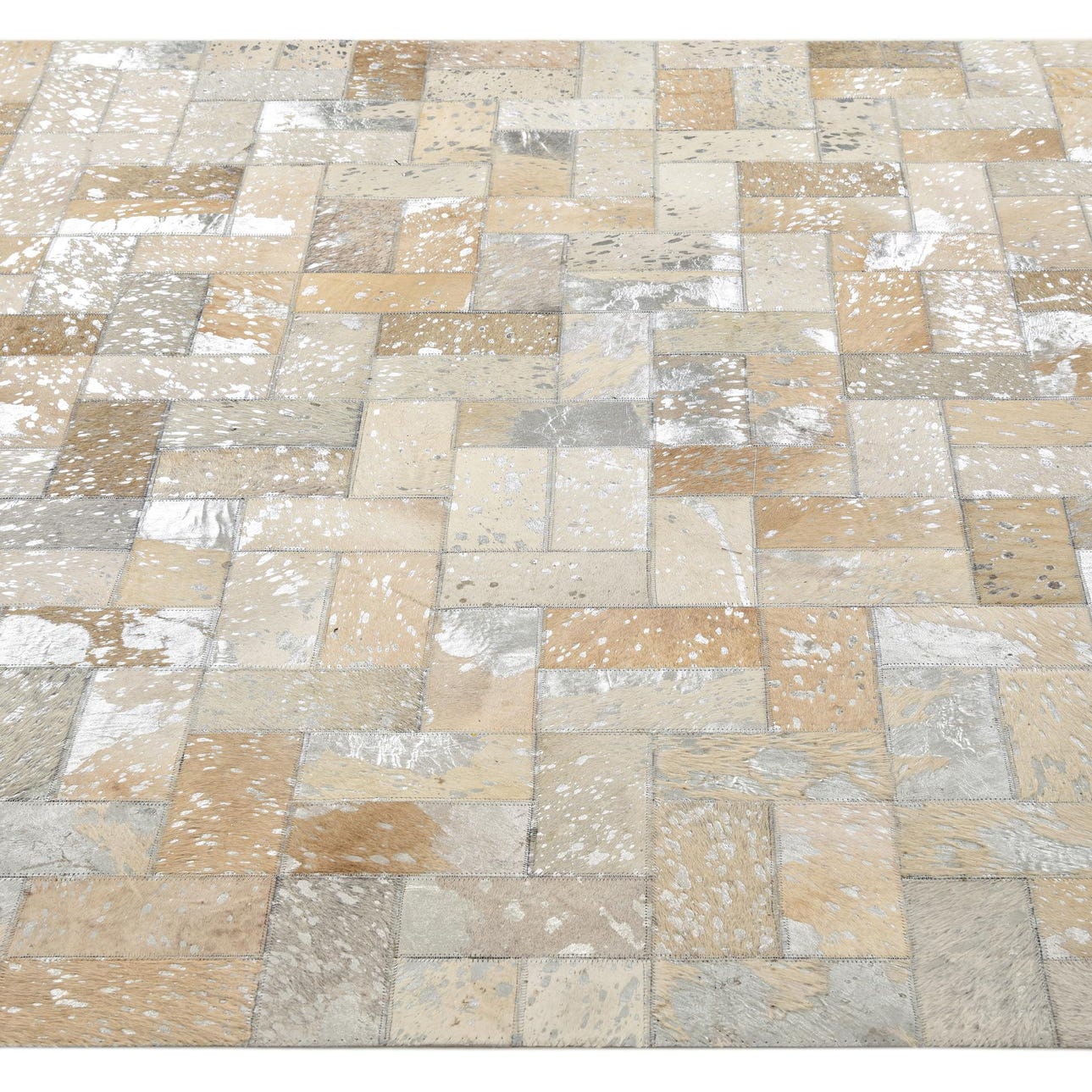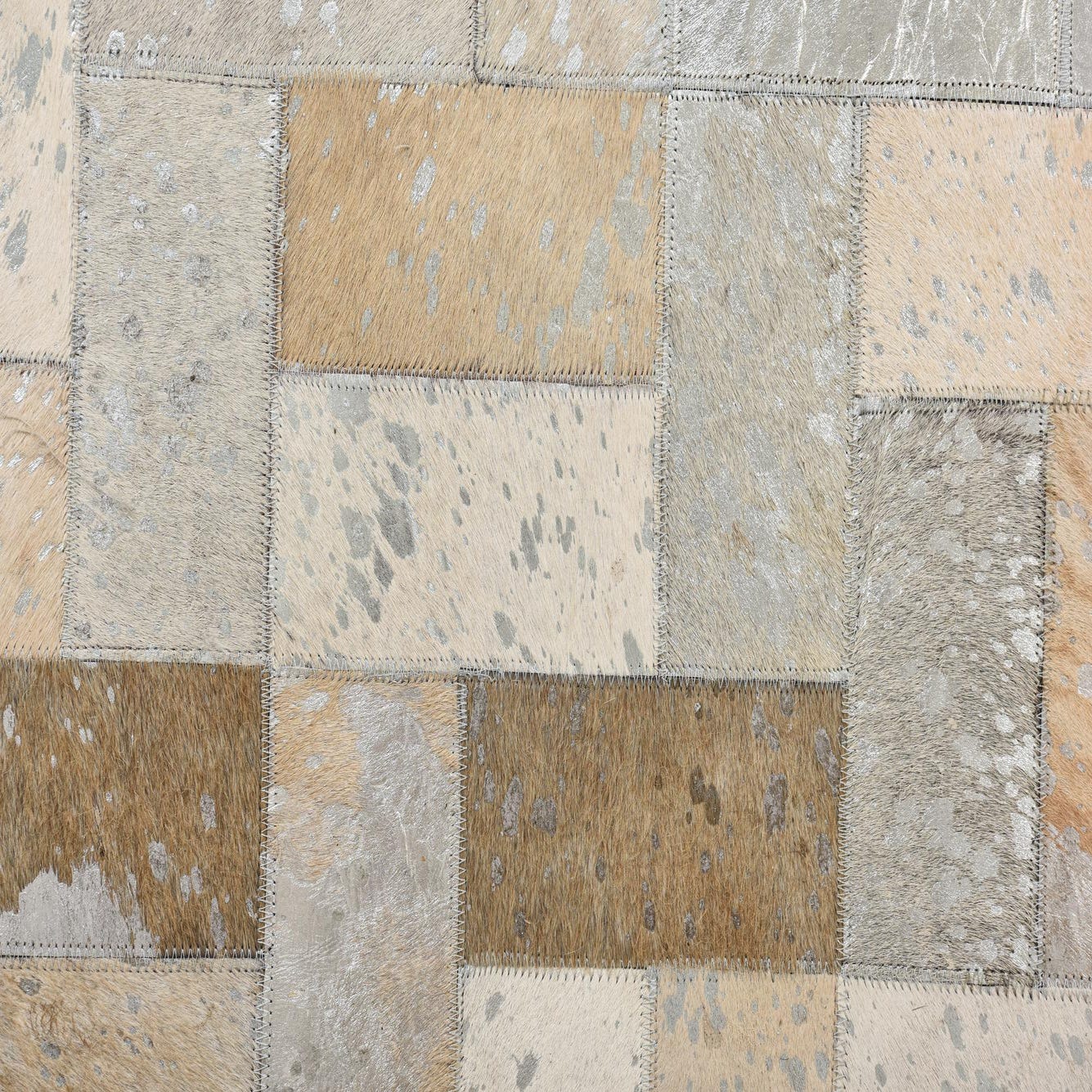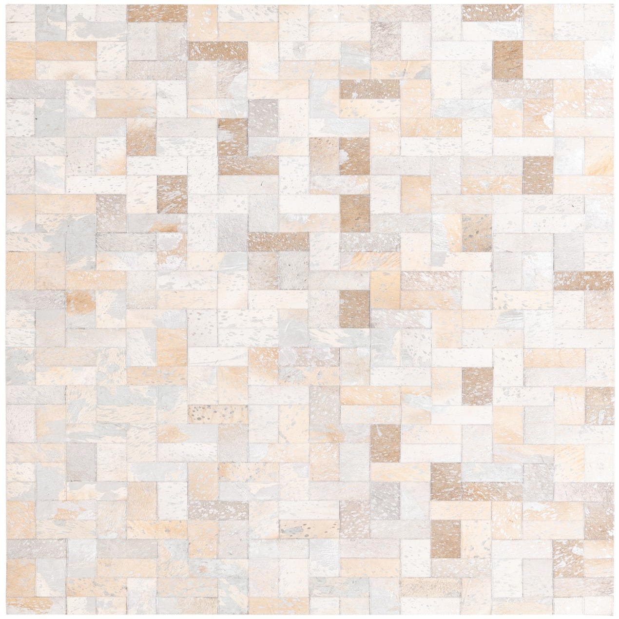 5x8 rectangular Cowhide rug with a modern patchwork pattern in multi-colored natural tones of white, beige, and light brown.