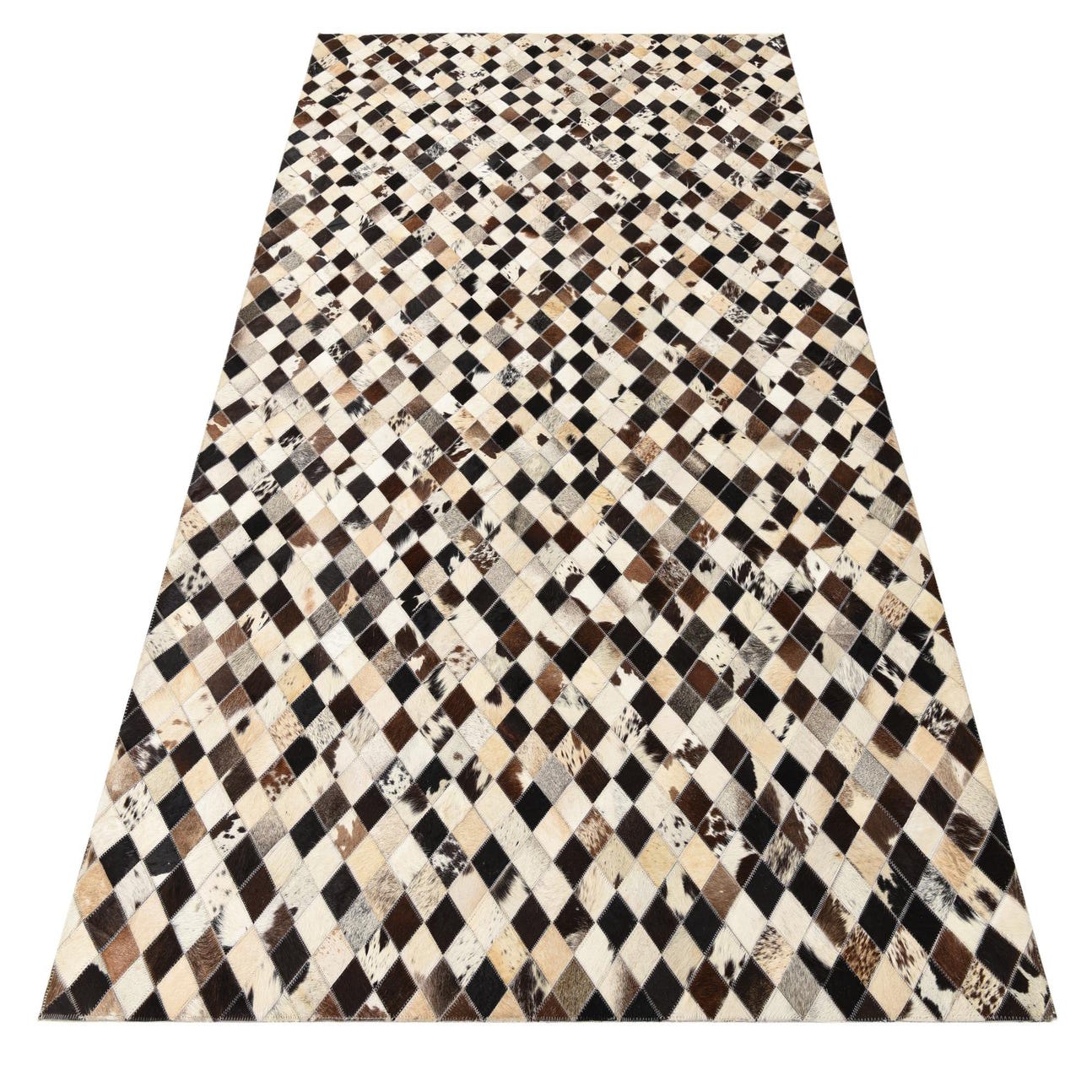This Cowhide Collection rug is a 5x8 handcrafted piece composed of cowhide and leather, offering both durability and tactile appeal. The rug features a harmonious blend of colors including beige, black, brown, ivory, light brown, and gray, set against a multi-colored background which creates a complex yet balanced visual effect. The pattern is characterized by a patchwork of squares, each displaying unique textures and shades due to the natural variation in the hides, giving the rug an organic and intriguing aesthetic.