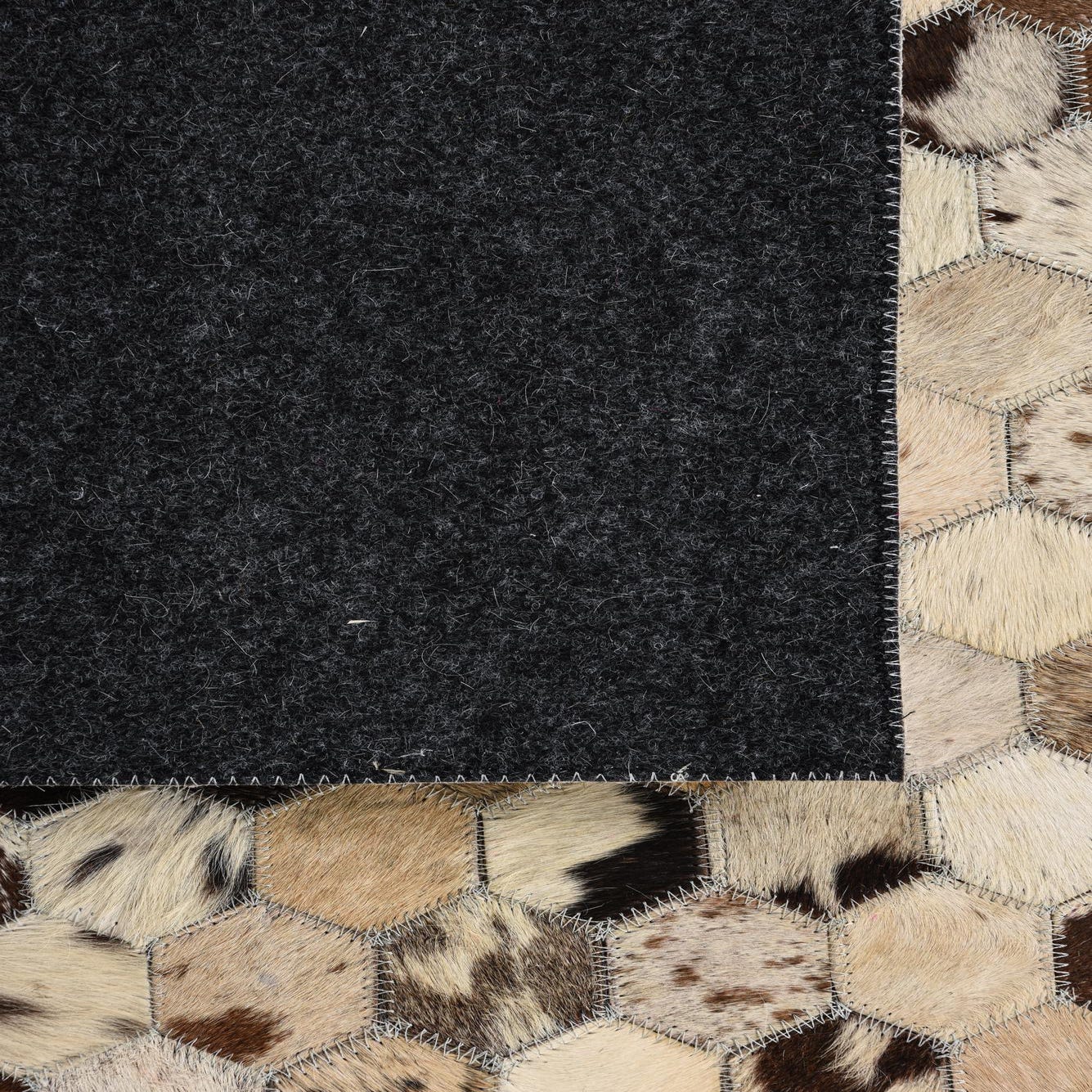 The Cowhide Collection presents a 5x8 hand-crafted rug composed of cowhide and leather, boasting a distinctive mosaic of hexagonal patches. The palette utilizes a harmonious blend of beige, black, brown, and ivory, set against a multi-colored background, which provides versatile compatibility with various interior designs. The unique texture of cowhide lends an organic and tactile allure to the piece, making it a focal point in any room.