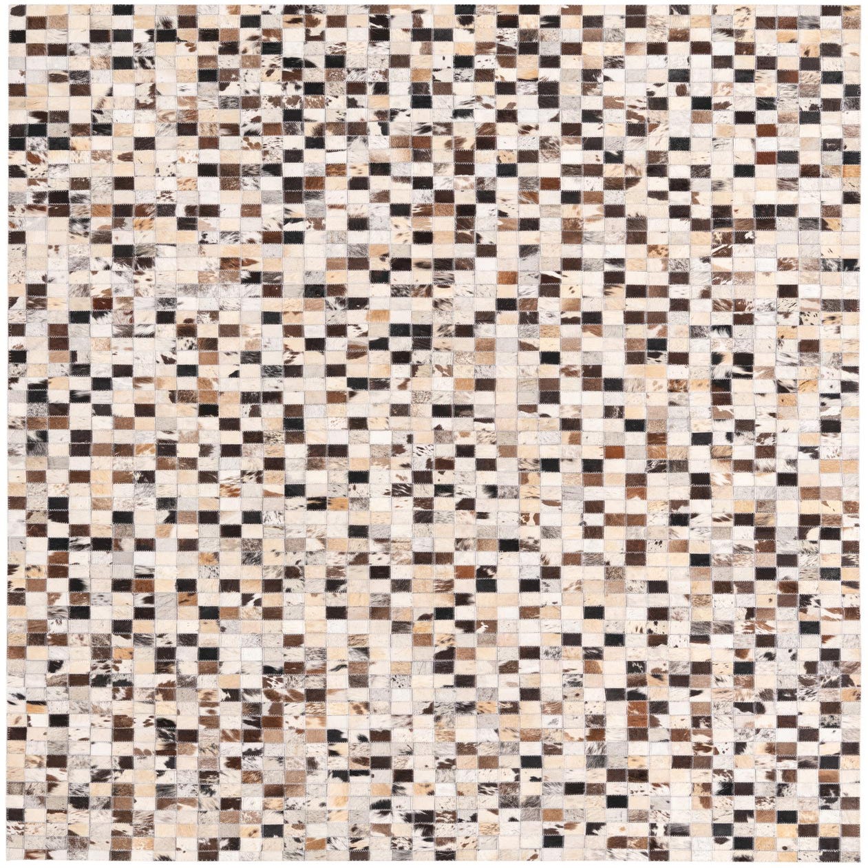 A 5x8 rectangular Cowhide rug featuring a modern patchwork of multi-colored squares in natural brown, black, and cream tones.