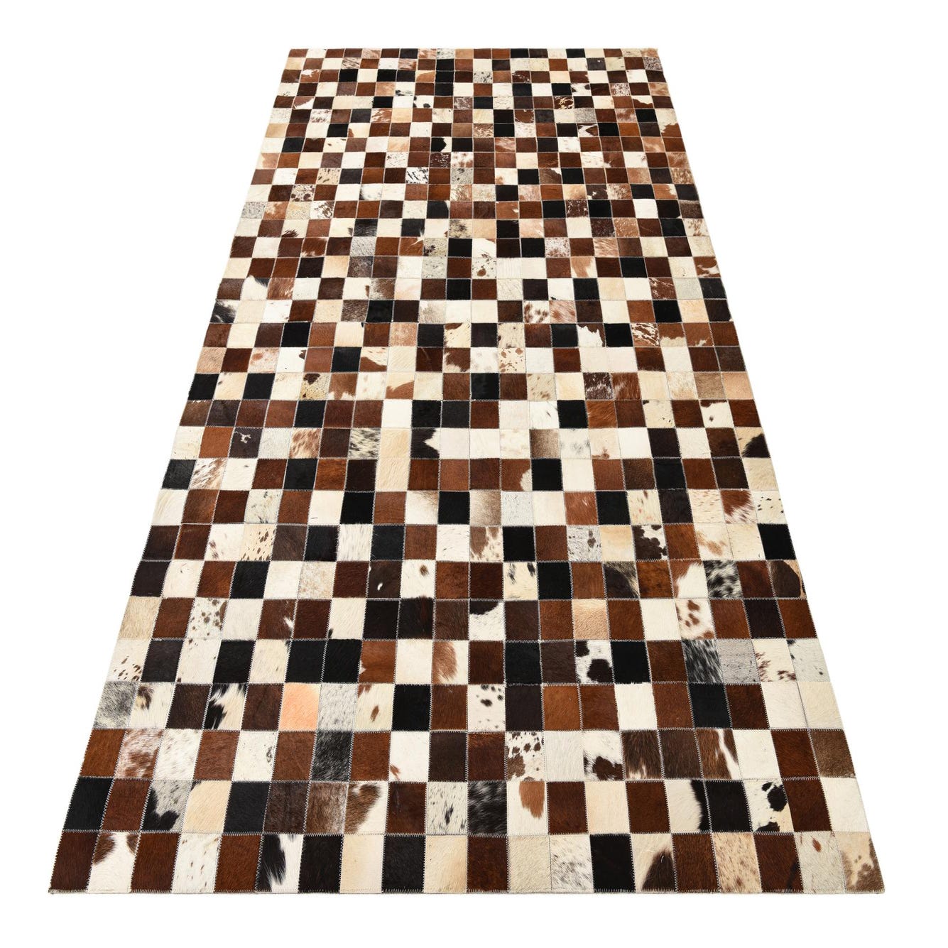 A 5x8 rectangular Cowhide rug featuring a modern patchwork design with multi-colored squares in various brown, black, and white natural cowhide patterns.