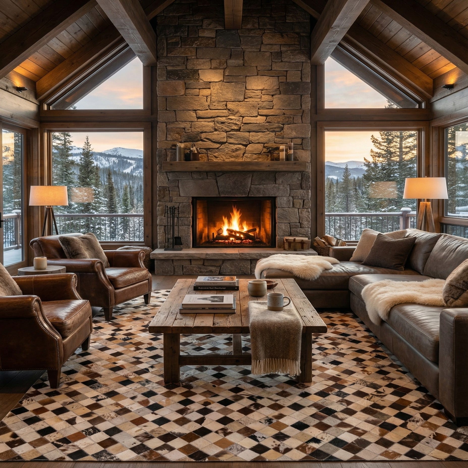 A 5x8 rectangular Cowhide rug featuring a modern multi-colored diamond pattern in shades of brown, black, and white.