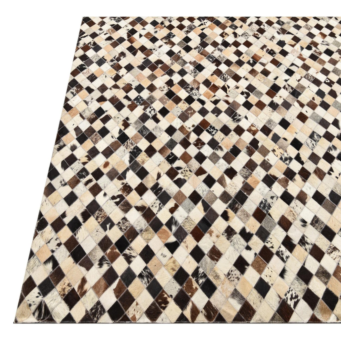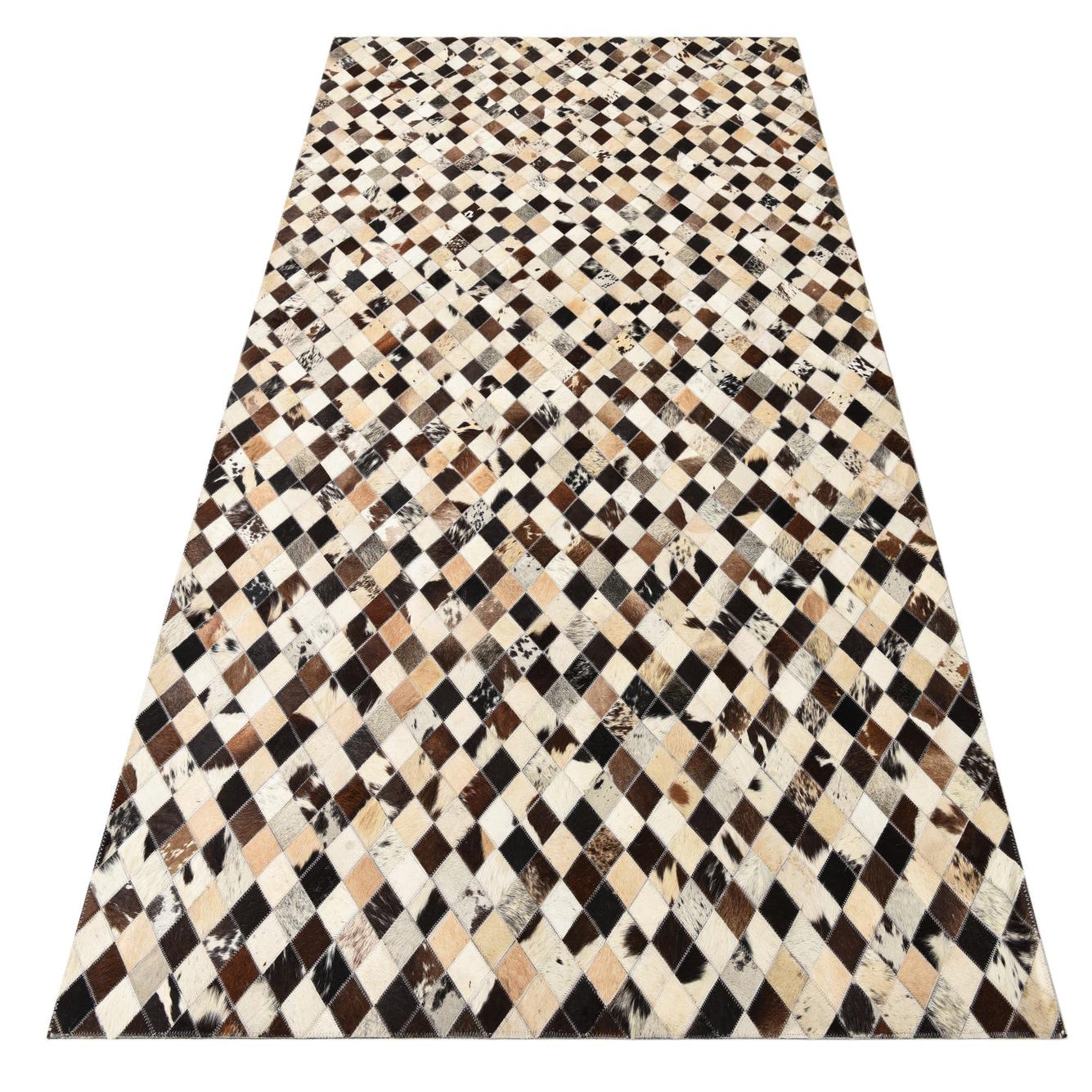 The naturally varied texture gives each rug its own unique character, offering a tactile experience that synthetic materials cannot replicate. The durability of cowhide and leather ensures that this rug is suitable for moderate to high-traffic areas, providing both style and resilience.