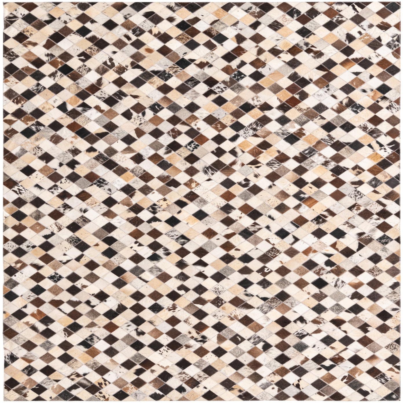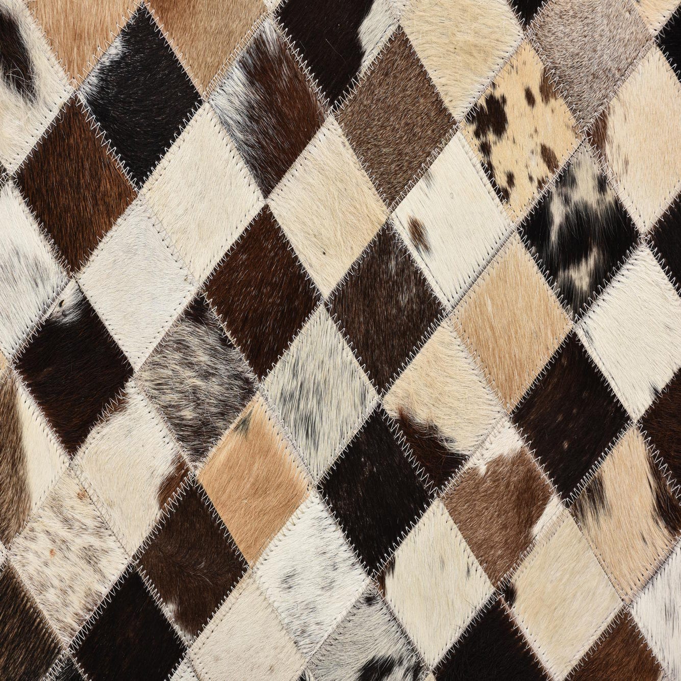 A 5x8 rectangular modern cowhide rug featuring a multi-colored patchwork diamond pattern in shades of brown, black, and cream.