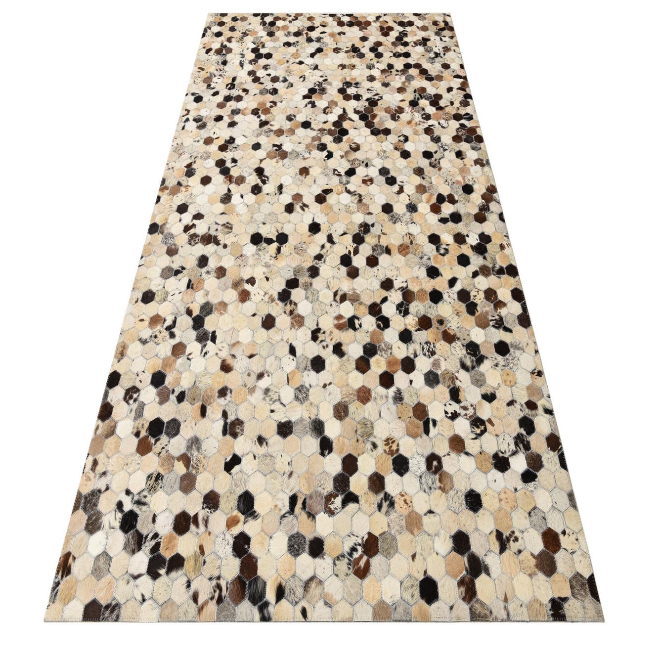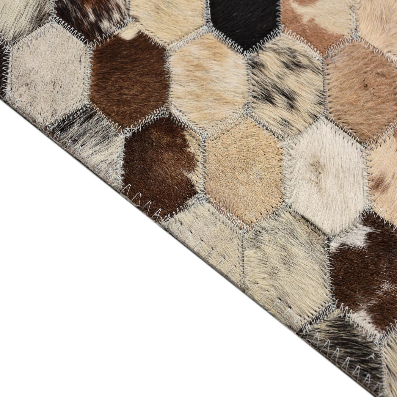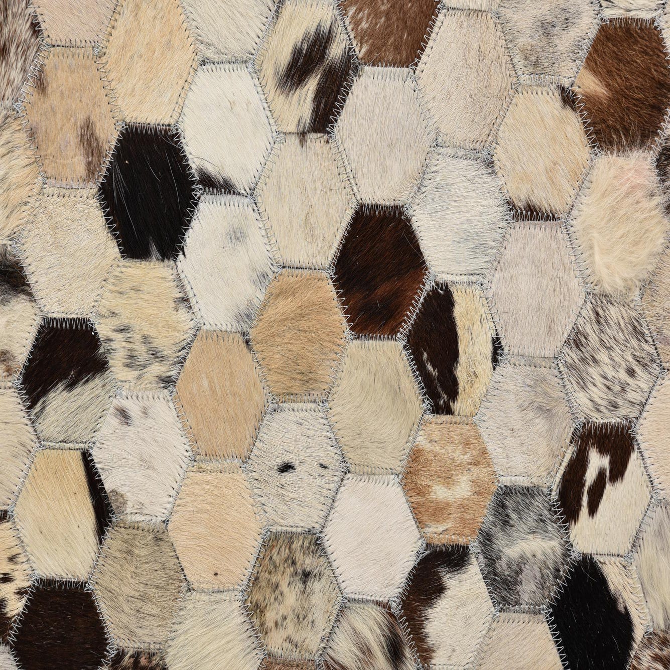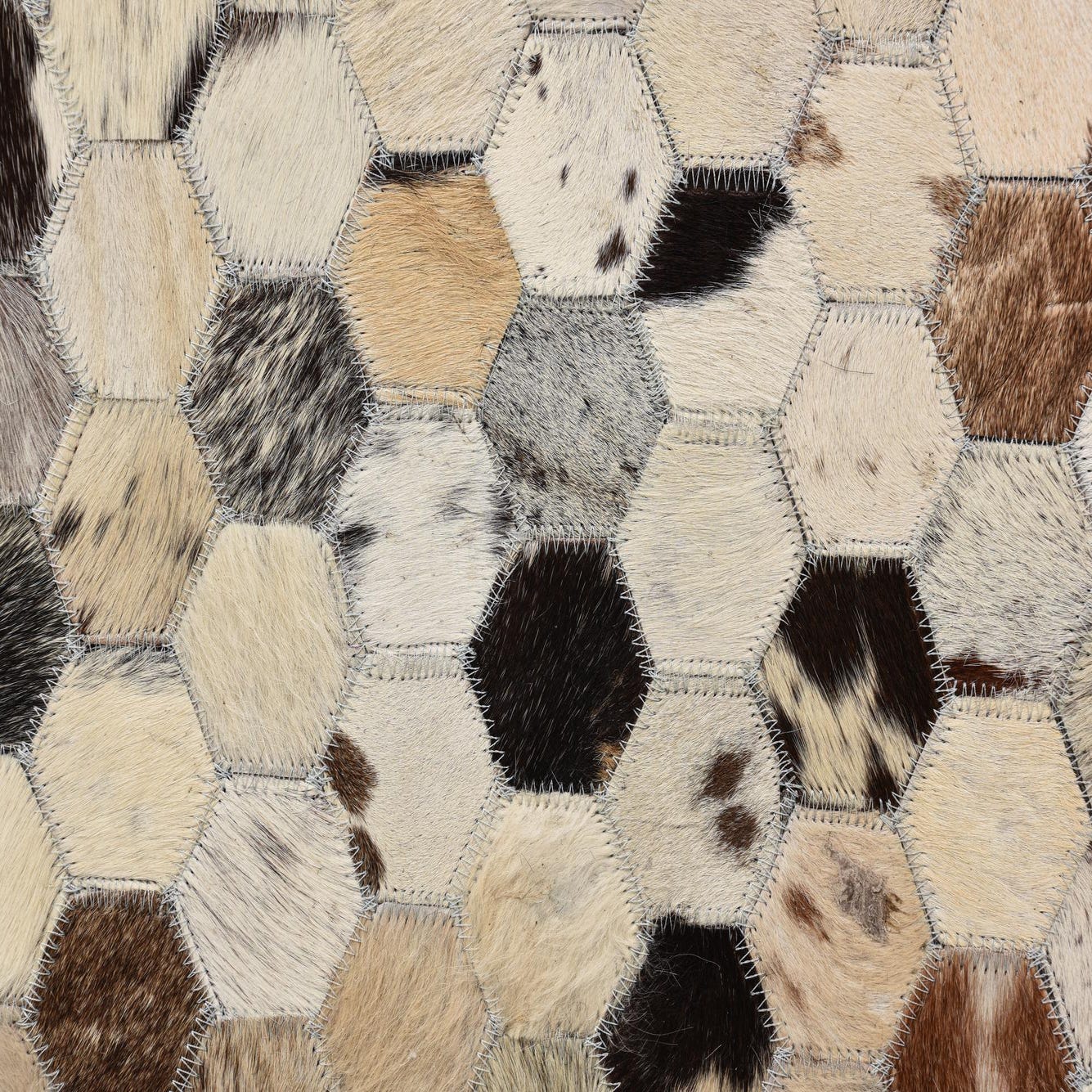 The Cowhide Collection presents a hand-crafted 5x8 rug made of premium cowhide and leather. This rug boasts a unique pattern composed of hexagonal patches that seamlessly blend various hues including beige, black, brown, gray, ivory, and cream. The multi-toned background provides an appealing texture and a sophisticated yet natural mosaic appearance.