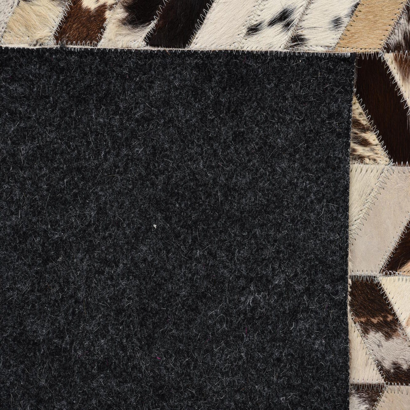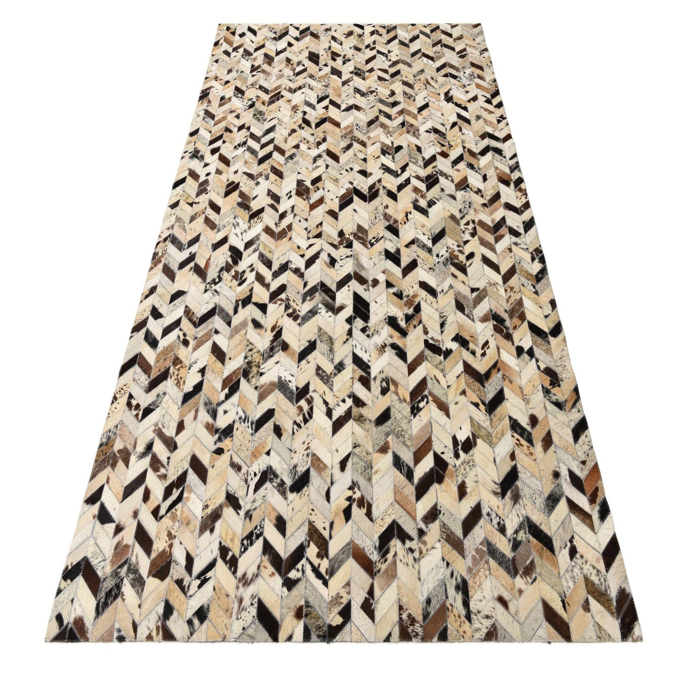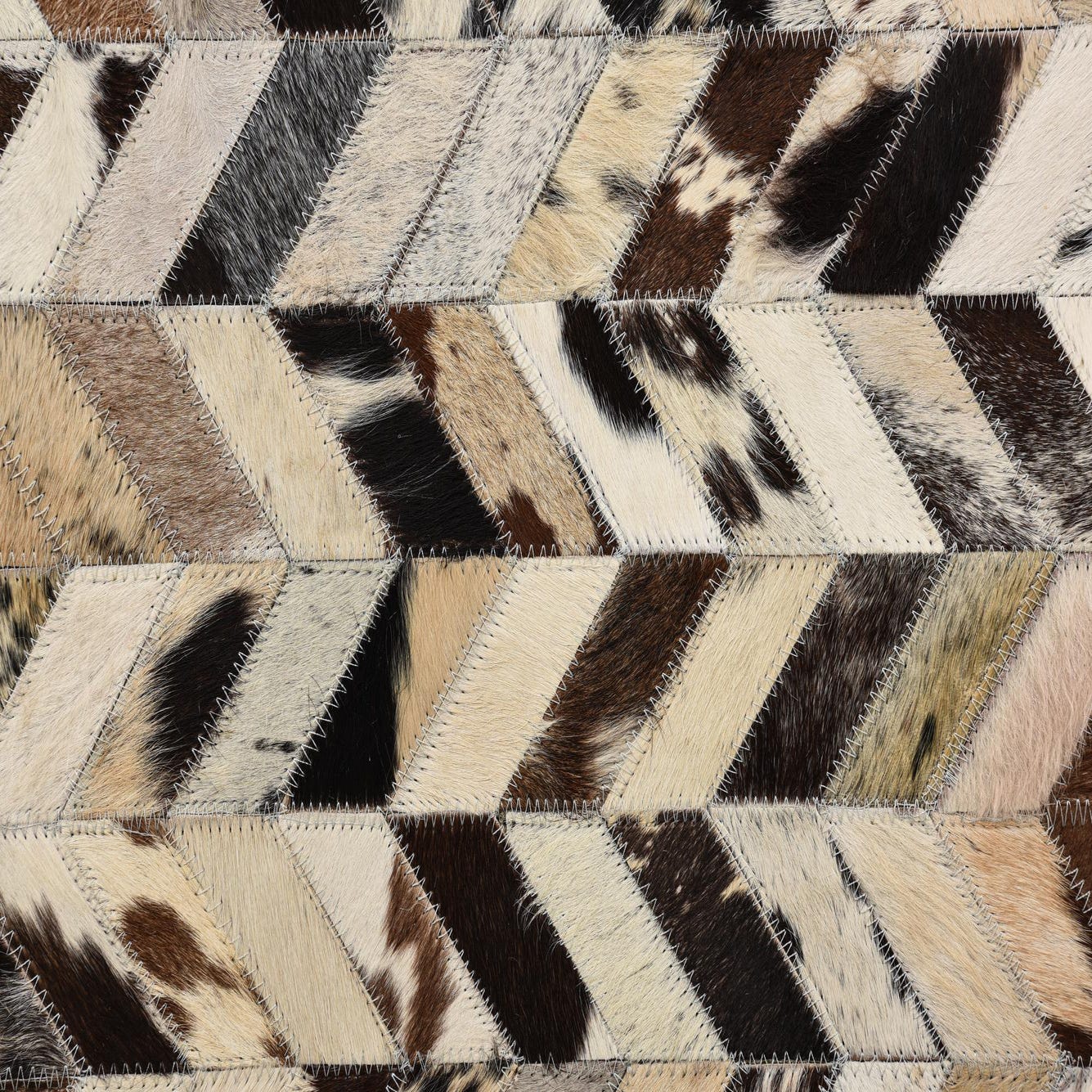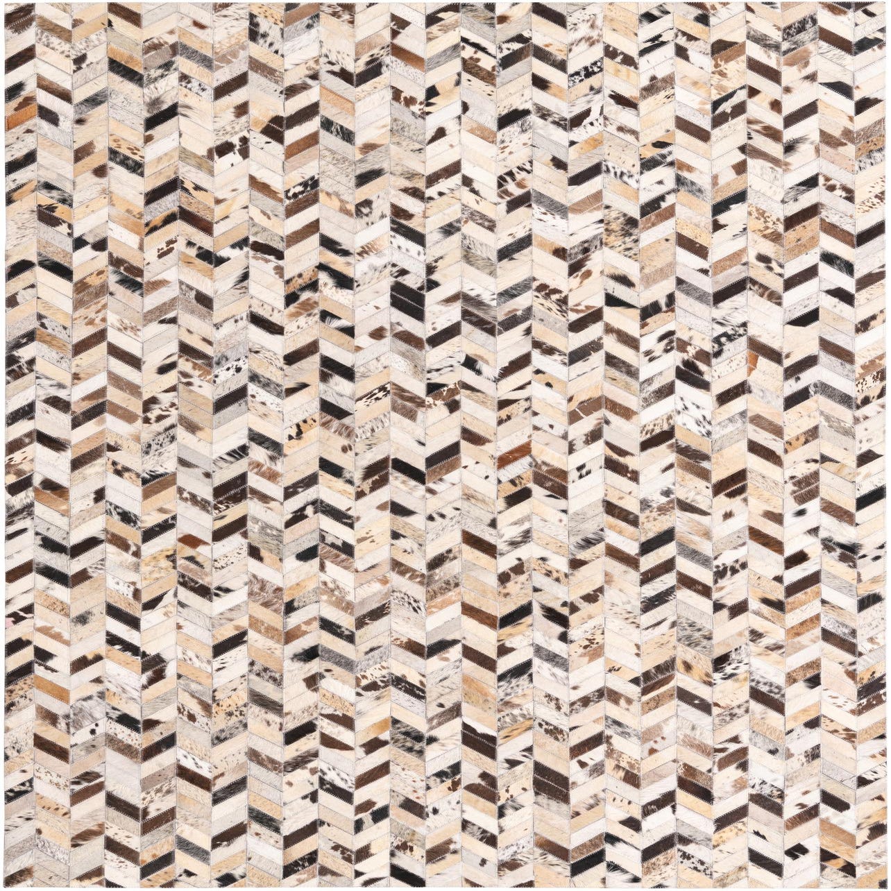 Hand made of cowhide and leather, this rug arranges narrow hair-on-hide patches into a tight chevron pattern that reads like a modern herringbone. The multi background blends beige, cream, ivory, gray, brown and black in a lively, natural mix. Running seams and the short, tactile hair create a subtle sheen and a textured surface you can feel underfoot, while the mottled markings of each hide add organic speckling and linear accents across the field.