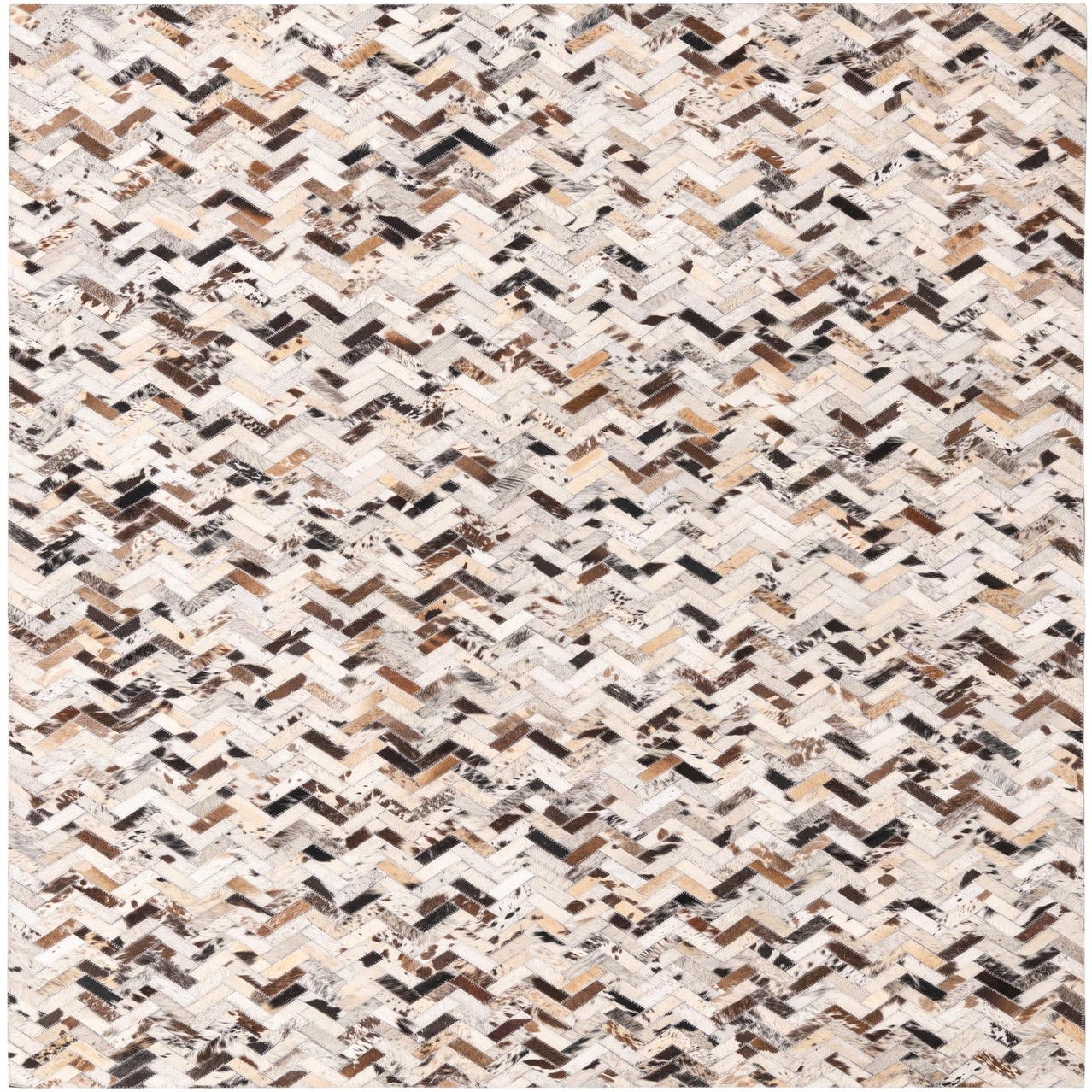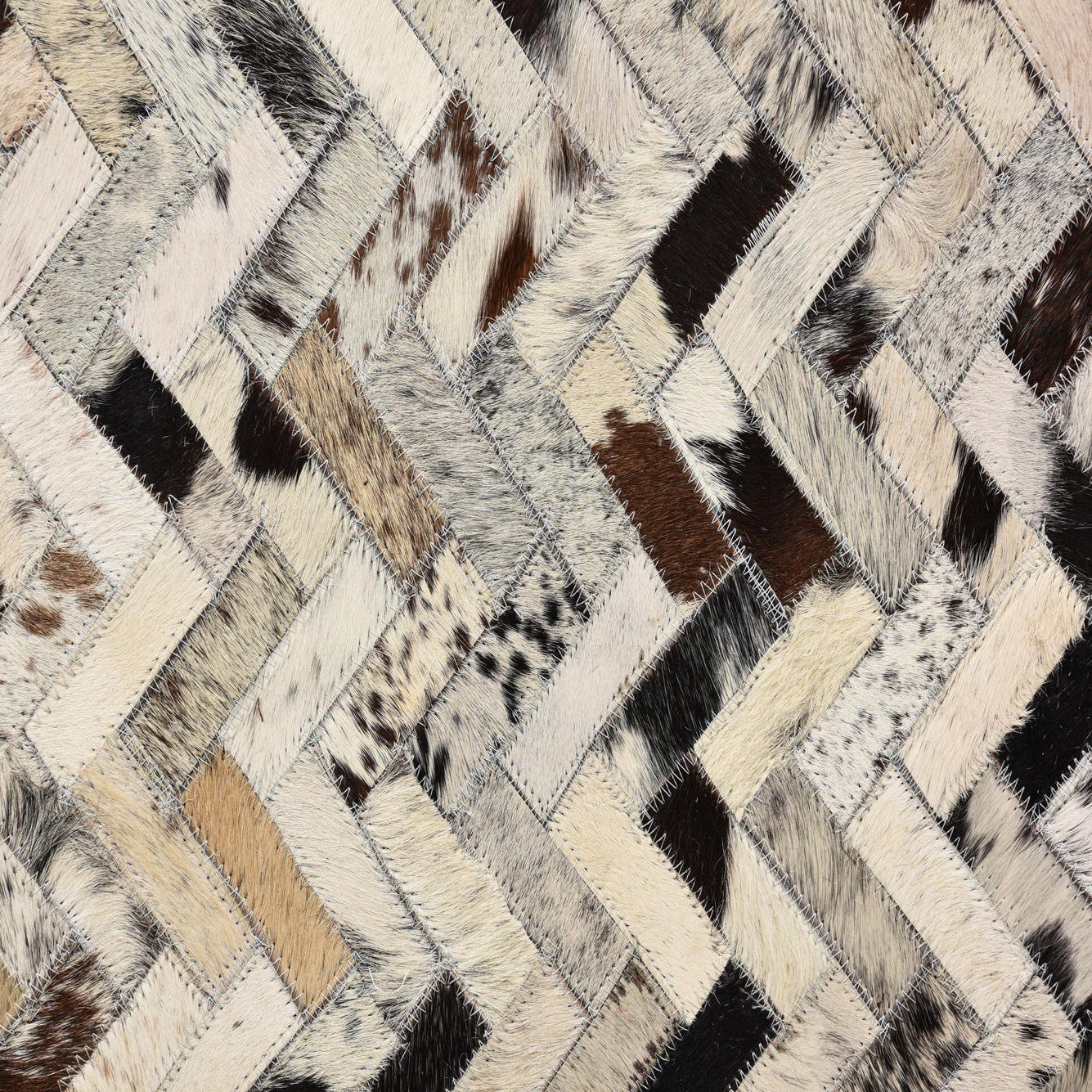 A 5x8 rectangular Cowhide rug featuring a modern multi-colored herringbone pattern in various shades of brown, black, and white.