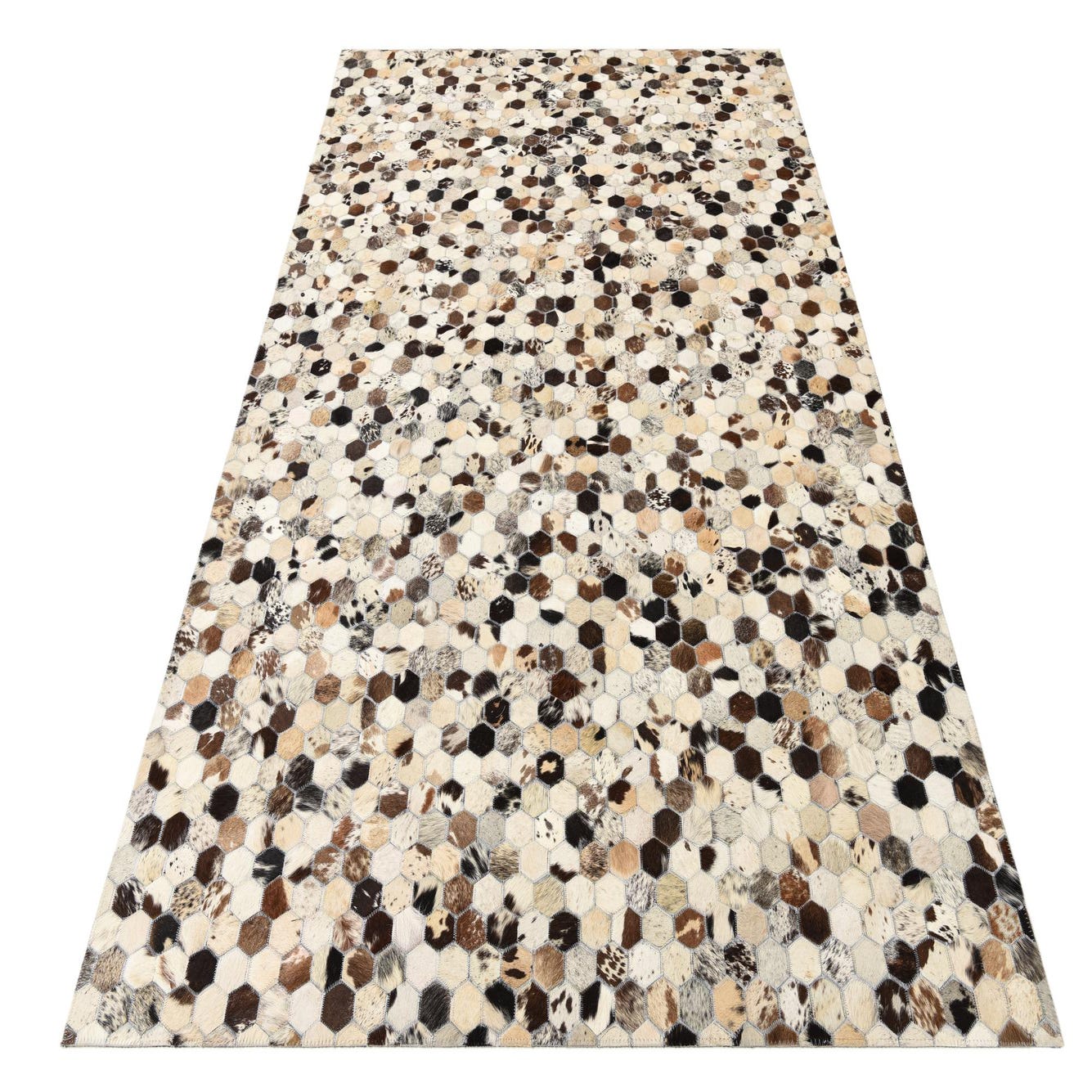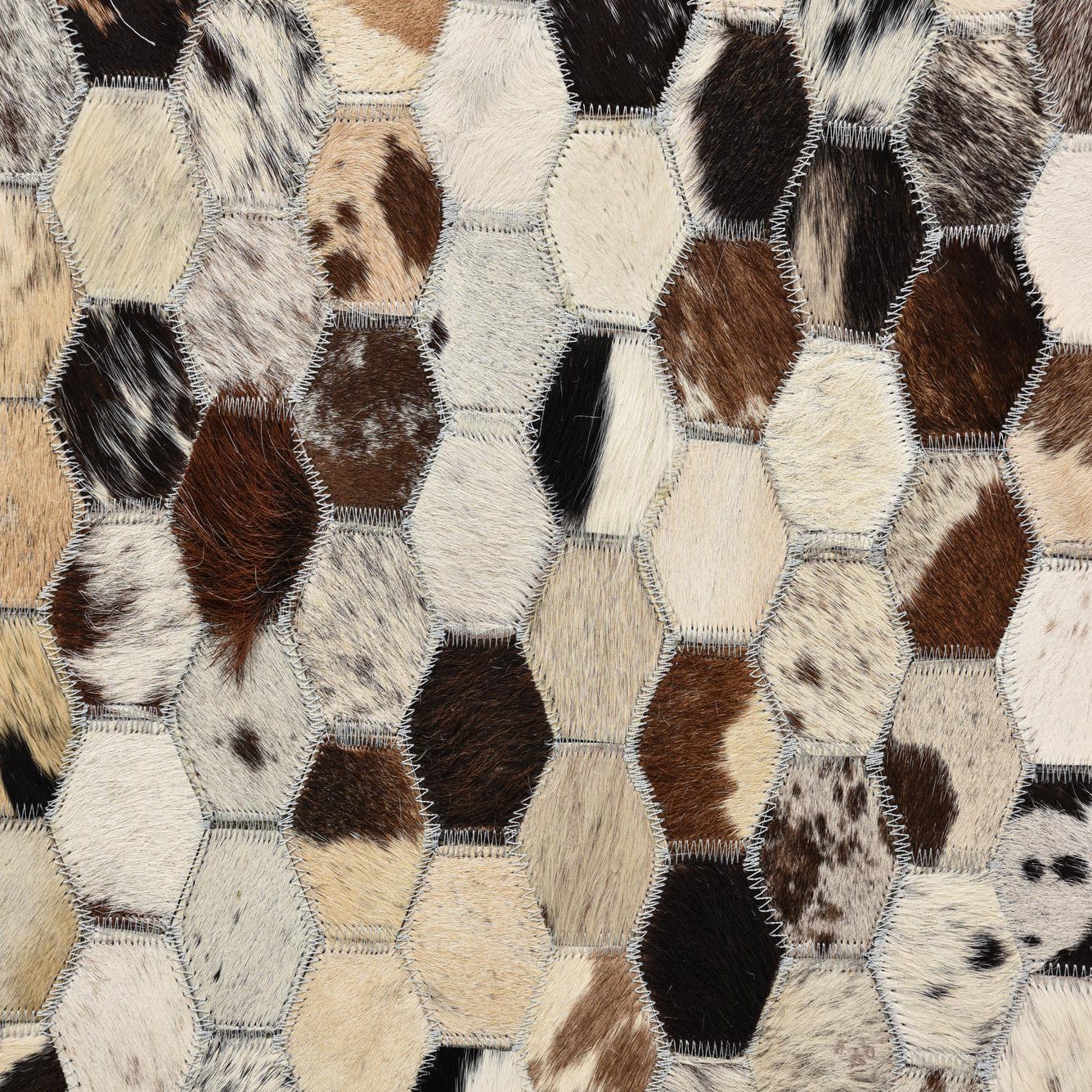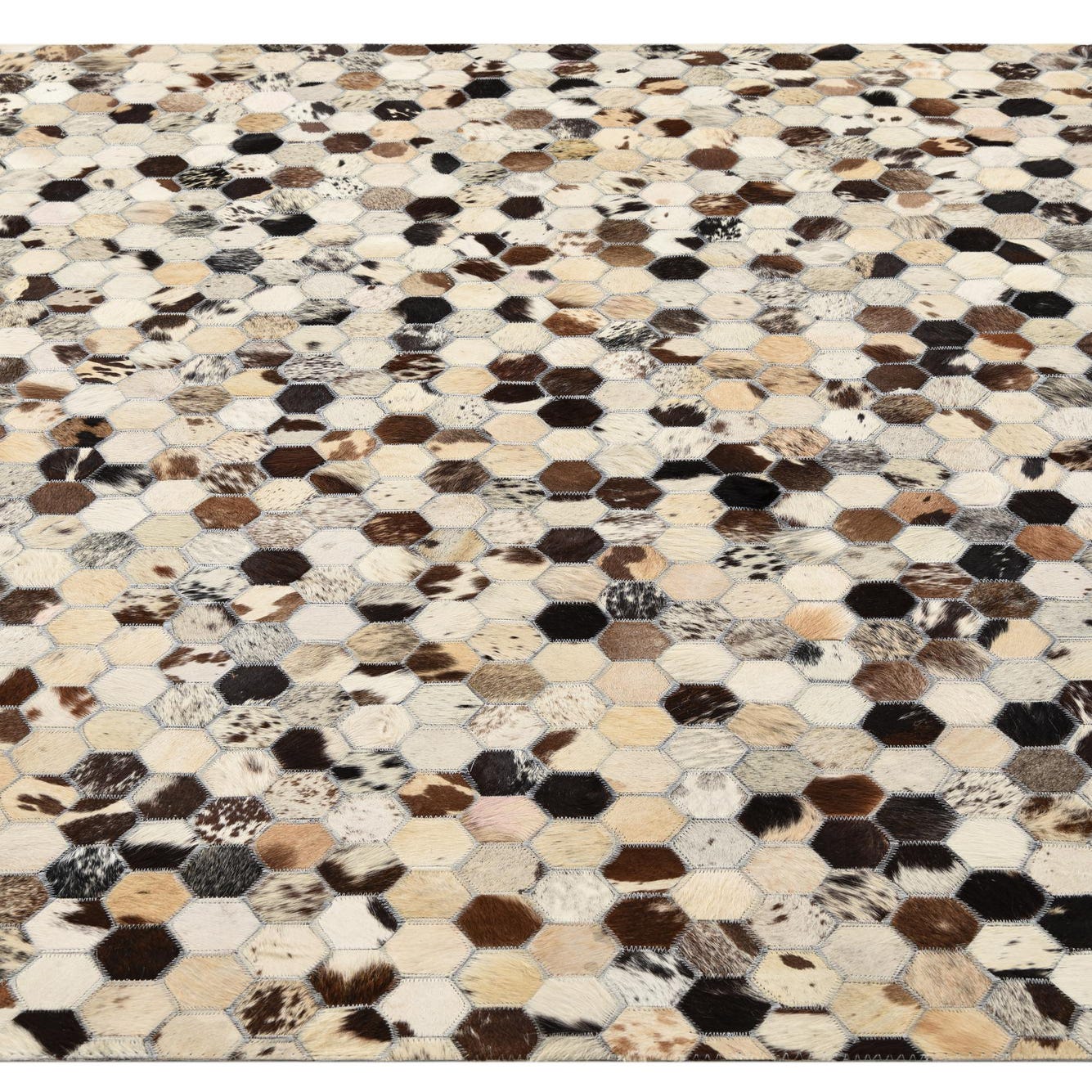 A 5x8 rectangular rug featuring a modern mosaic pattern of multi-colored hexagonal cowhide and leather patches.