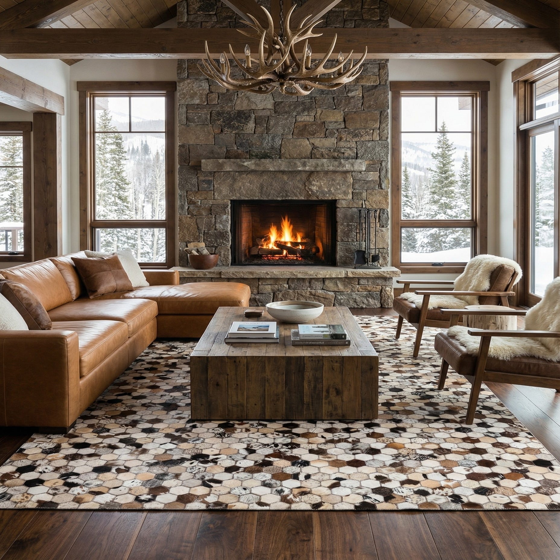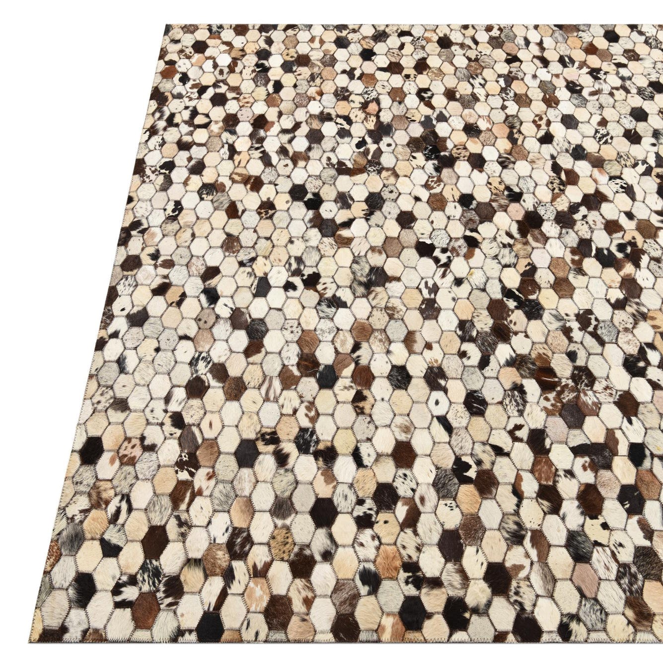 A 5x8 rectangular Cowhide rug featuring a modern honeycomb pattern in multi-colored natural cowhide and leather patches.