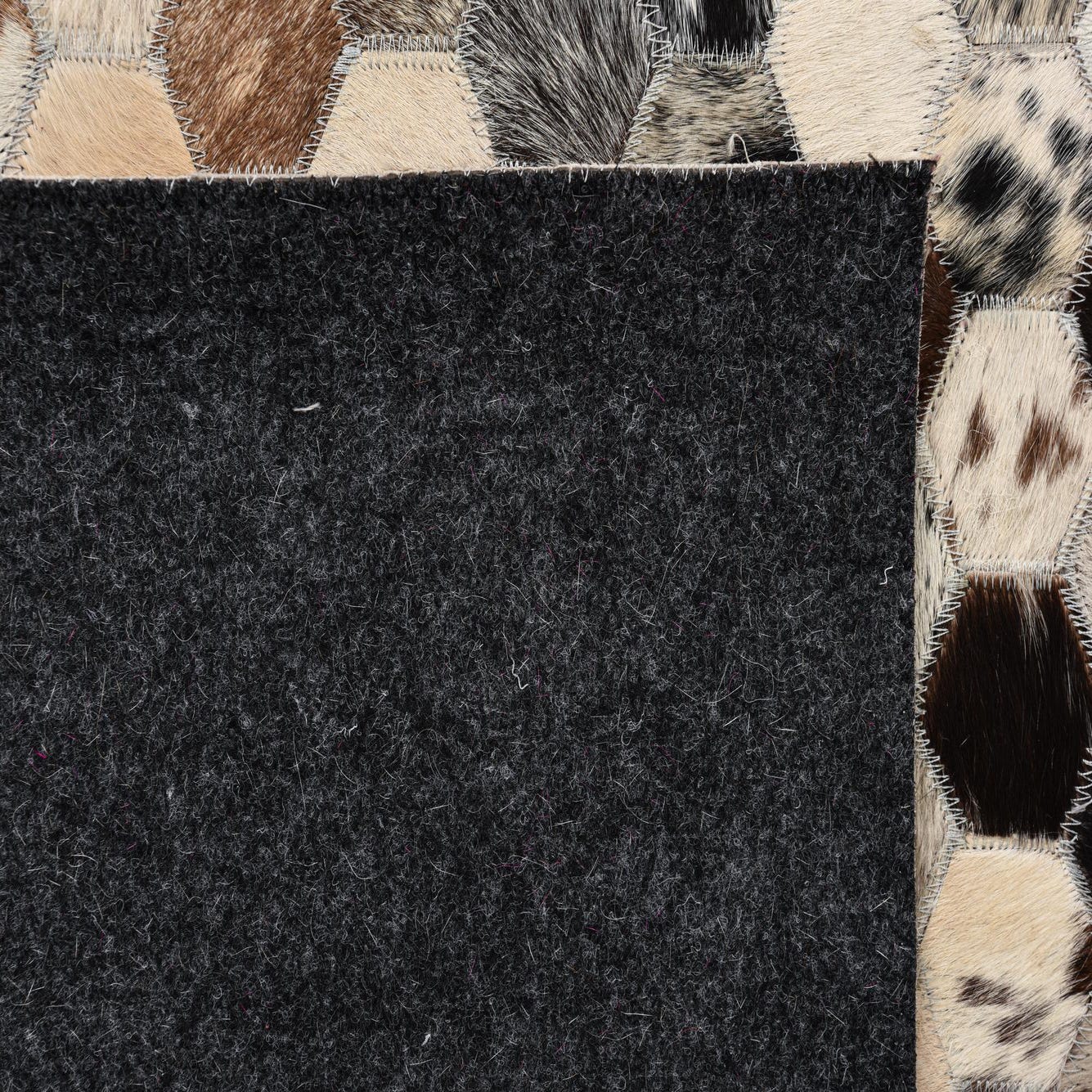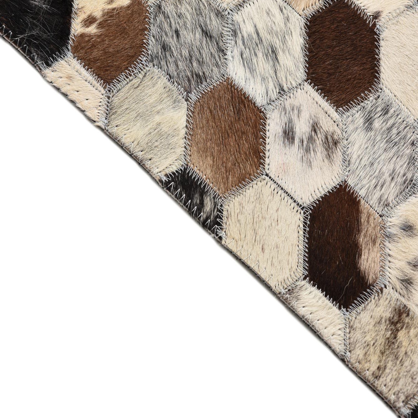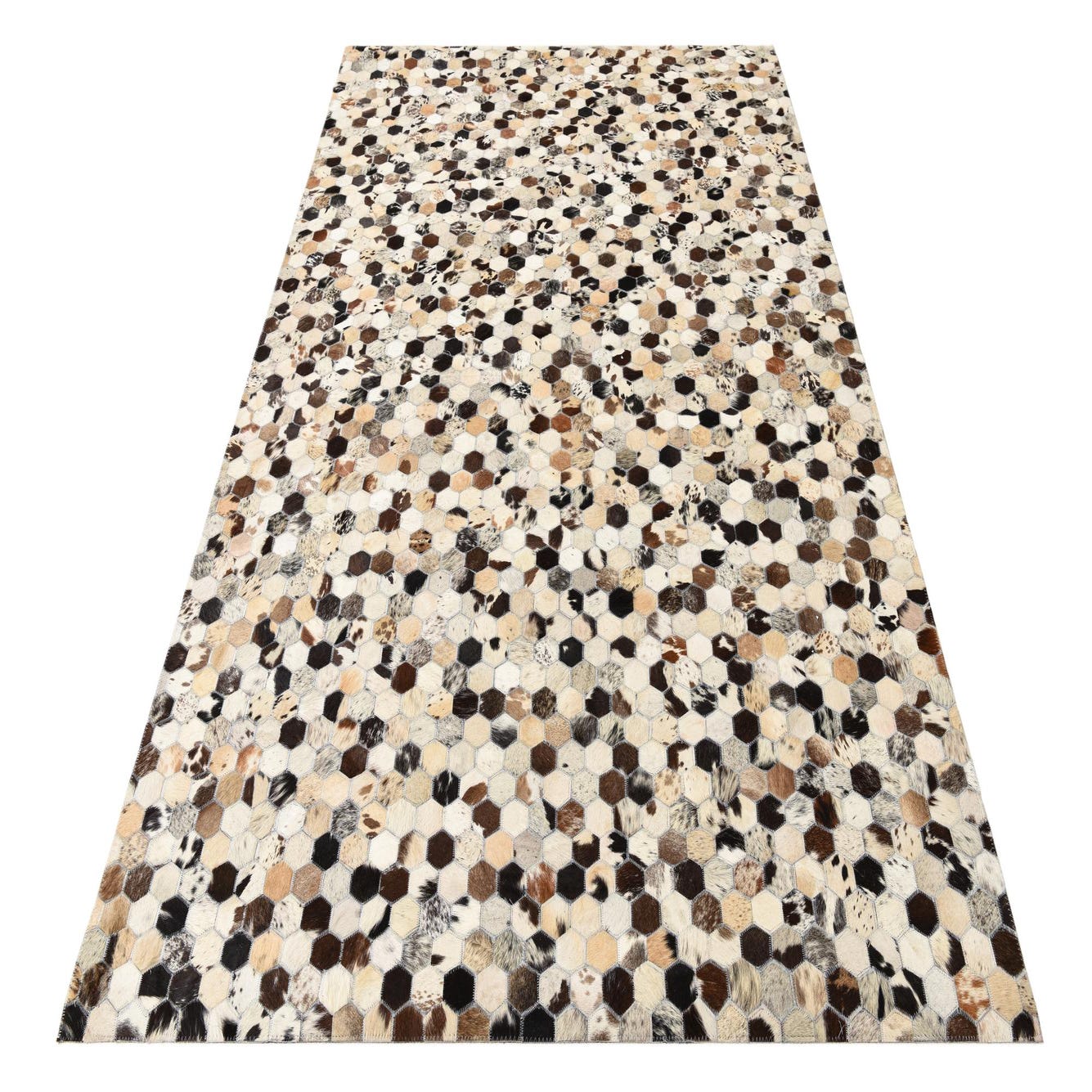 A 5x8 rectangular Cowhide rug with a modern hexagonal pattern in multi-colored natural tones of brown, black, and white.