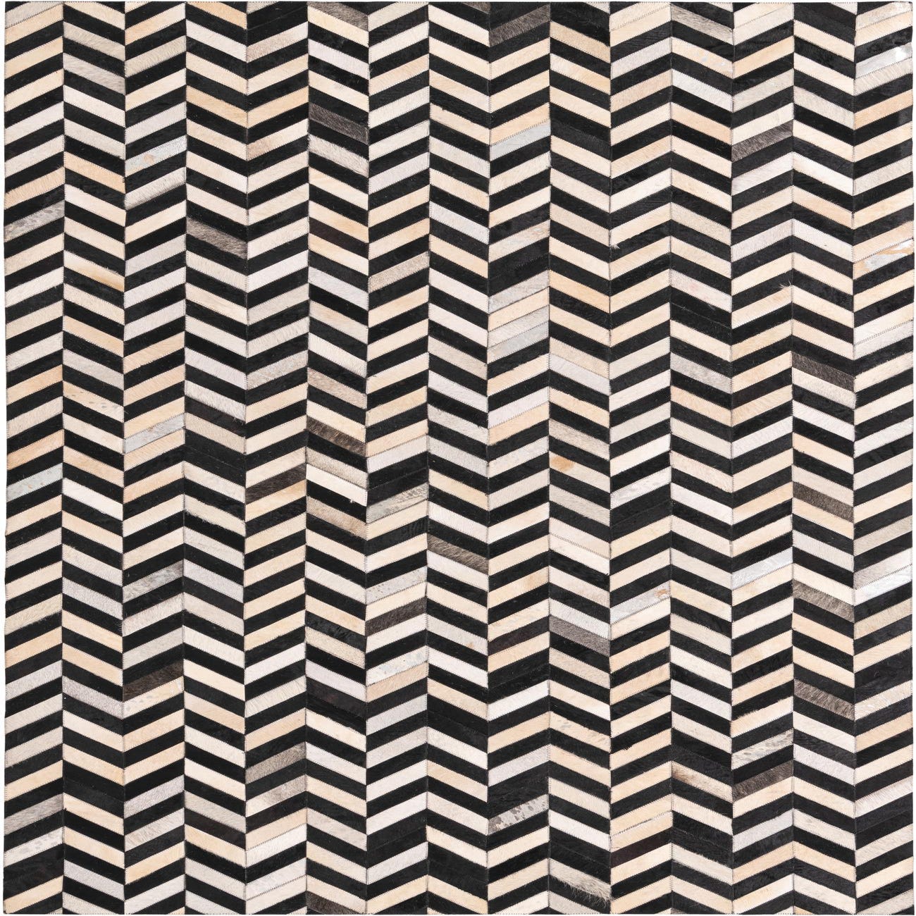 A 5x8 rectangular Cowhide rug with a modern chevron stripe pattern in black, white, and natural hide tones.
