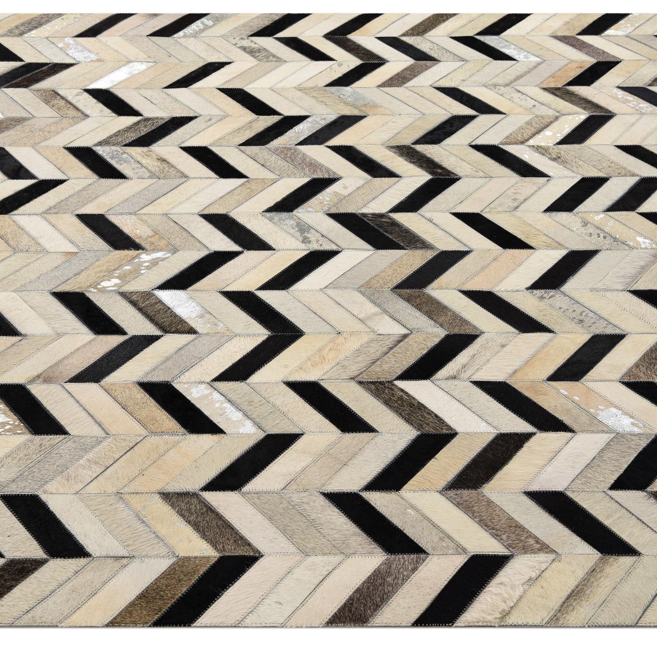 A 5x8 rectangular Cowhide rug featuring a modern chevron stripe pattern in multi-colored natural tones and black.