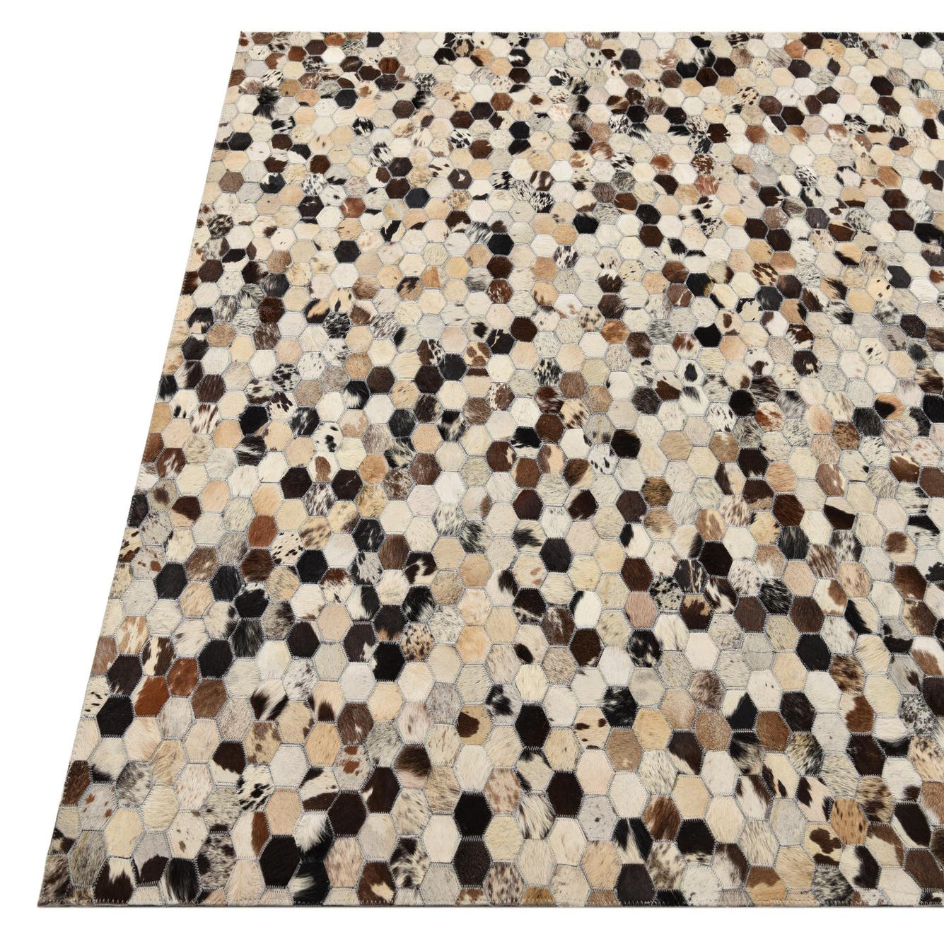 A 5x8 rectangular Cowhide Leather rug featuring a modern honeycomb pattern in multi-colored natural cowhide patches.