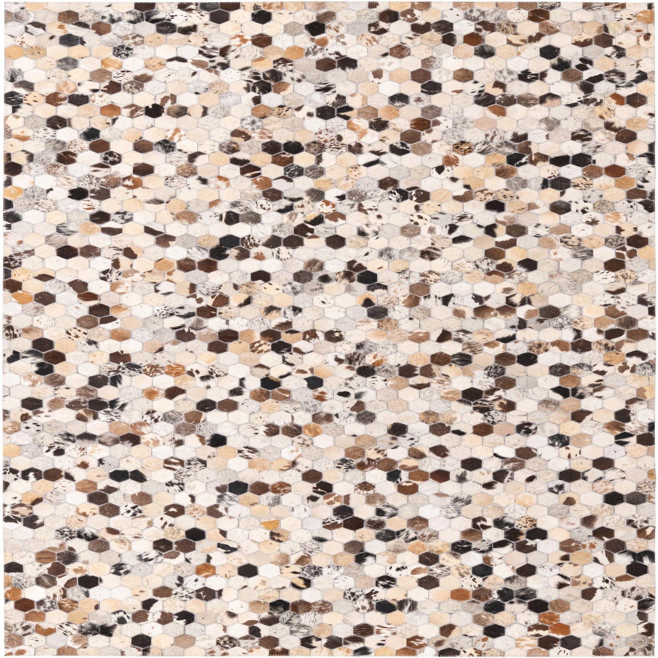 This Cowhide Leather Collection area rug presents a sophisticated mosaic of hexagonal patches in a dynamic arrangement, tailored from genuine cowhide and leather. Measuring 5x8, this handcrafted piece features a diverse color palette that includes beige, black, brown, gray, ivory, and cream, set against a multi-colored background. The natural variation in tones and textures enhances the rug's tactile appeal and individuality while providing an earthy warmth.