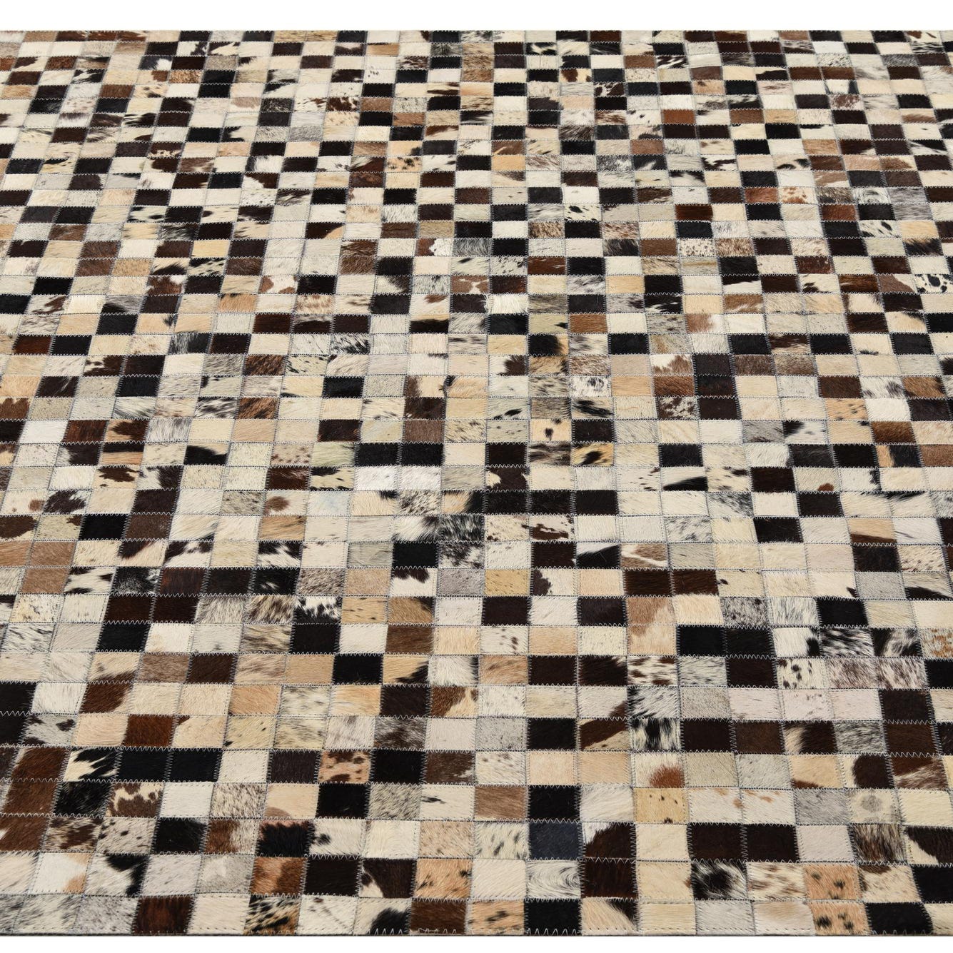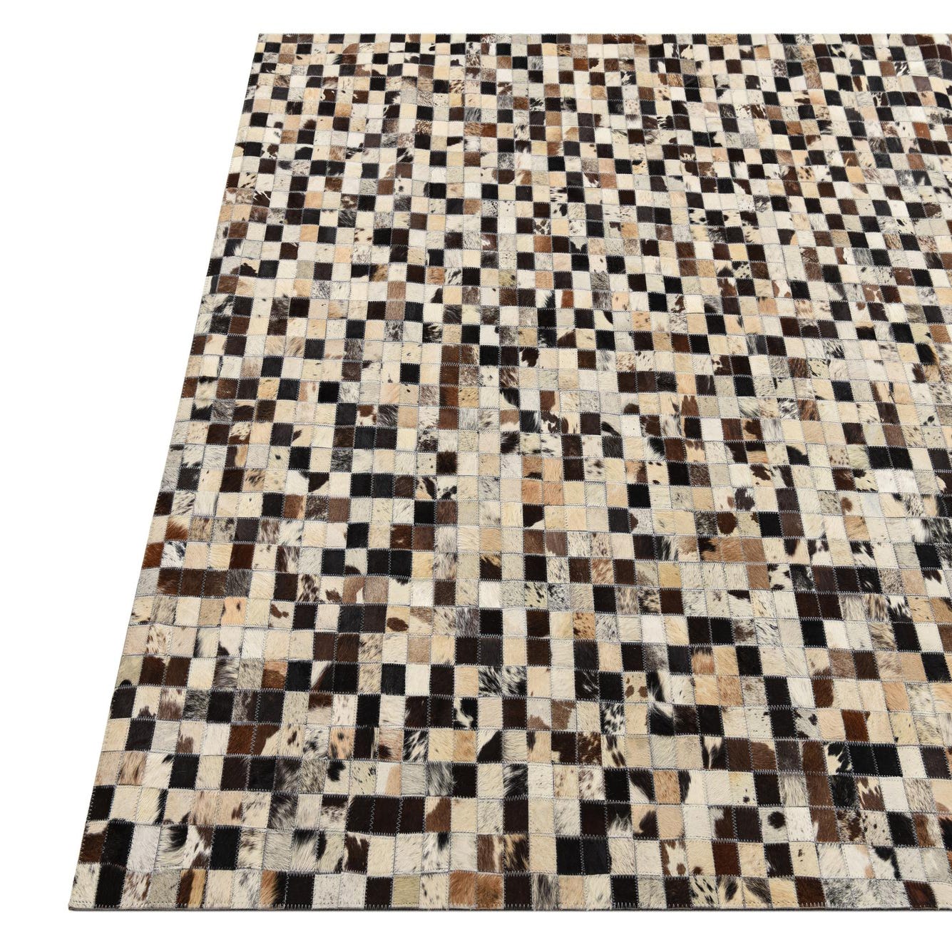 A 5x8 rectangular Cowhide Leather rug featuring a modern, multi-colored patchwork design with varying shades of brown, black, and cream squares.