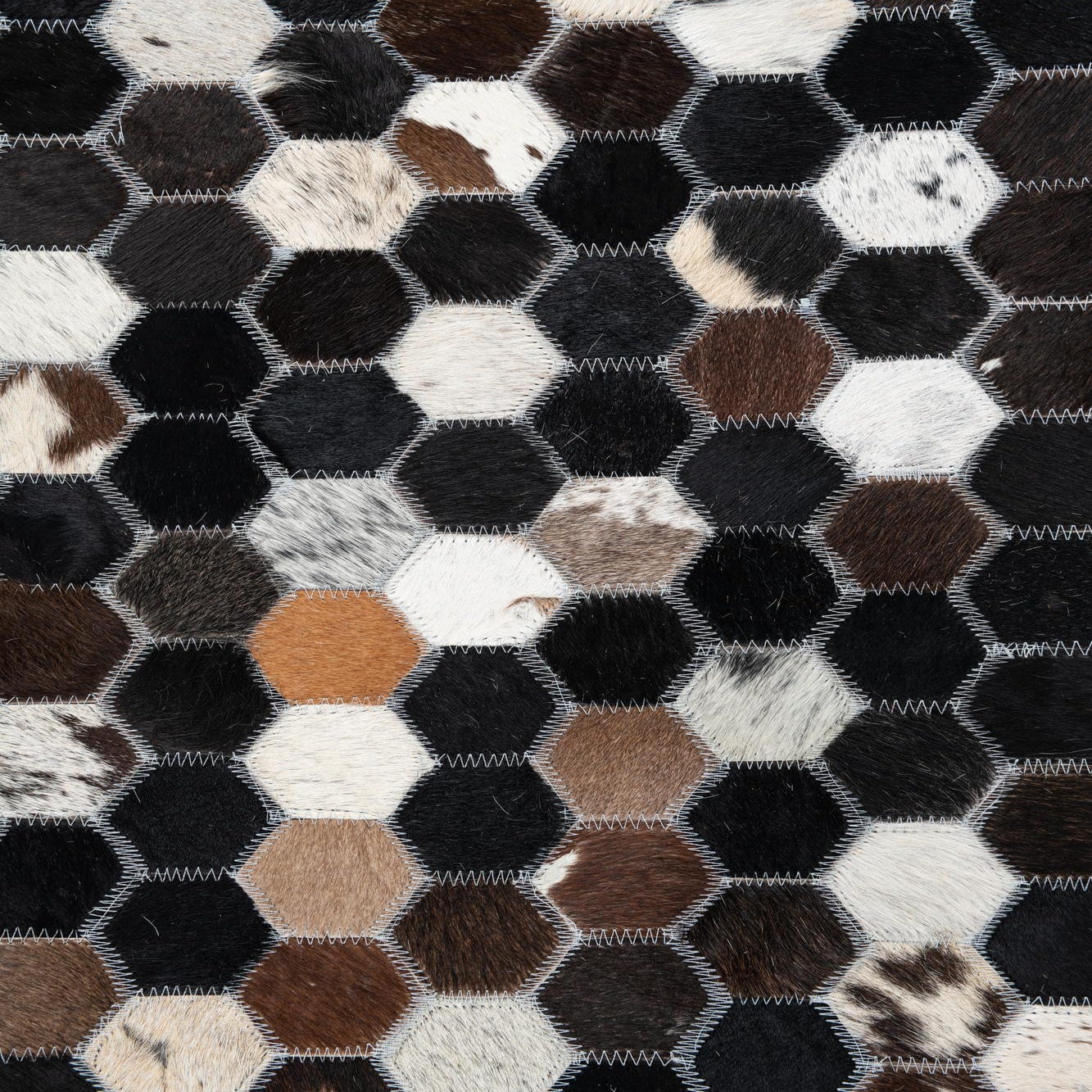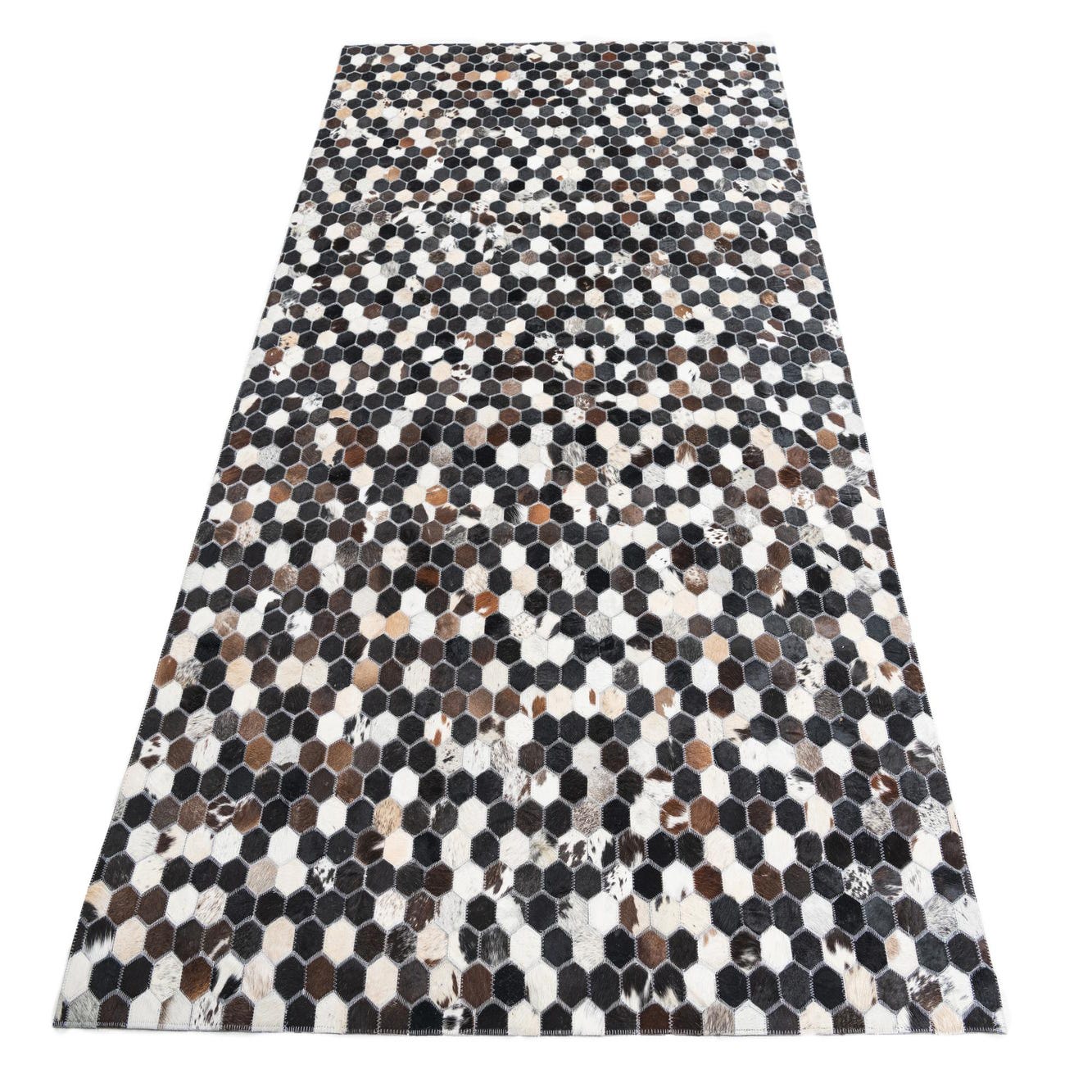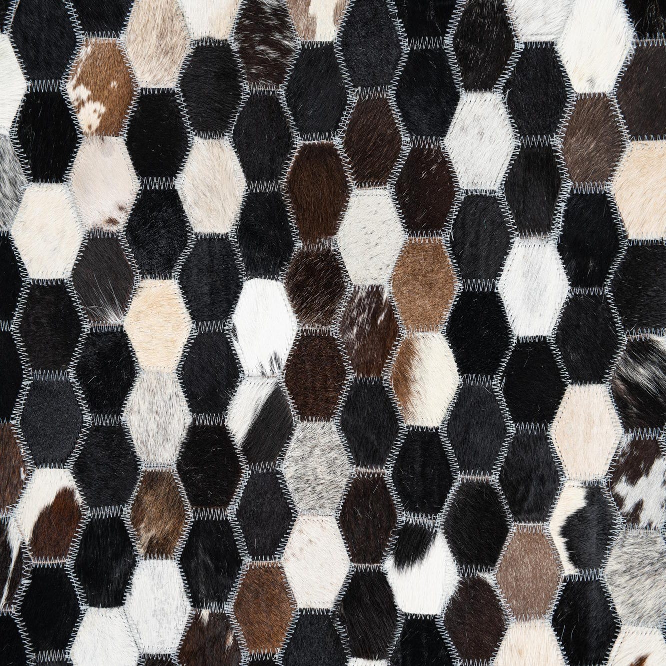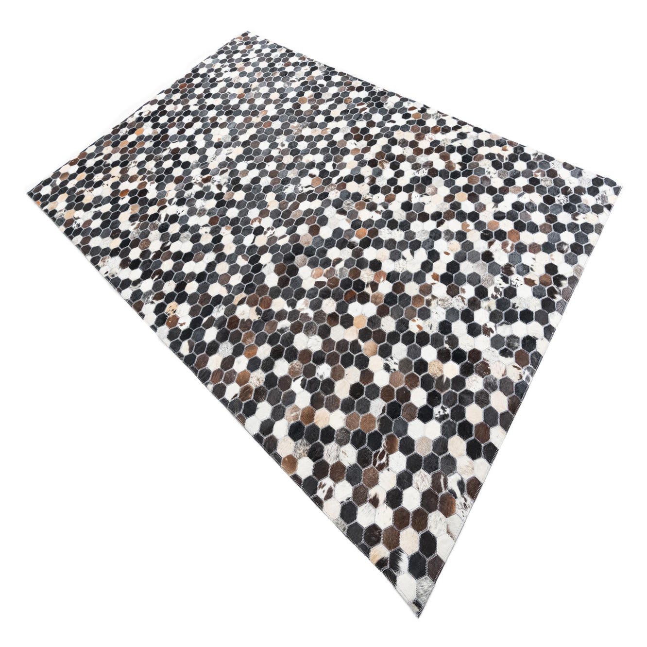 A 5x8 rectangular Cowhide Leather rug featuring a modern multi-colored hexagonal patchwork pattern in black, white, and brown tones.