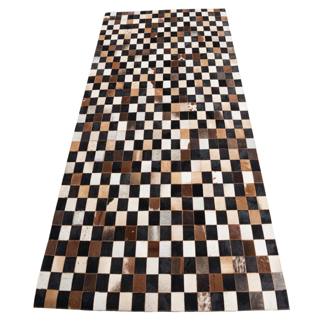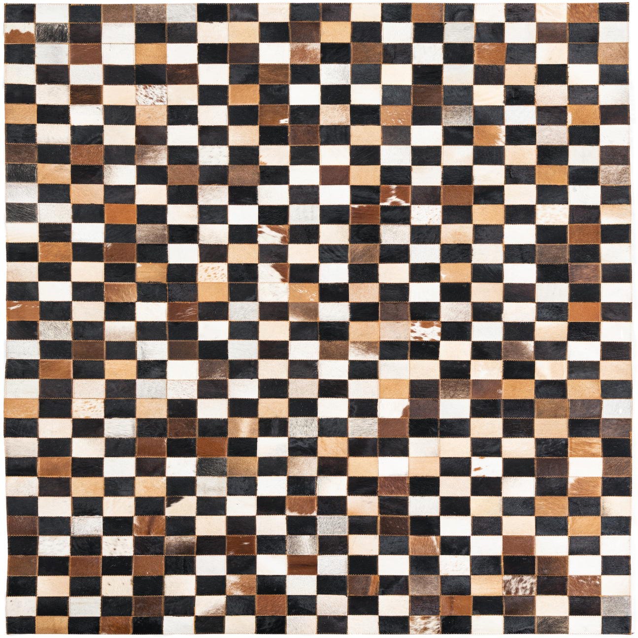 A 5x8 rectangular Cowhide Leather rug featuring a modern checkered pattern in multi-colored patches of black, white, and various brown tones.